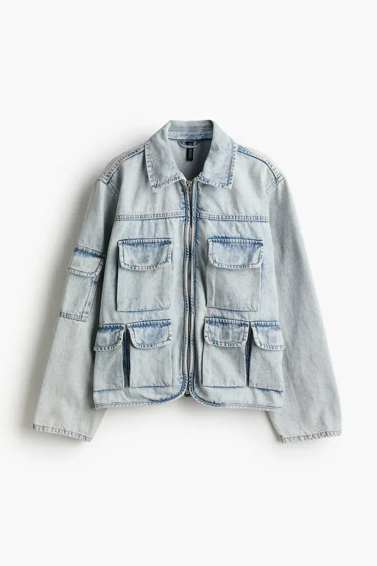 Veste utilitaire ample en denim de coton rigide. Col, fermeture éclair devant et empiècement dos. Épaules descendues et manches longues. Poches poitrine à soufflet, poches avant à double soufflet avec rabat et fermeture auto-agrippante et poche à soufflet avec rabat sur la manche.