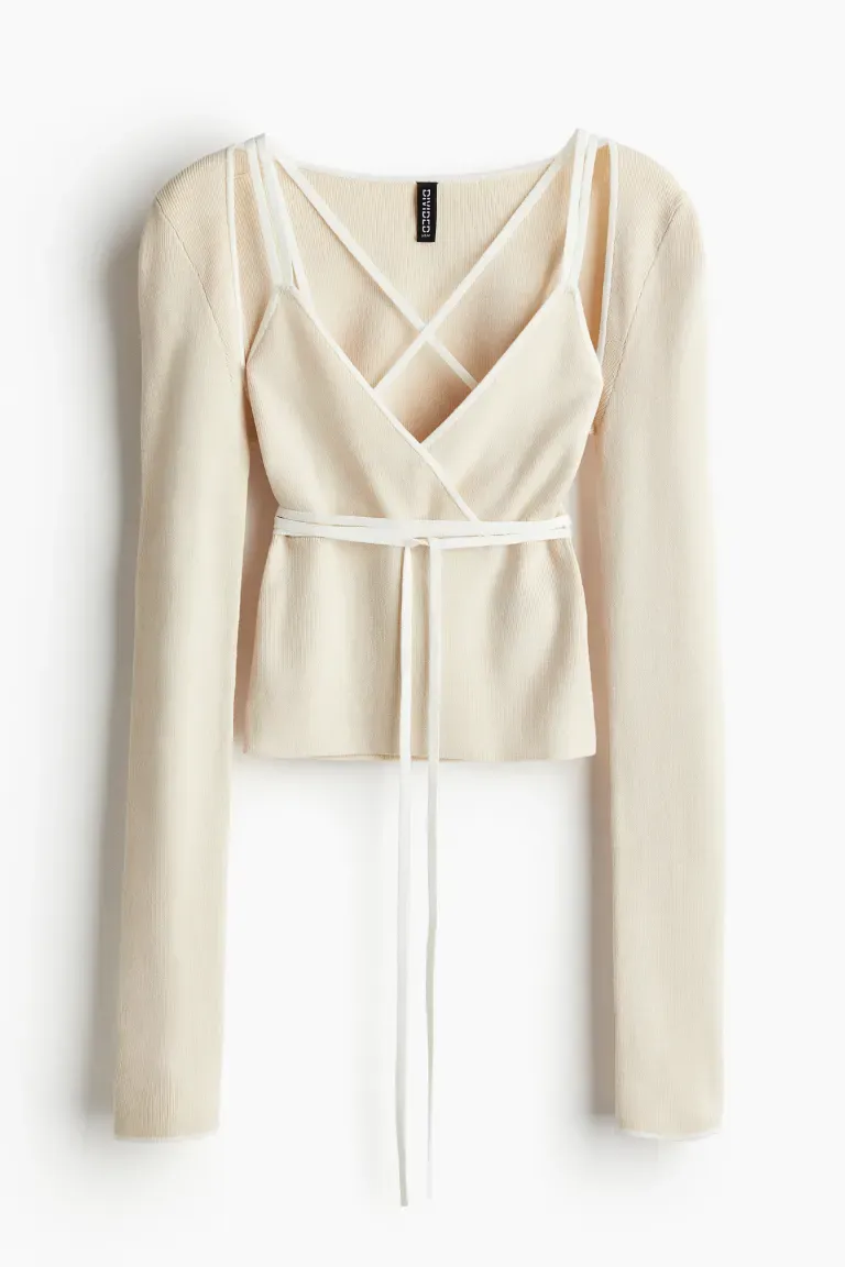 Le style décontracté rencontre l'esthétique du balletcore dans cet ensemble en maille côtelée fine comprenant un boléro et un haut à bretelles. Boléro ajusté à manches longues. Top à bretelles avec doubles bretelles, une paire croisée dans le dos, une encolure en V et une partie cache-cœur devant. Ceinture fine à nouer à la taille.