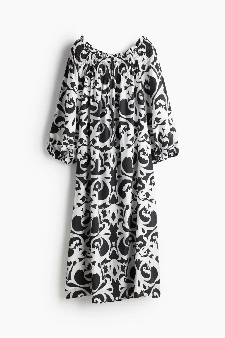 Robe longue oversize à épaules dénudées en tissu tissé. Larges smocks et fine bordure à volants sur le dessus. Manches longues ballon avec poignets élastiqués. Sans doublure.