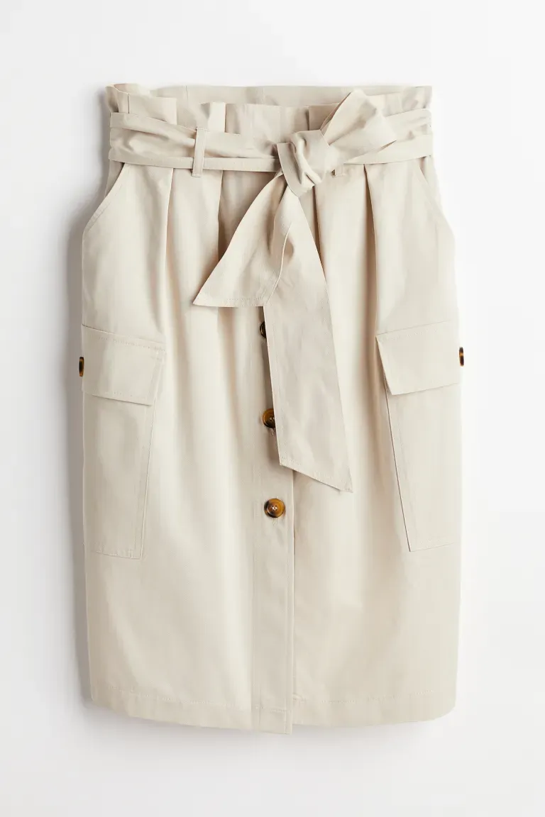 Jupe longueur genou en tissu tissé. Taille paper bag avec plis sur le devant et ceinture à nouer amovible. Boutons sur le devant, poches latérales en diagonale et poches plaquées à rabat et bouton. Sans doublure.