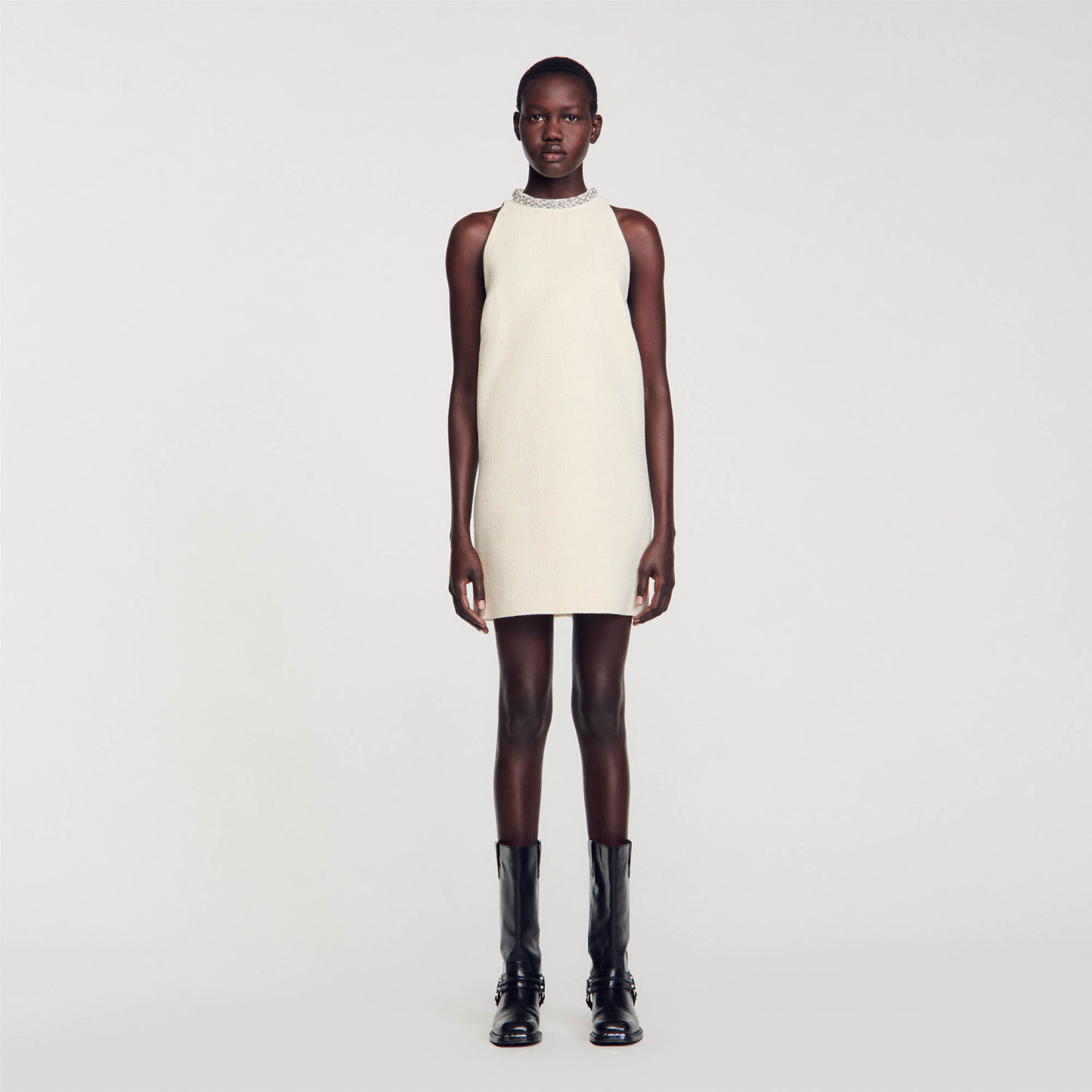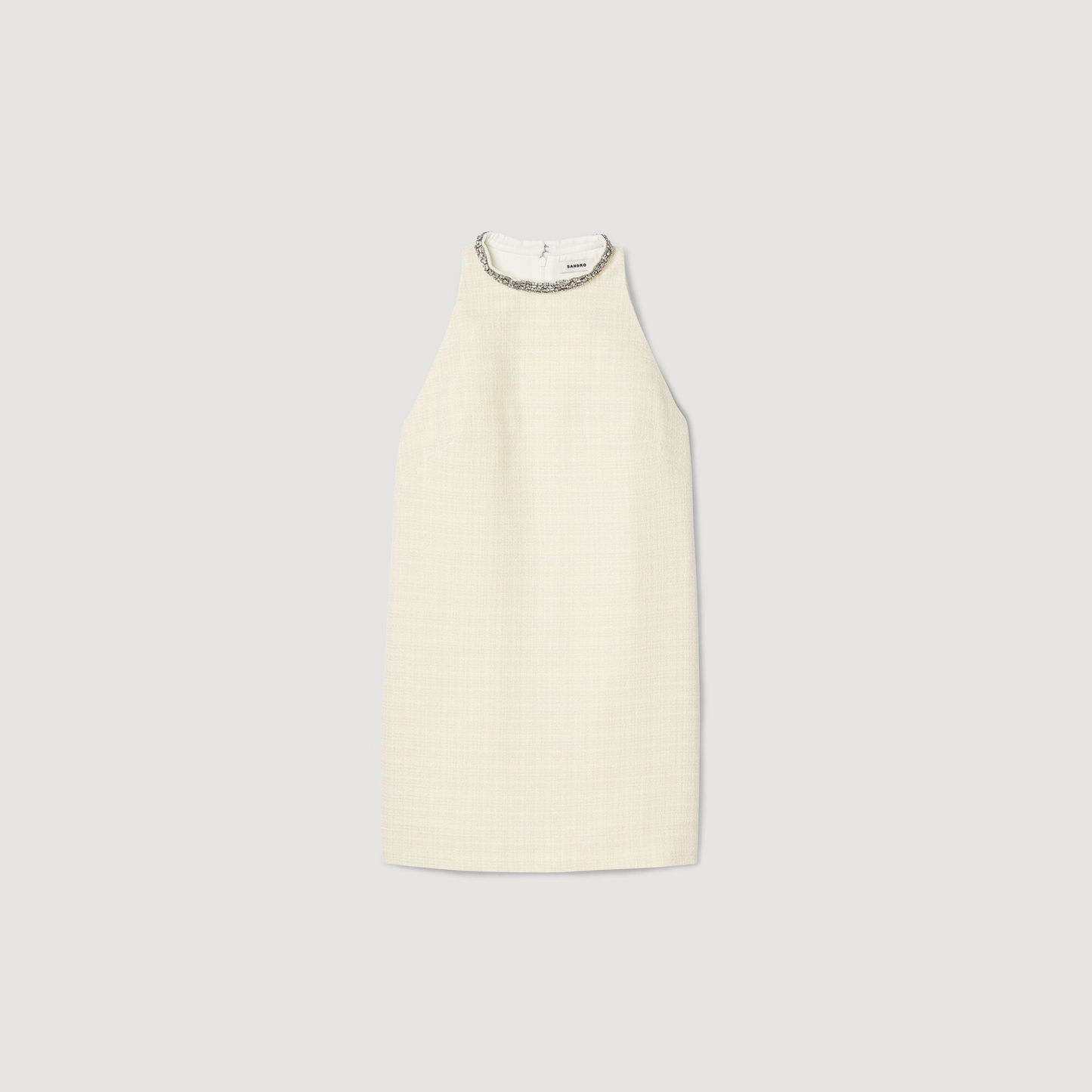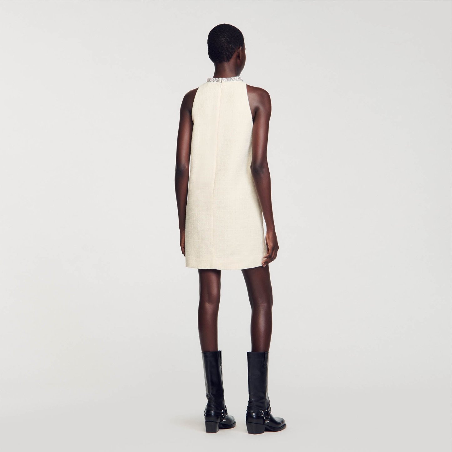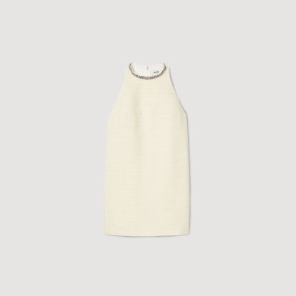 Mini tweed sleeveless dress with a round collar embellished with jewelry details.