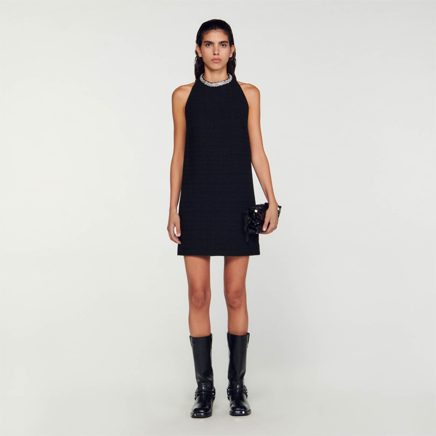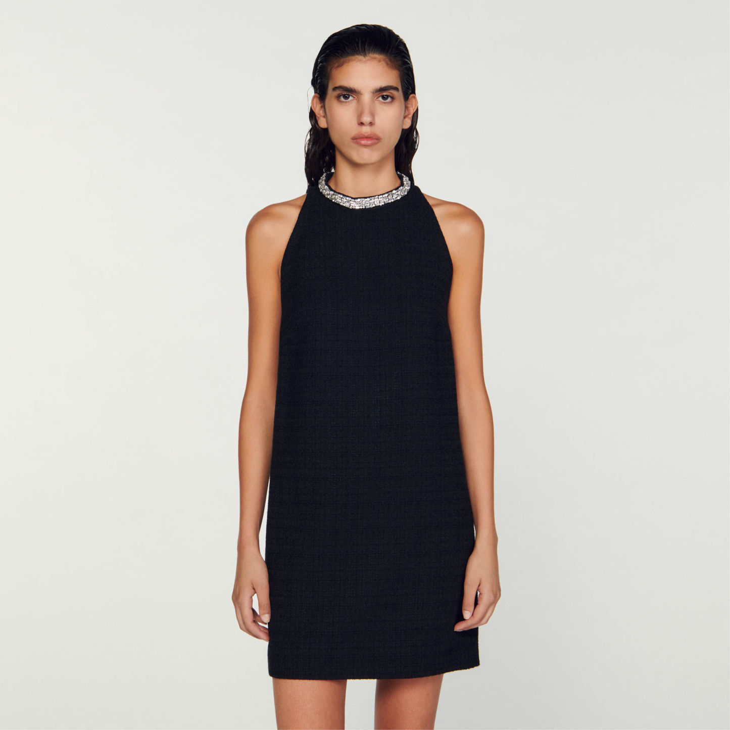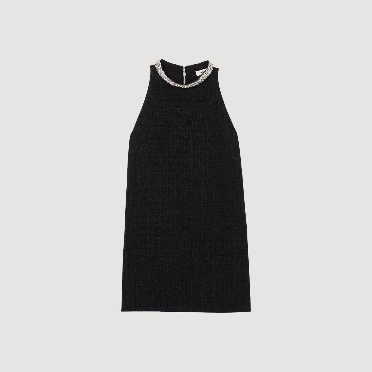 Short tweed dress with American armholes and a round collar embellished with jewellery details.