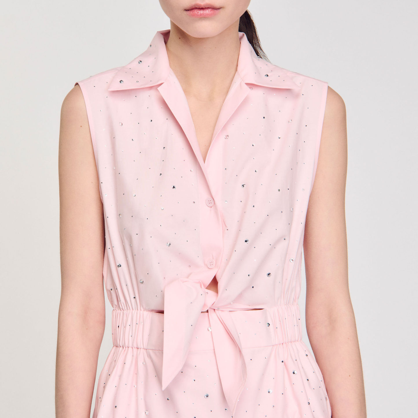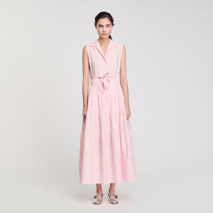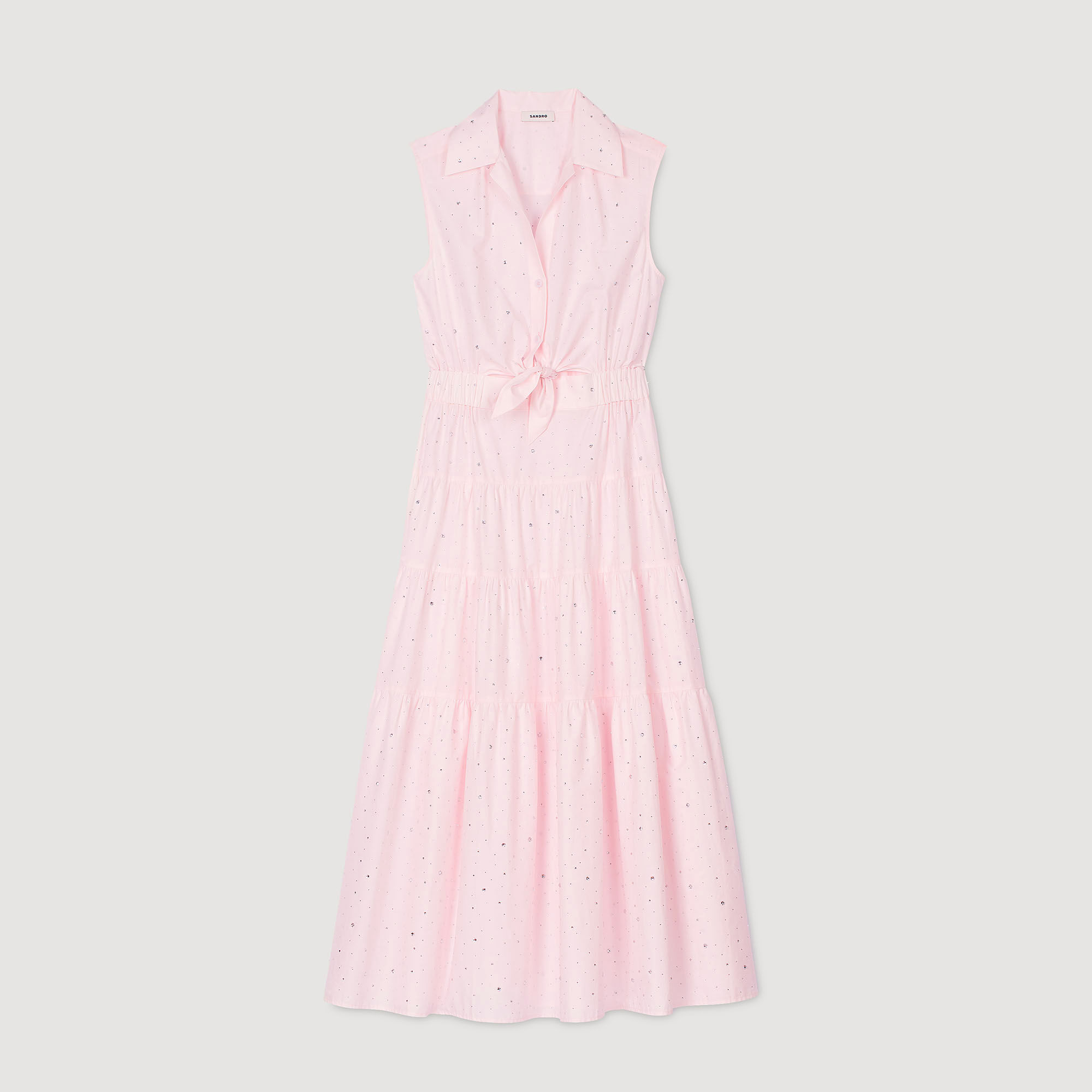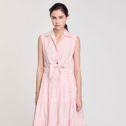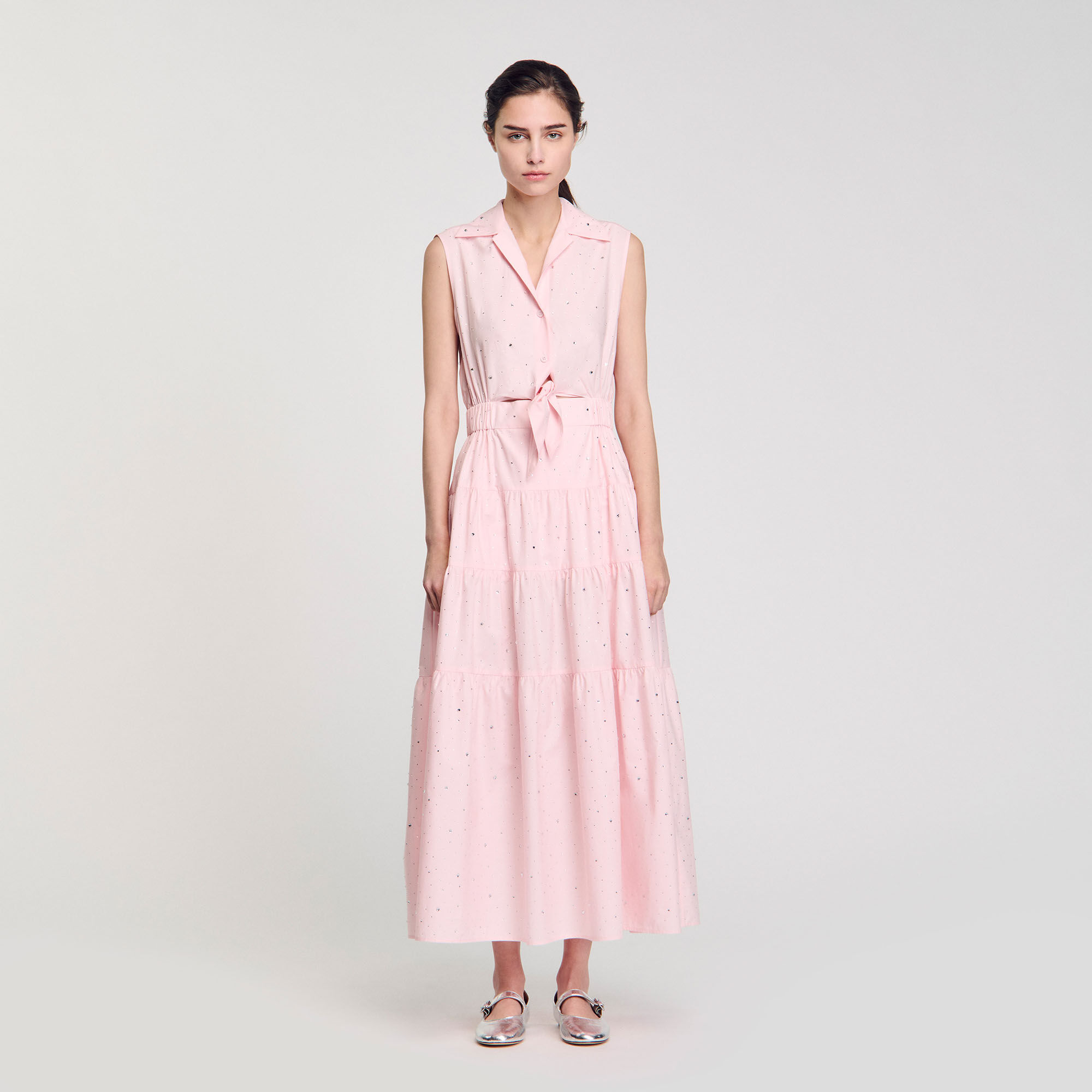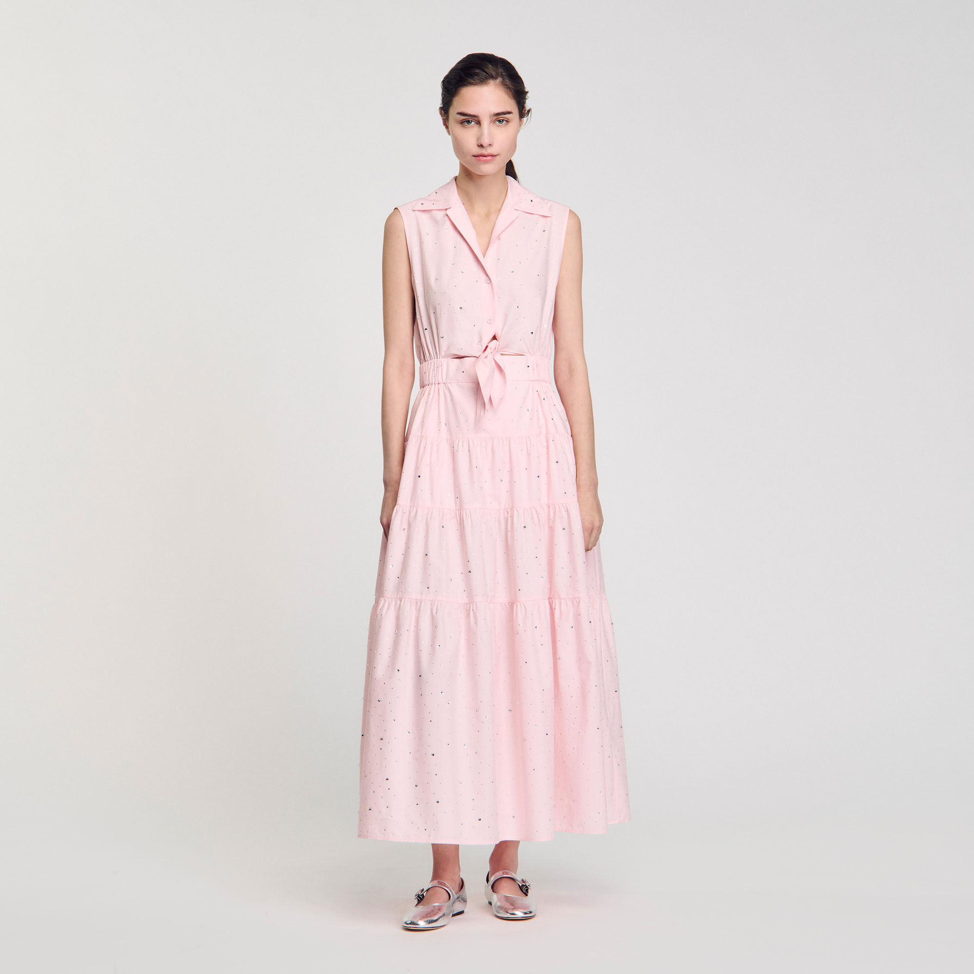 Sleeveless maxi dress with shirt collar, button-up tie-front, a flared, tiered skirt and all-over rhinestones.