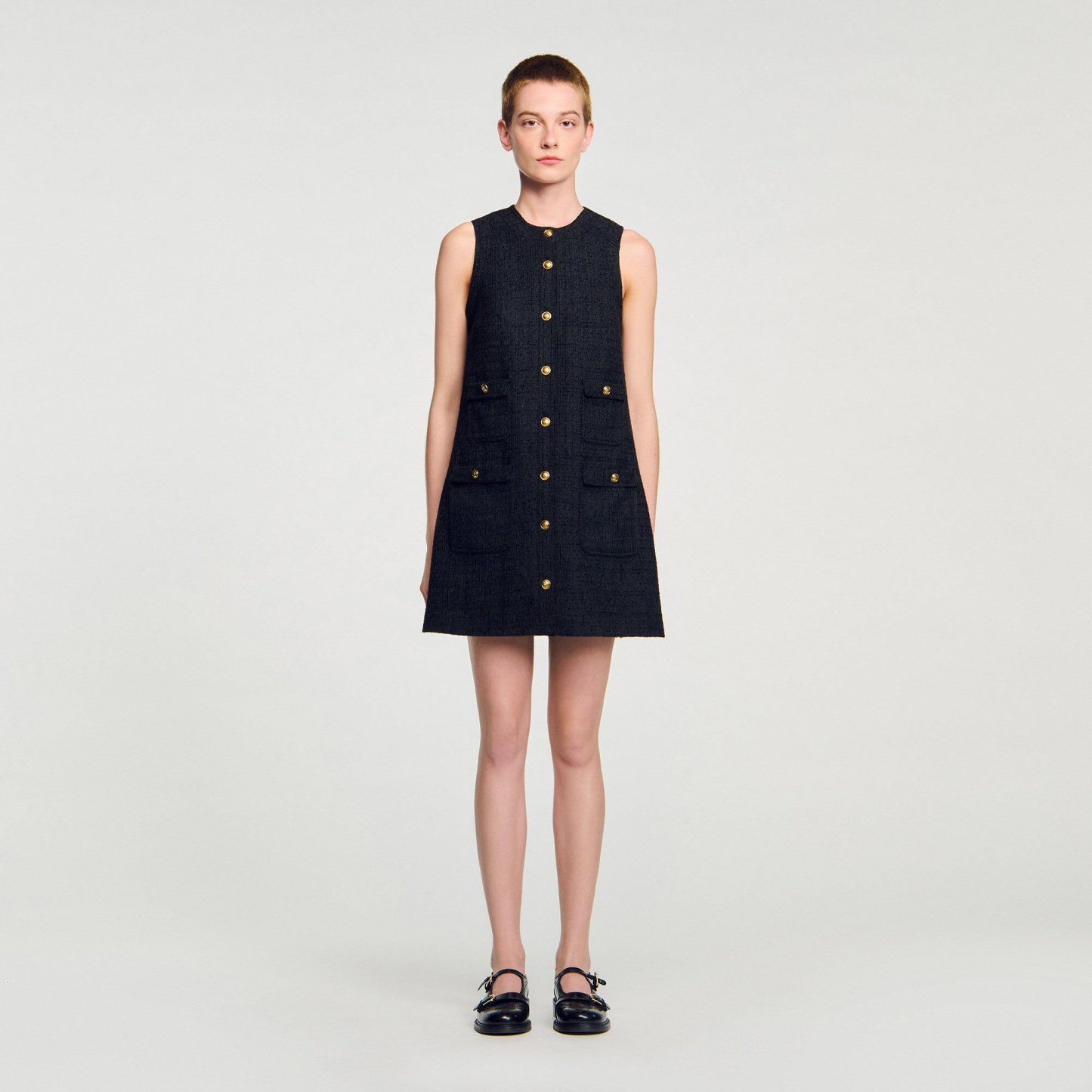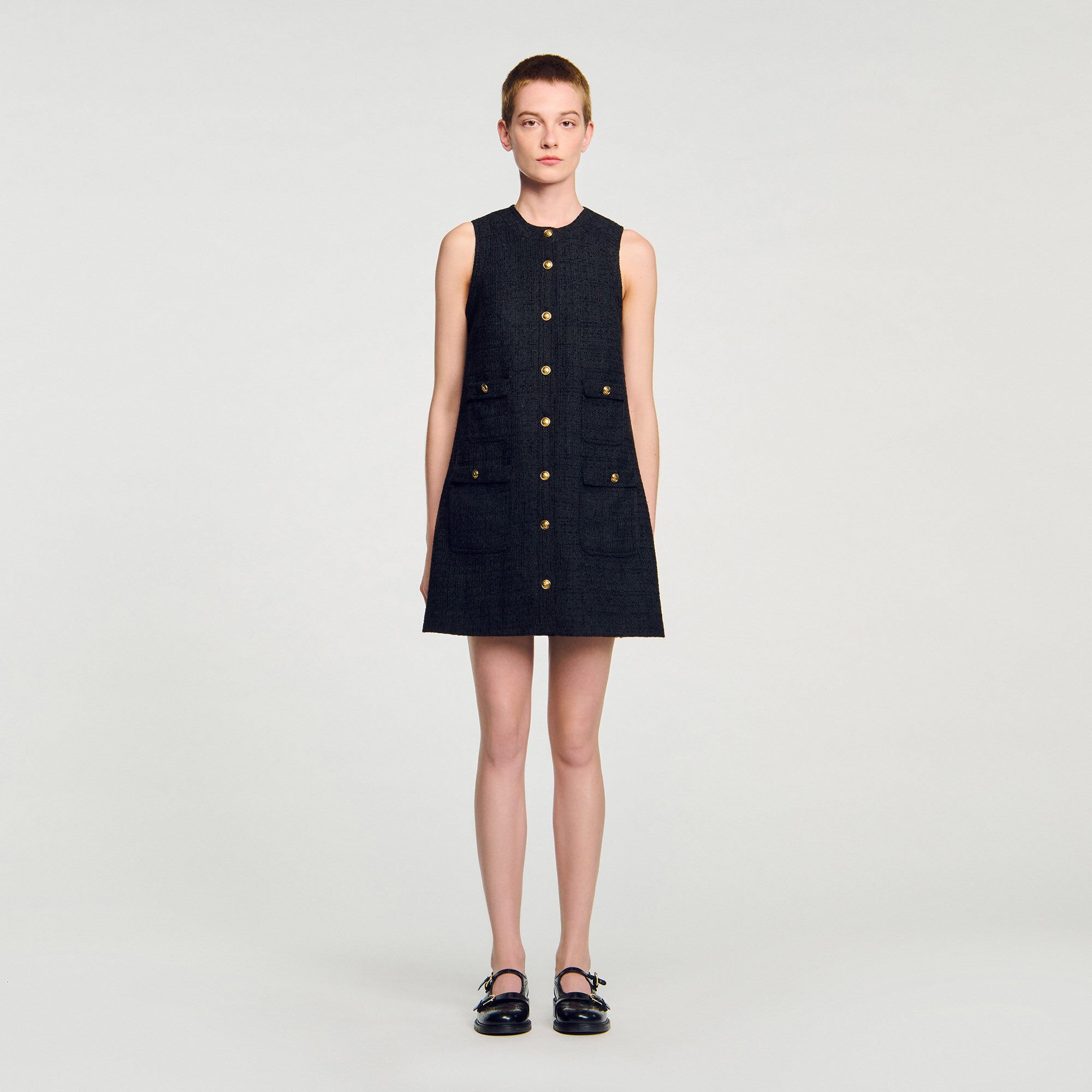 Mini sleeveless tweed dress with round neckline, button fastening and patch pockets with flaps.
