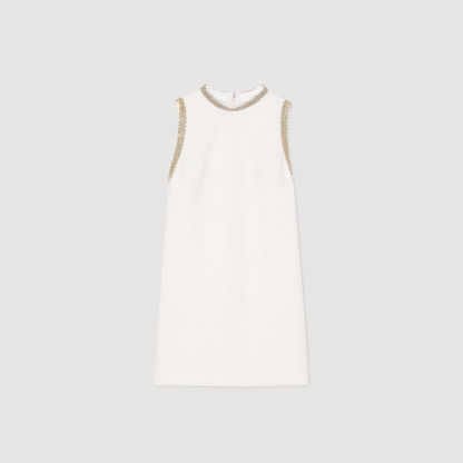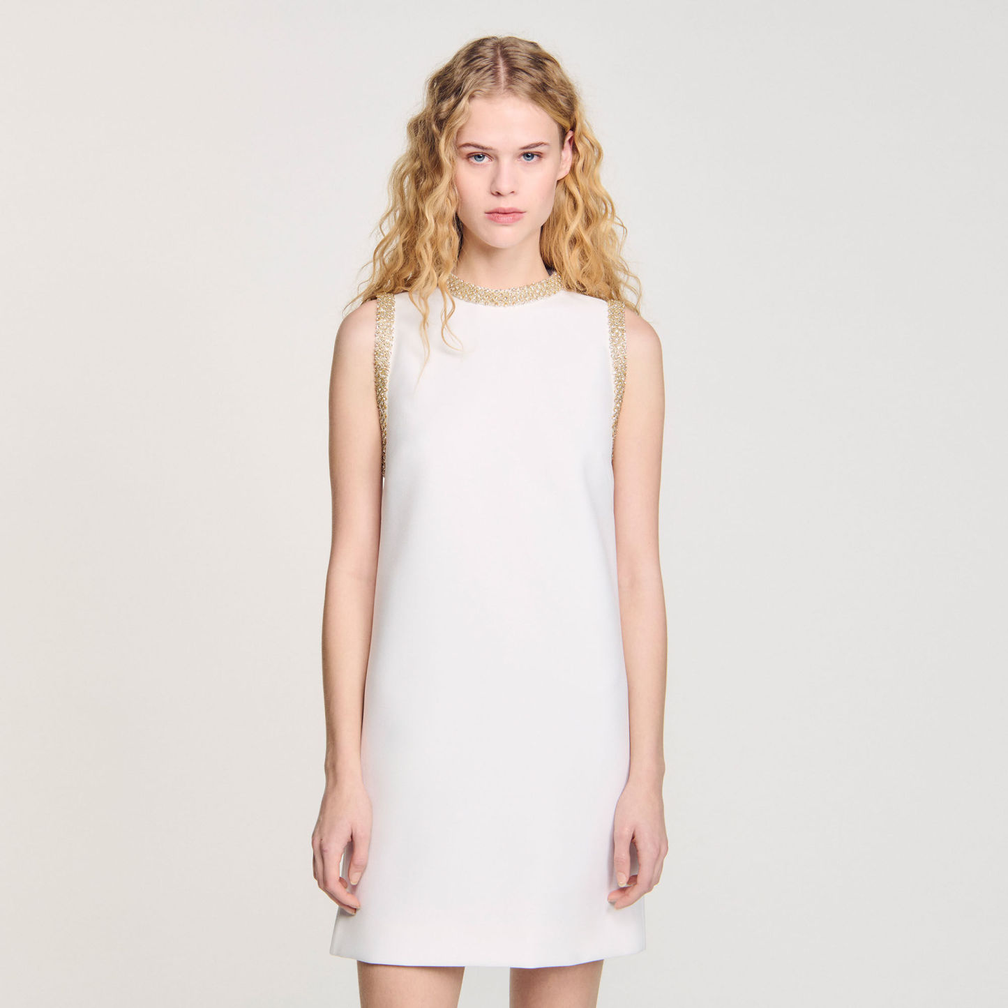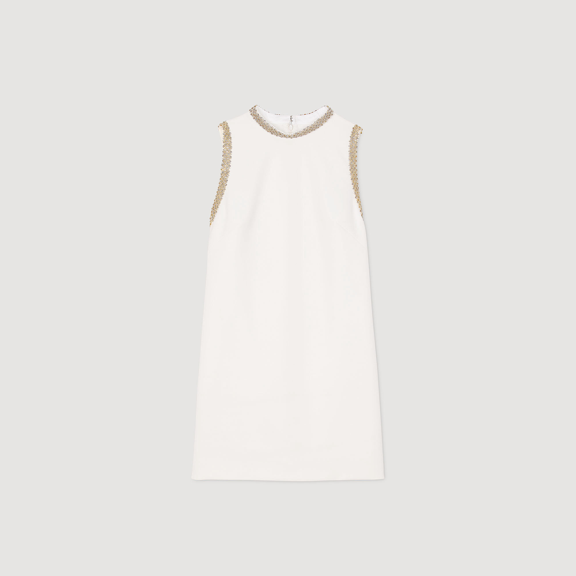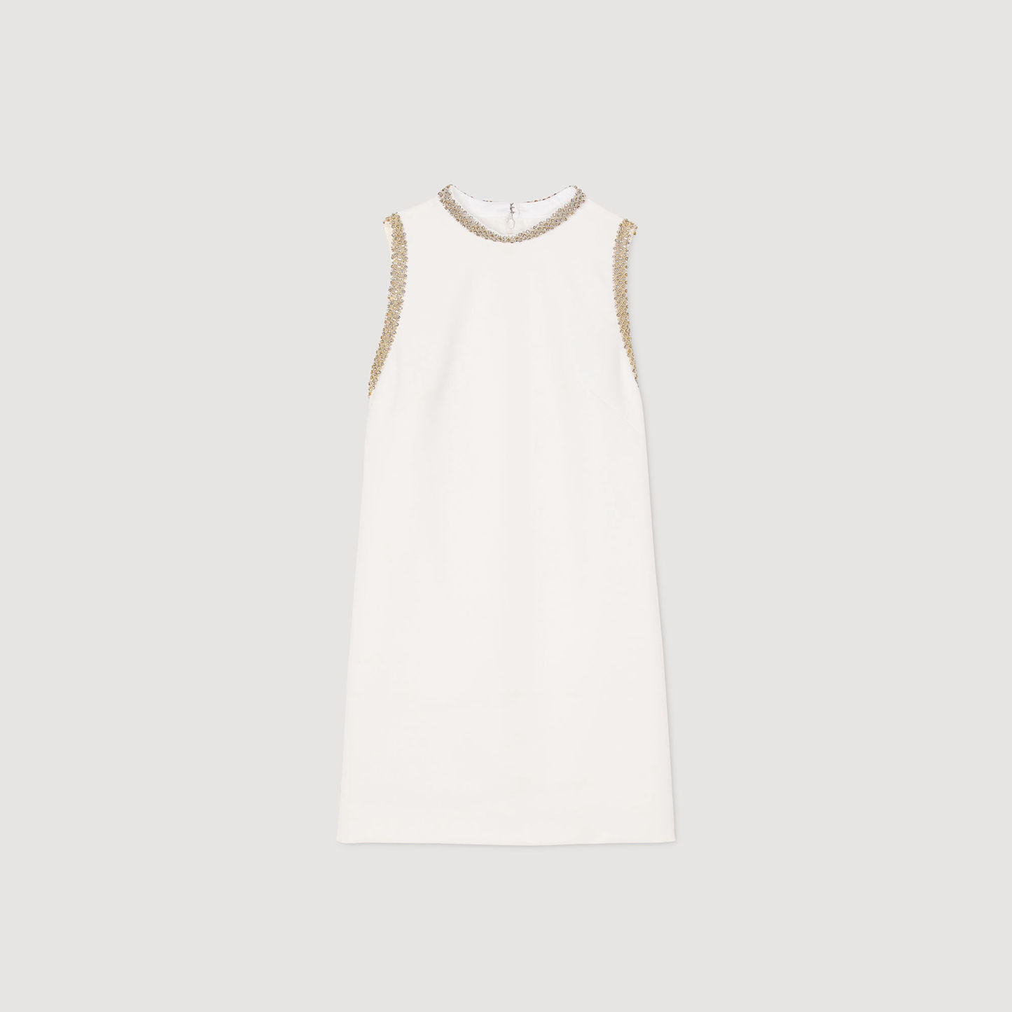 Sleeveless mini dress with high neckline, with rhinestone trim on neckline.
