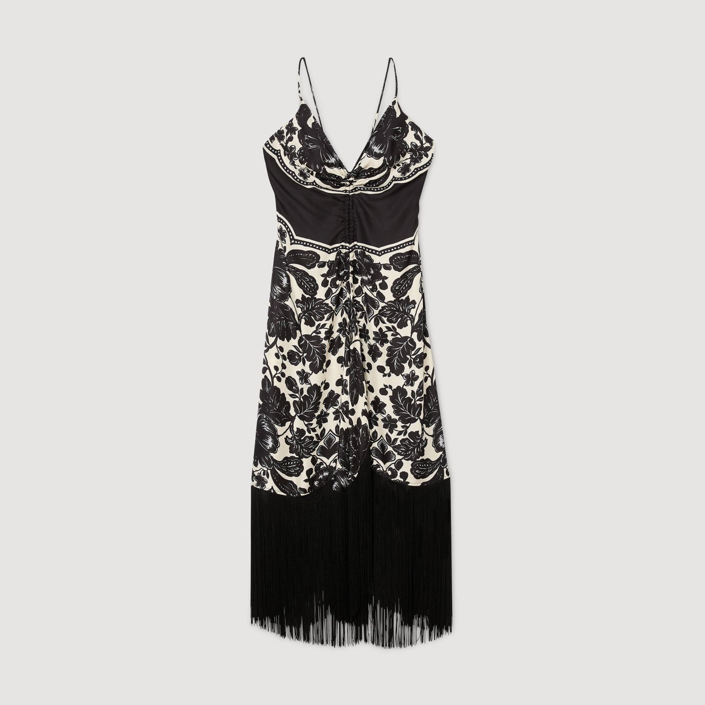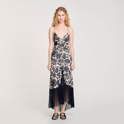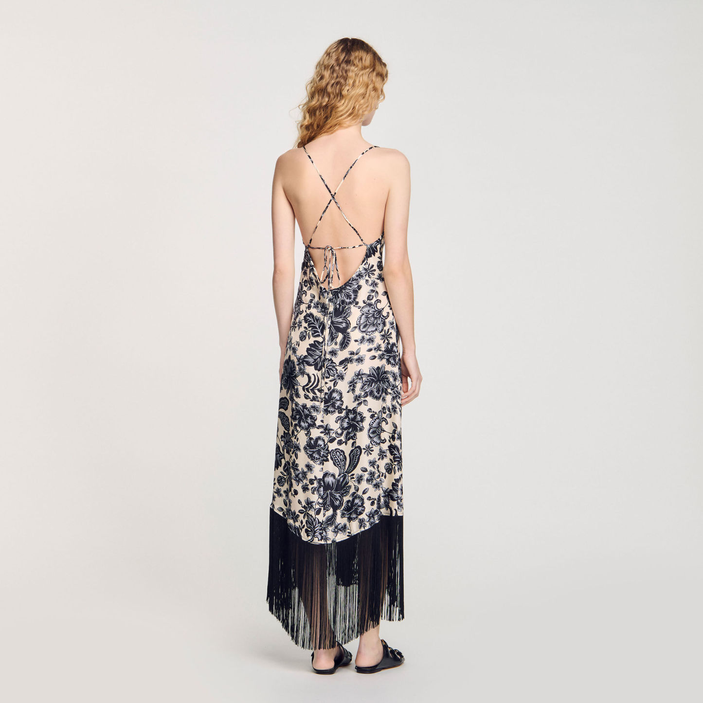 Flowy floral-print maxi dress with spaghetti straps, a V-neckline with drawstrings, a scoop back and a skirt with contrasting fringes.