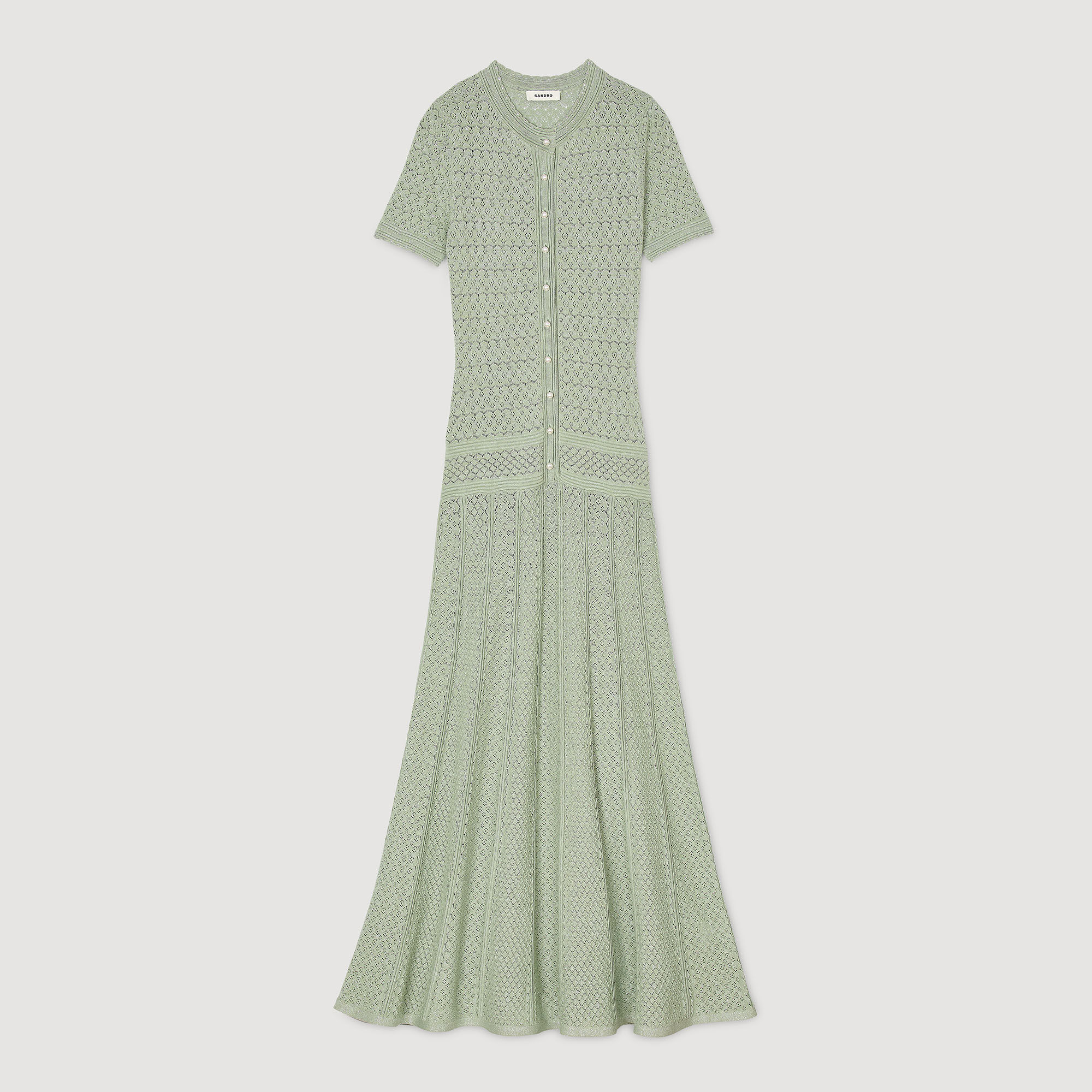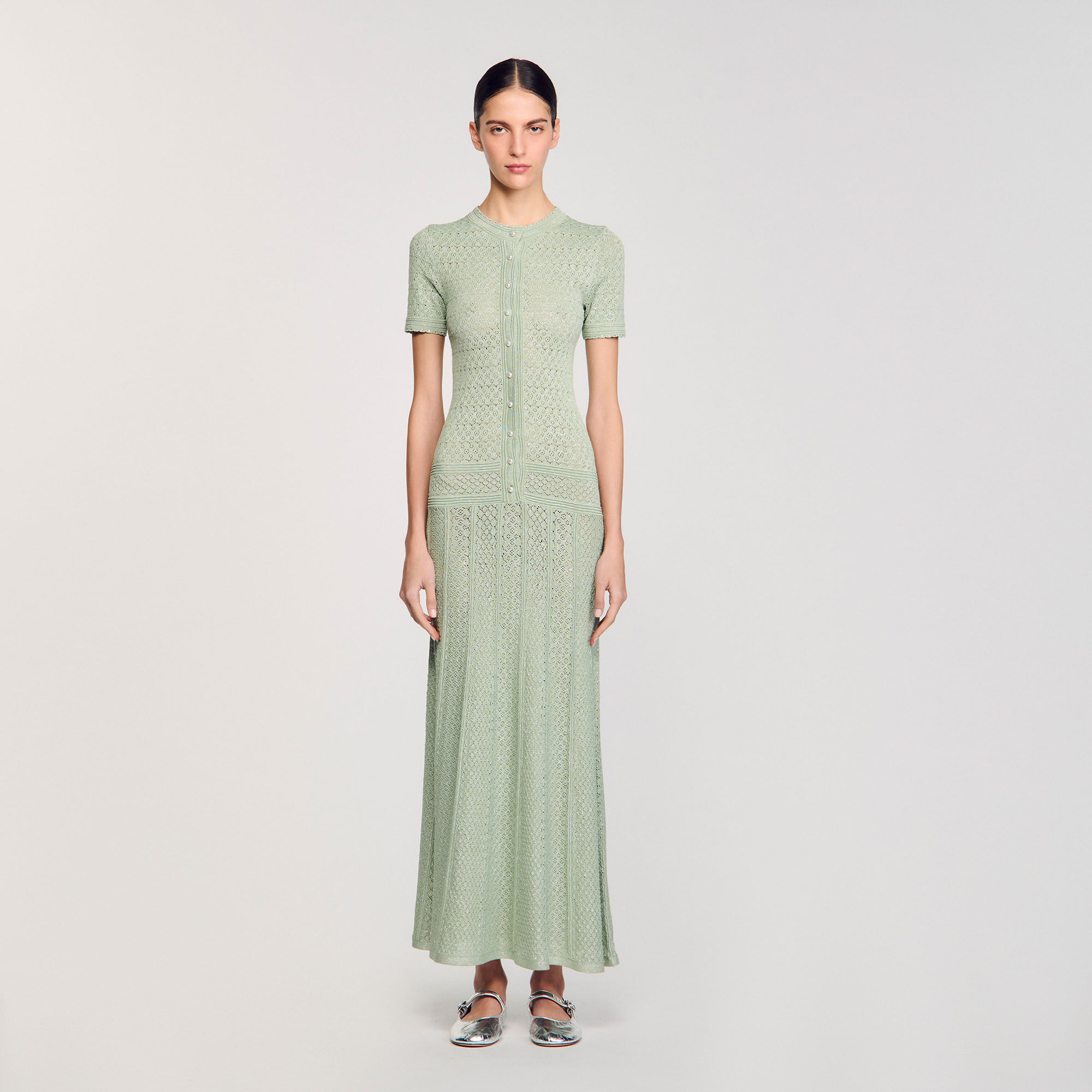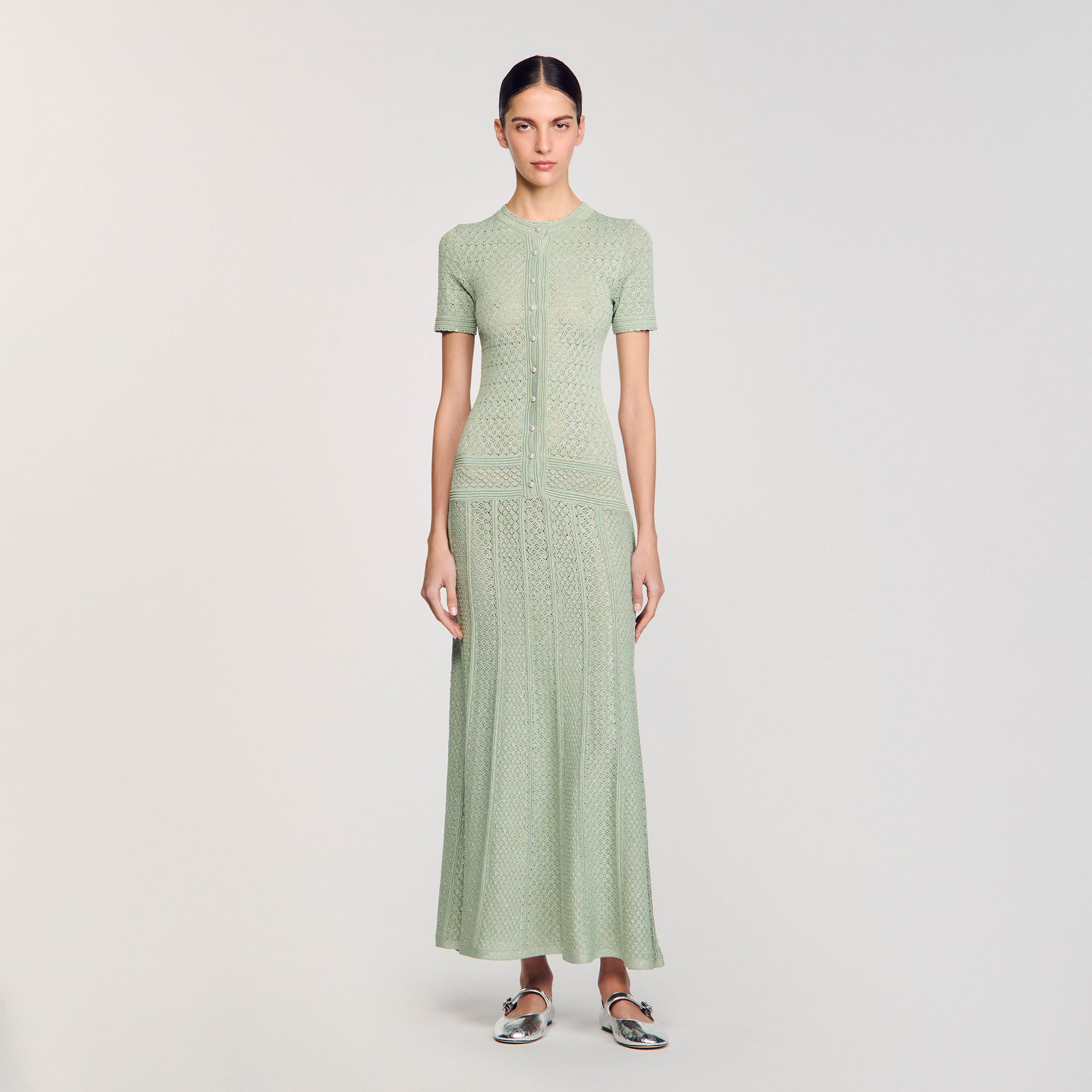 Glitter knit maxi dress with rhinestone details, featuring a round neck, short sleeves and a button placket with pearlescent buttons.