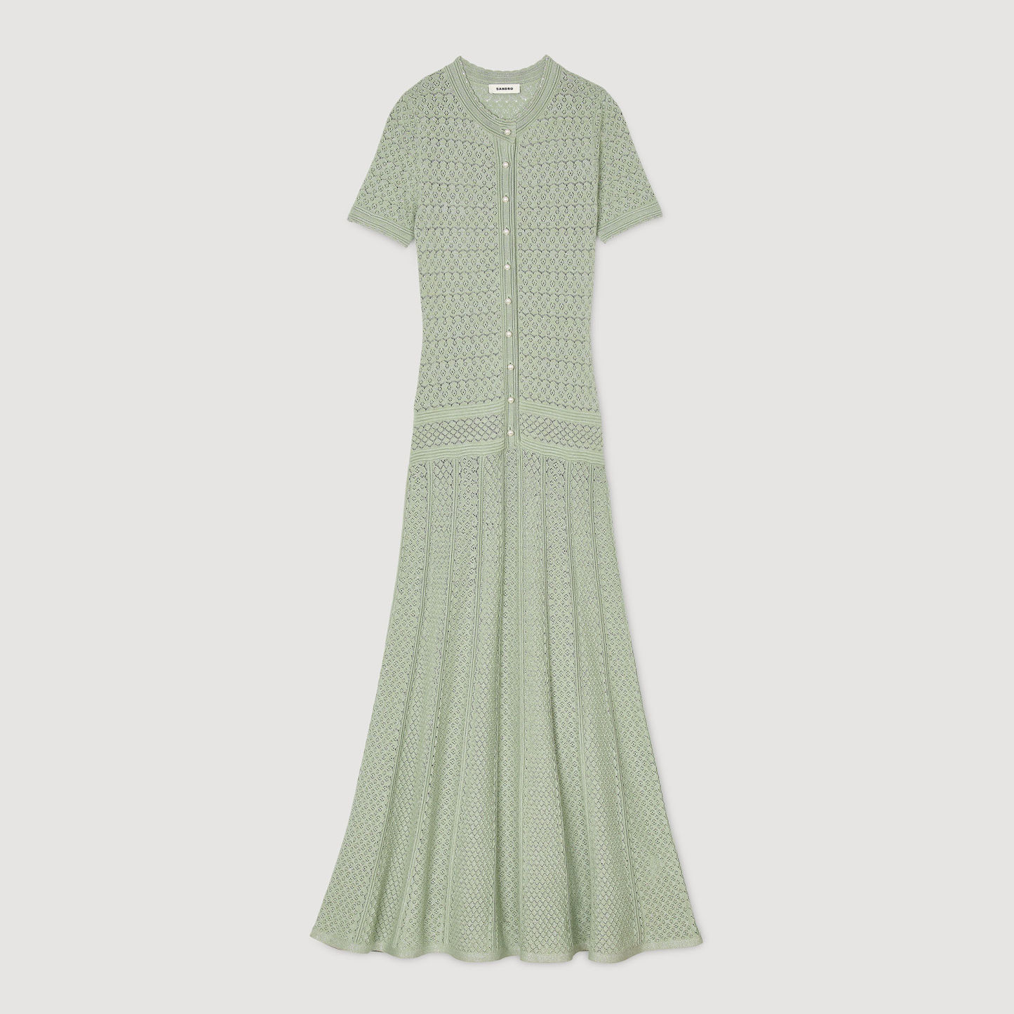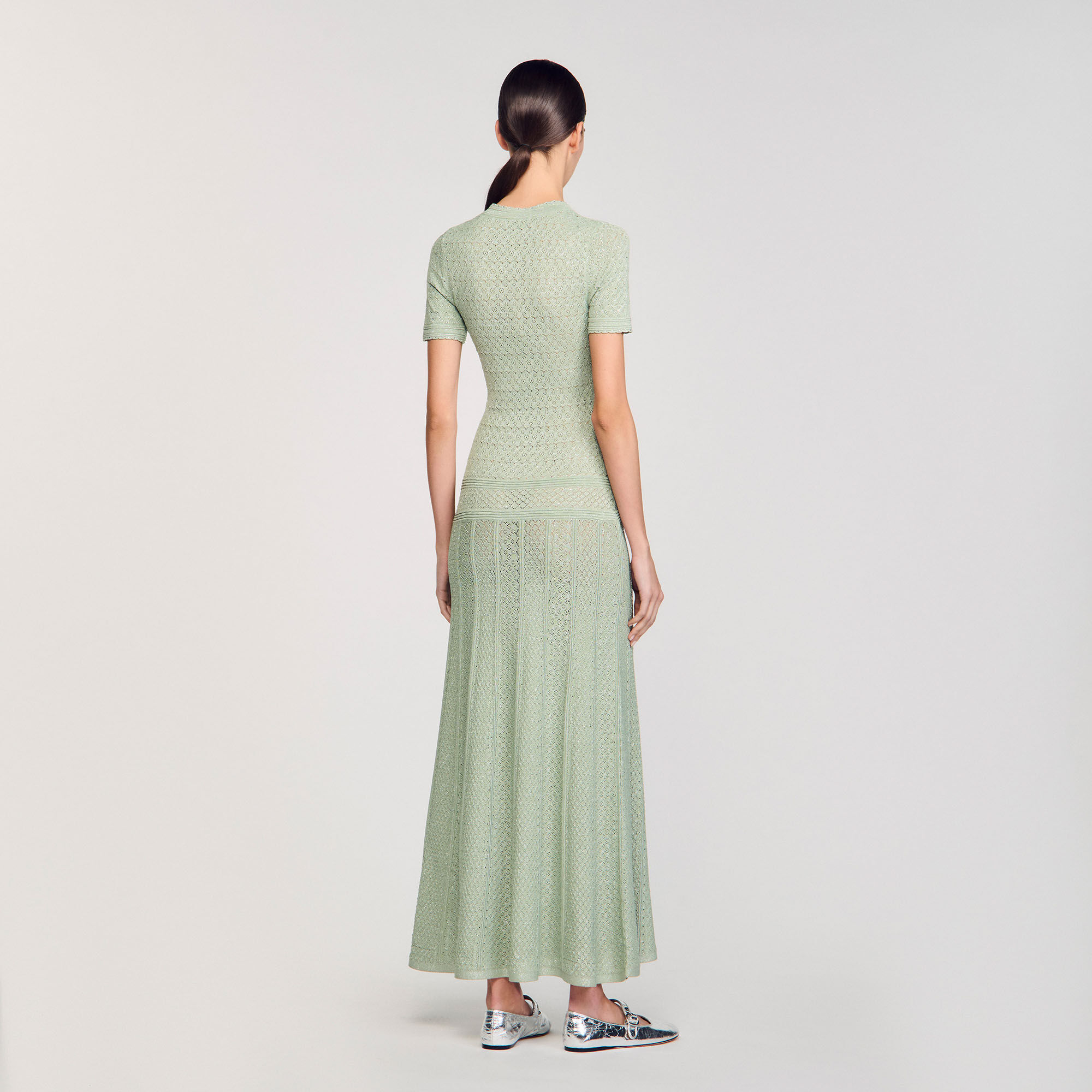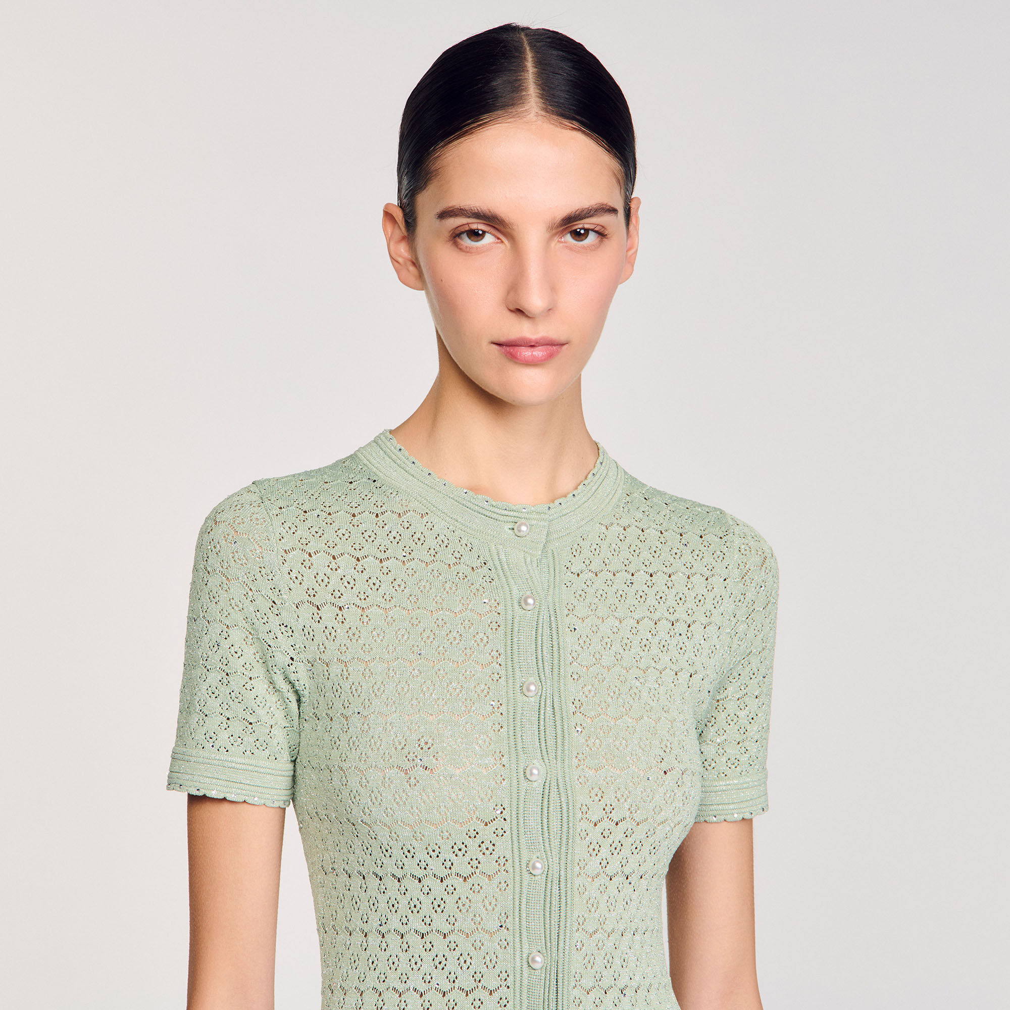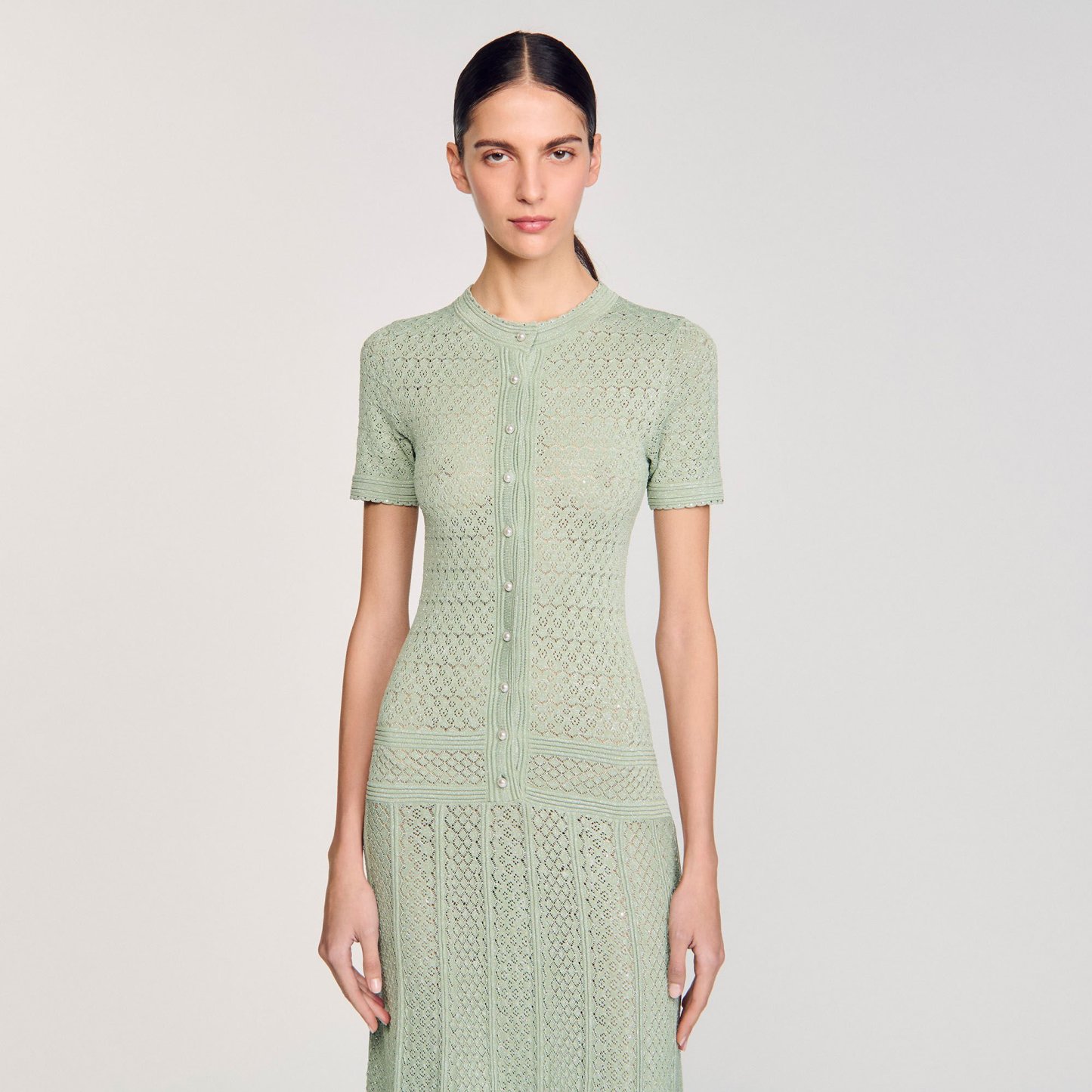 Glitter knit maxi dress with rhinestone details, featuring a round neck, short sleeves and a button placket with pearlescent buttons.