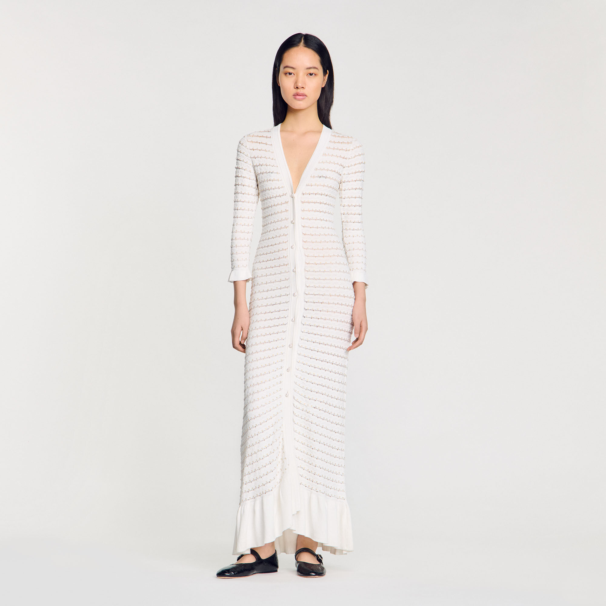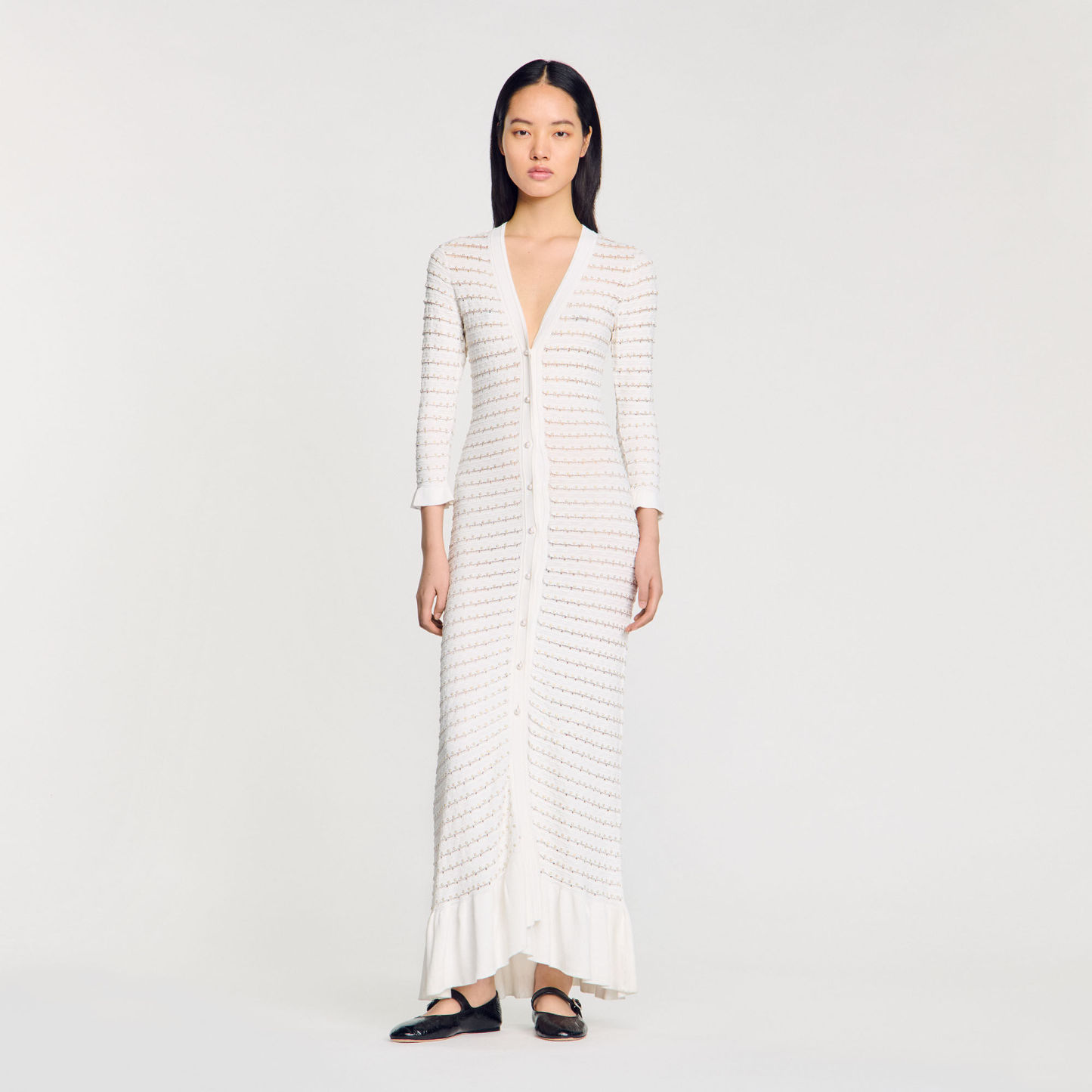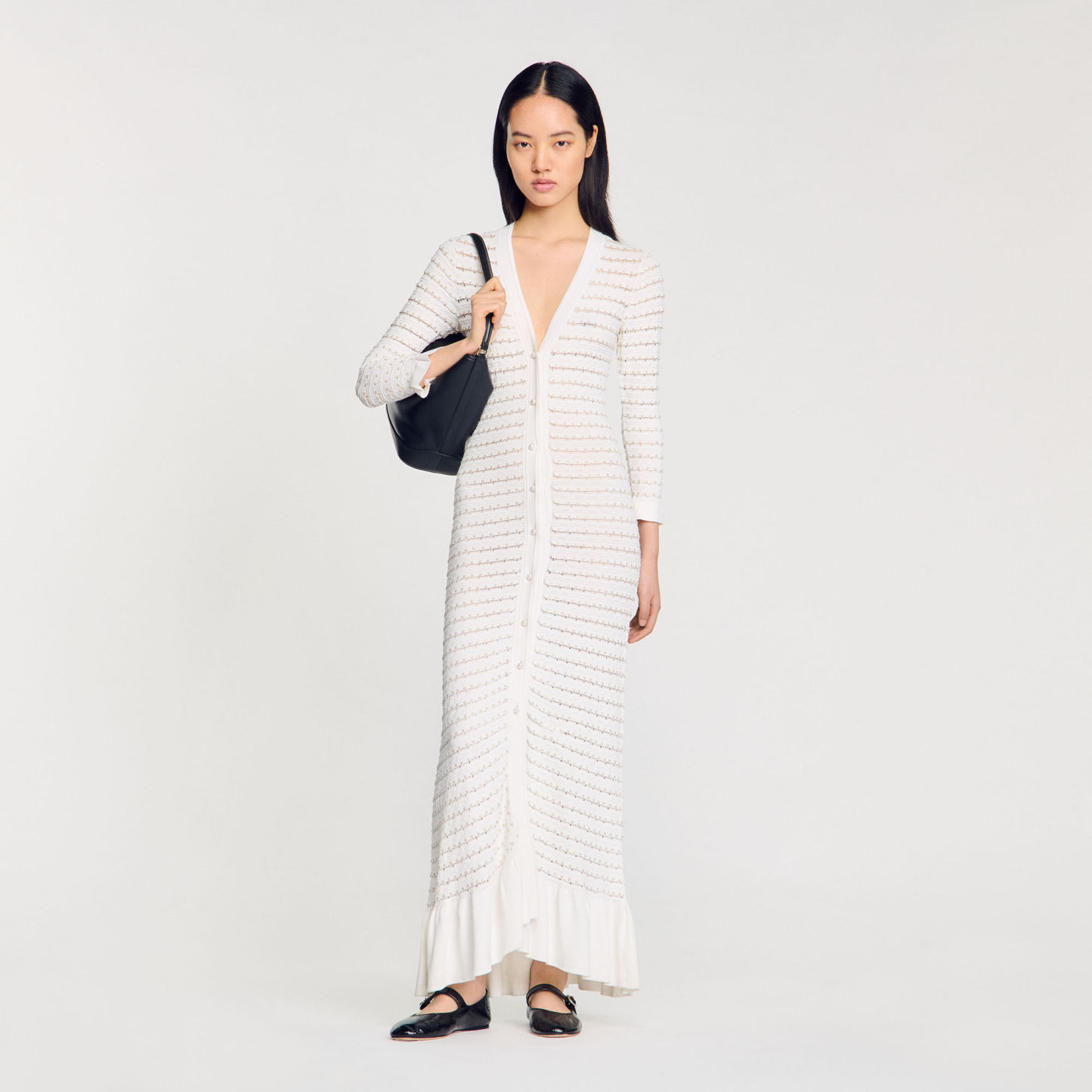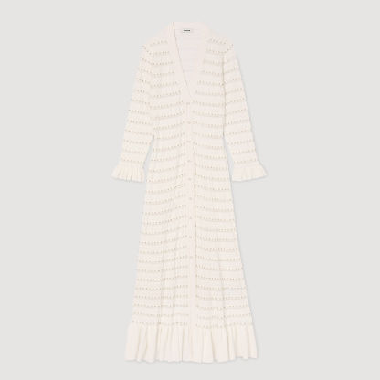 Pointelle knit maxi dress with cocotte stitch and beaded details, featuring a plunging neck, ruffled sleeves and a button placket with pearlescent buttons.