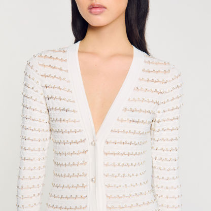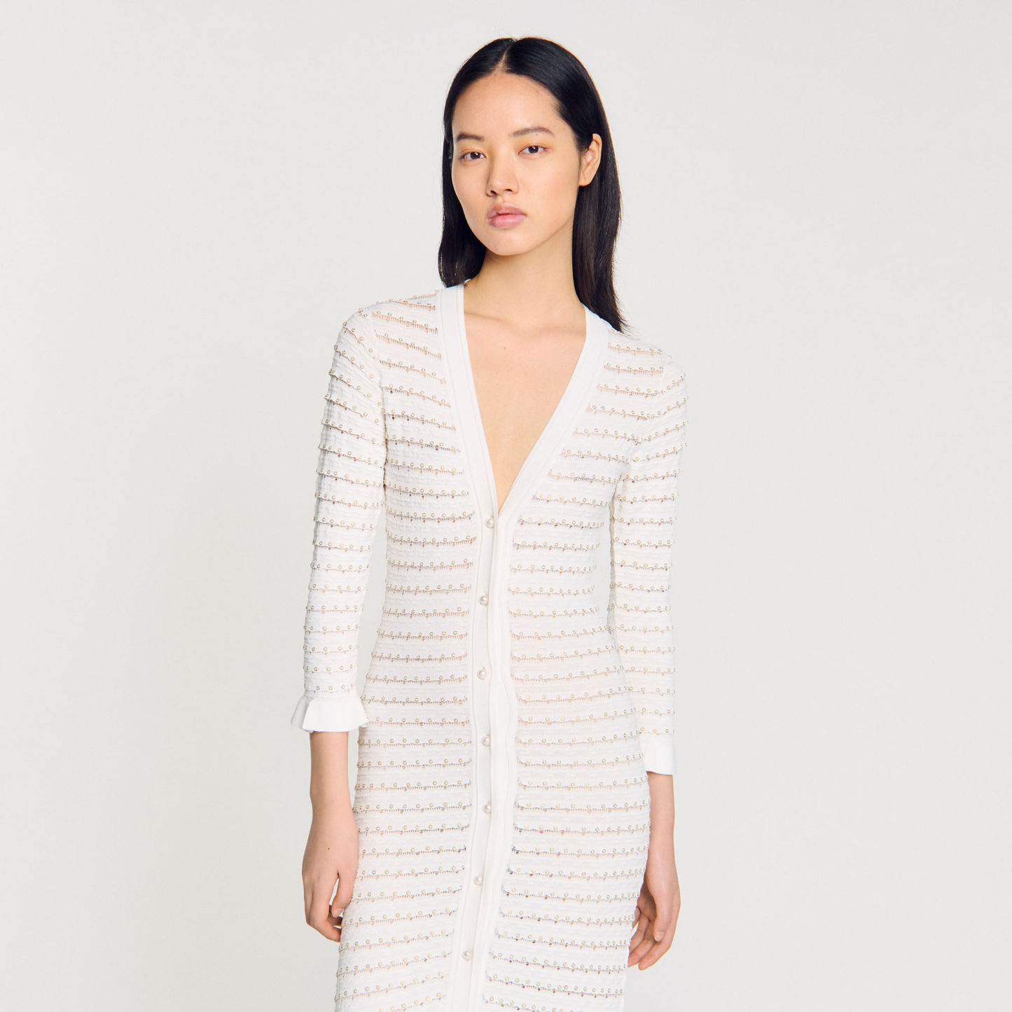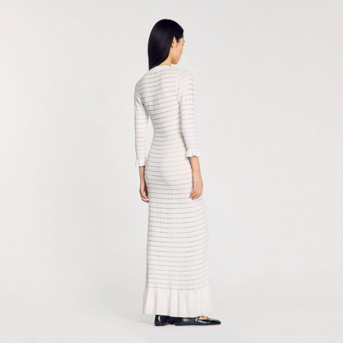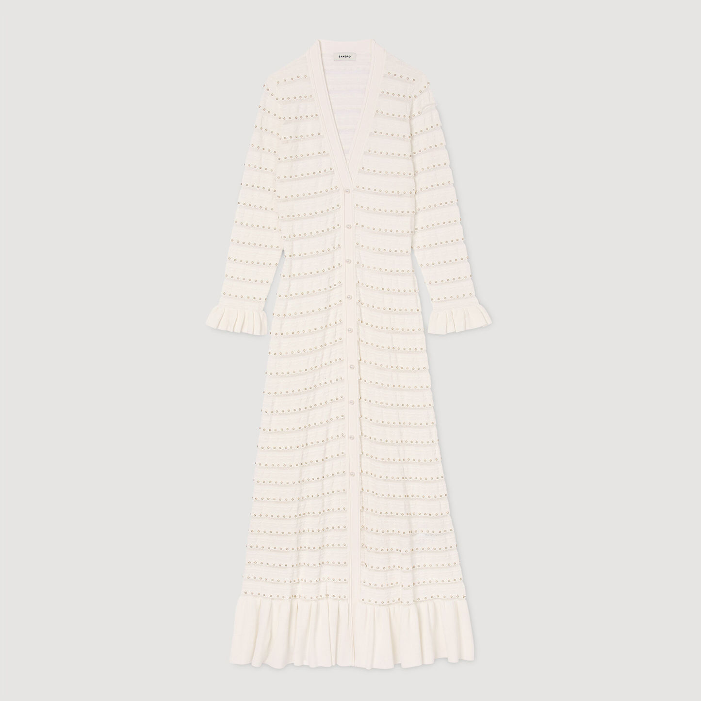 Pointelle knit maxi dress with cocotte stitch and beaded details, featuring a plunging neck, ruffled sleeves and a button placket with pearlescent buttons.