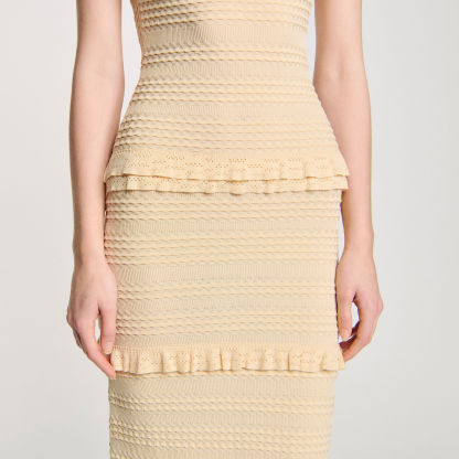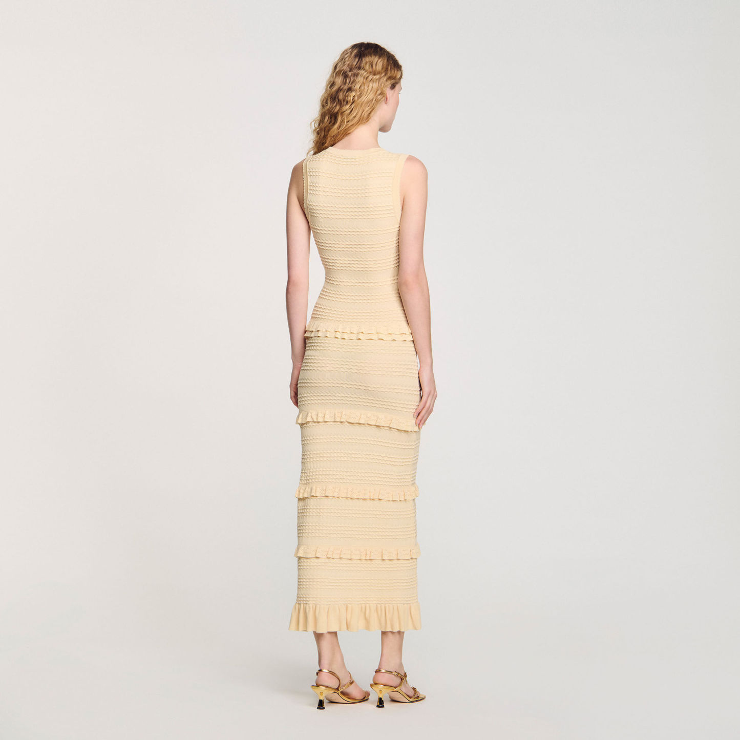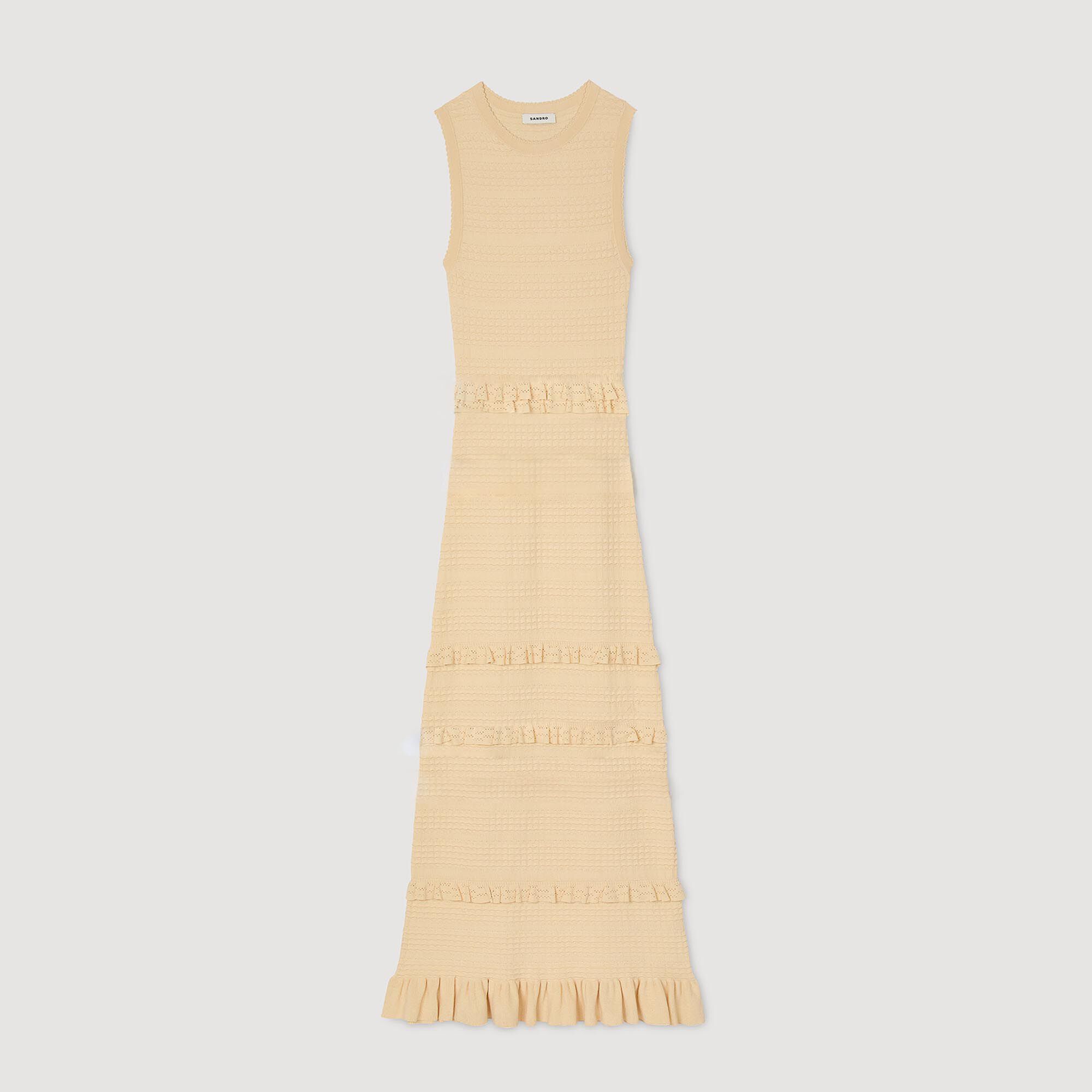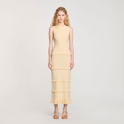 Fancy knit sleeveless dress with round neck and ruffles at the waist and bottom of the skirt.