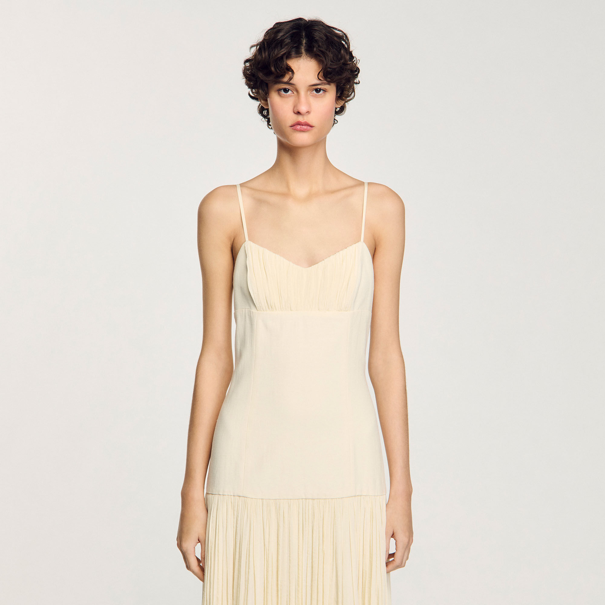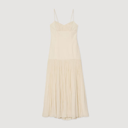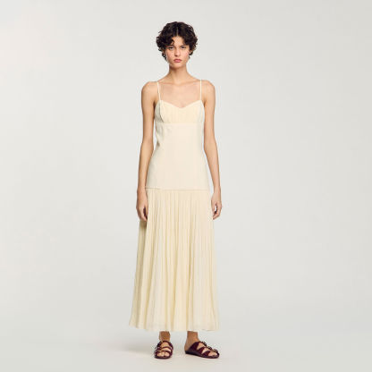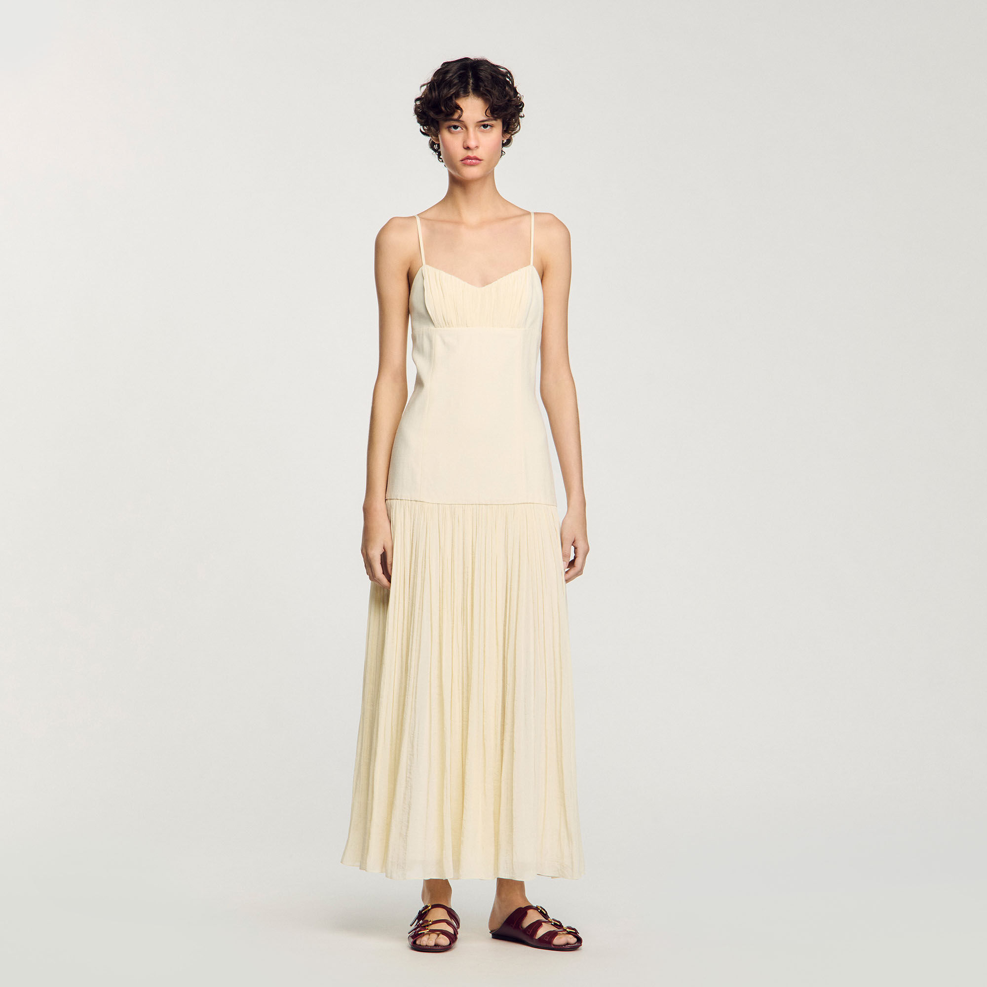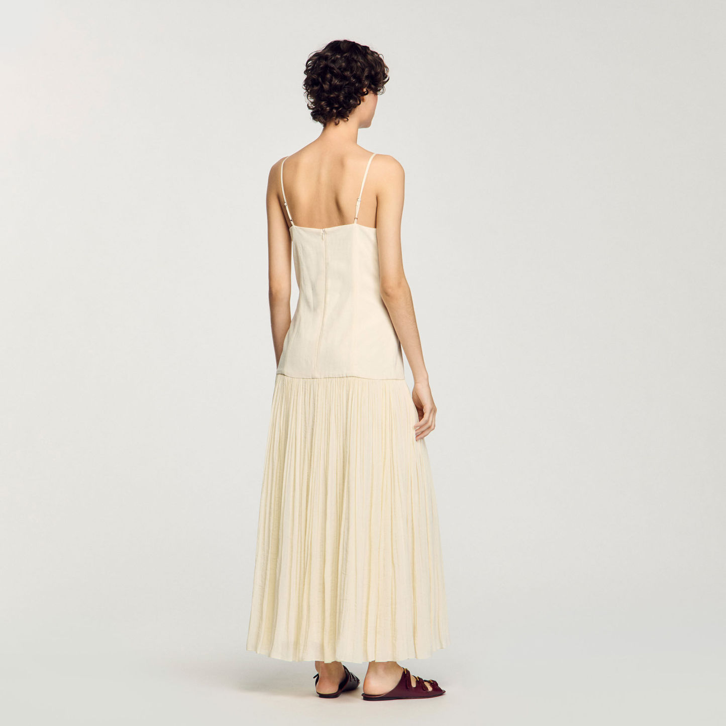 Dual-material maxi dress with spaghetti straps, pleated neckline and skirt.