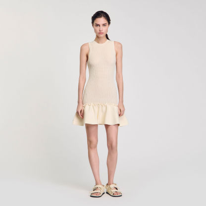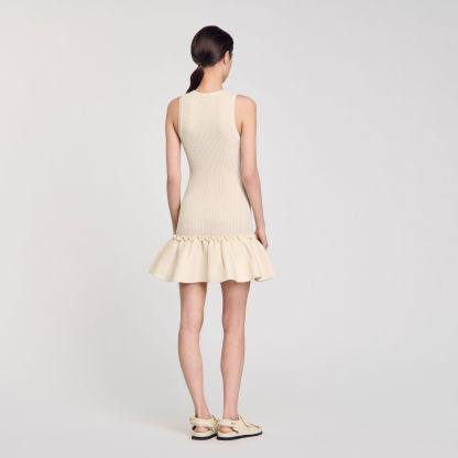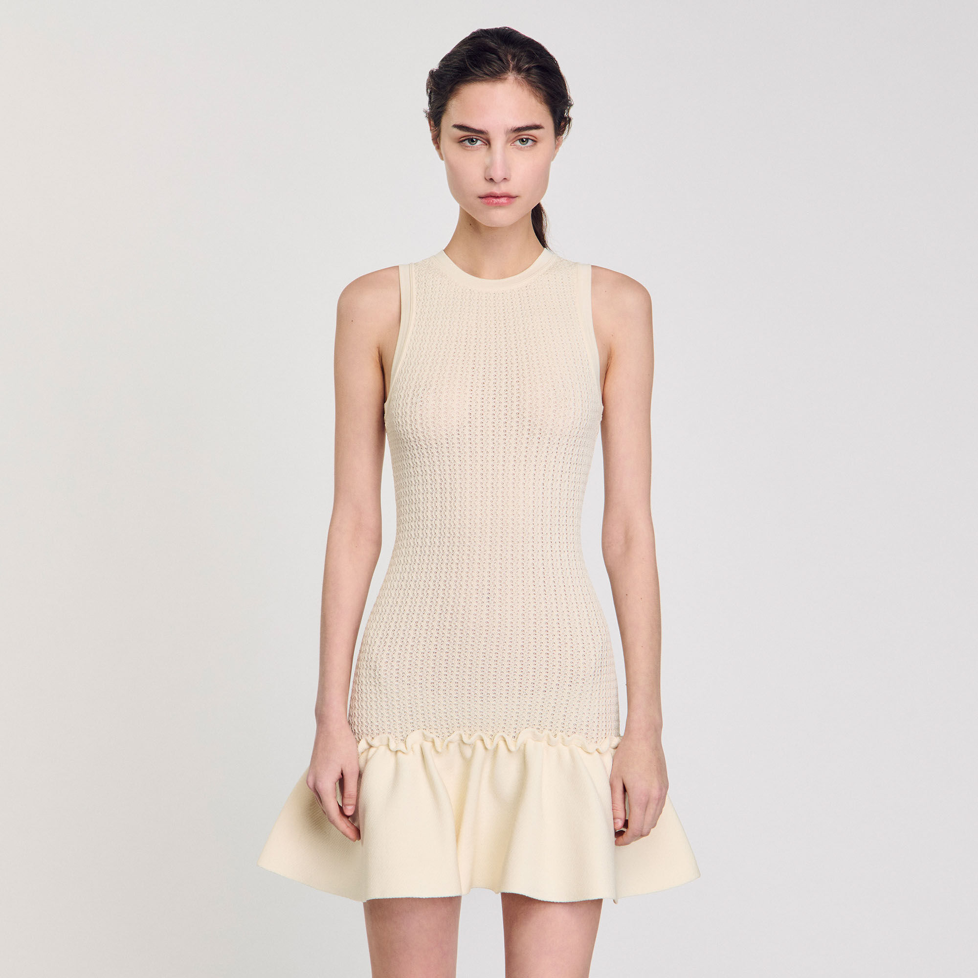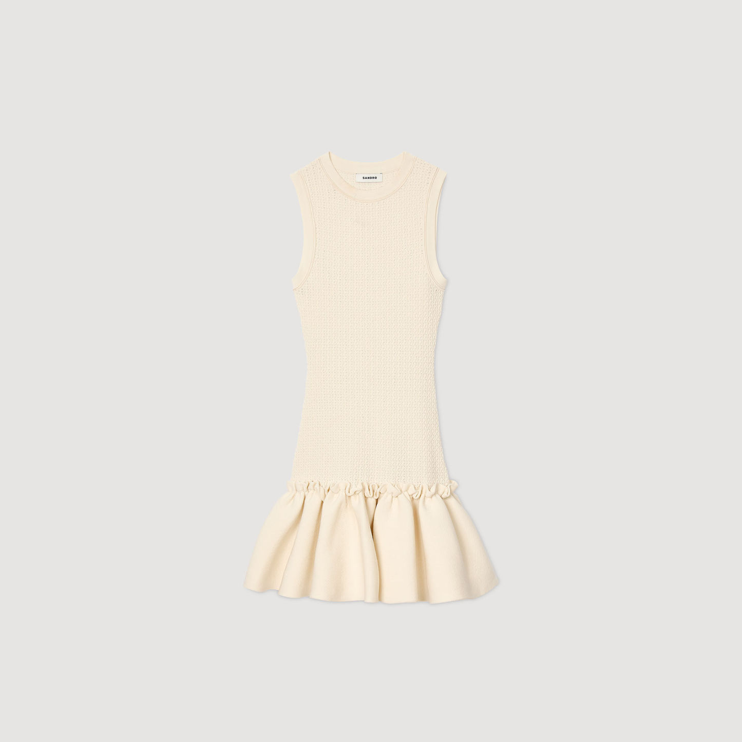 Short sleeveless pointelle knit dress with a round neck and a skirt with a big ruffle.