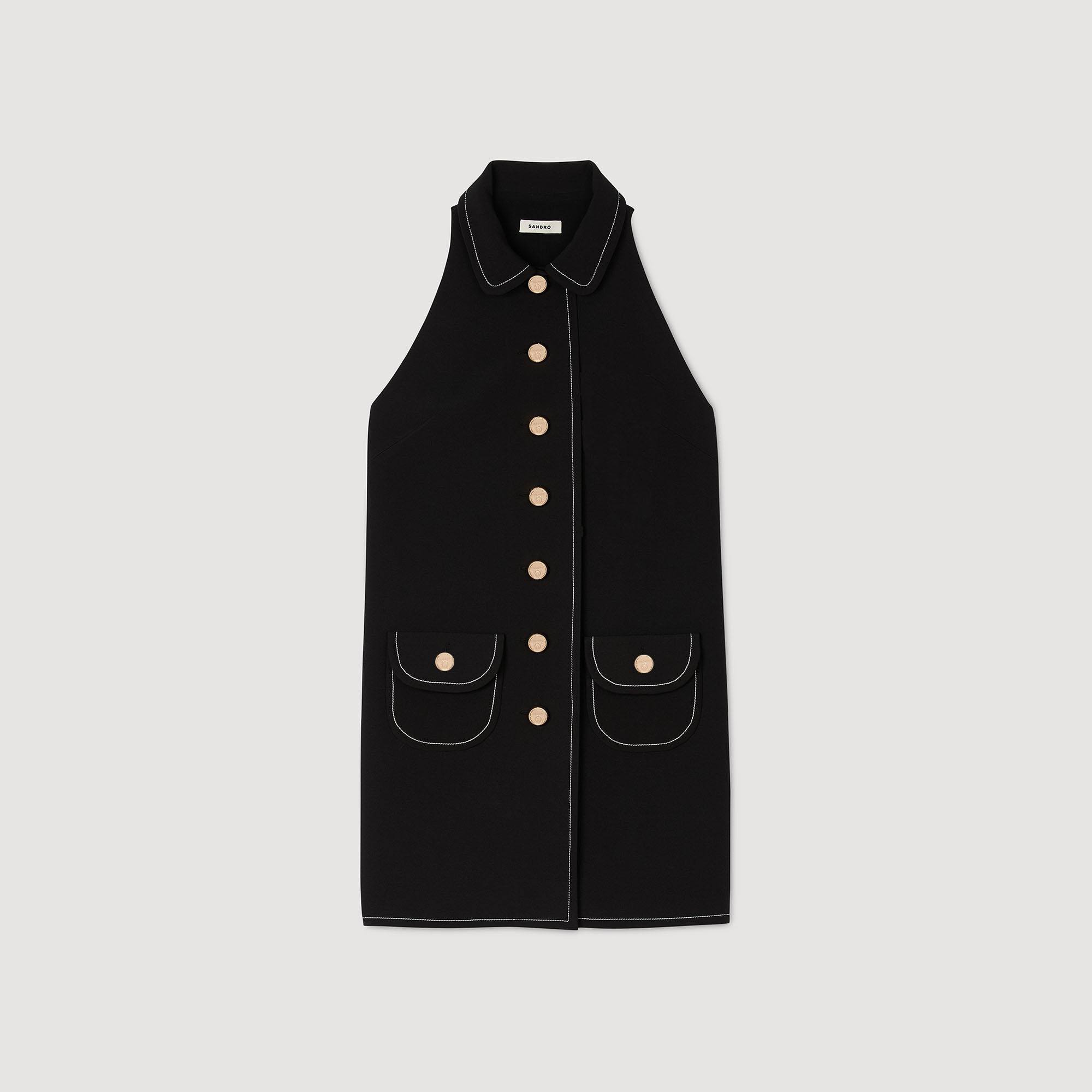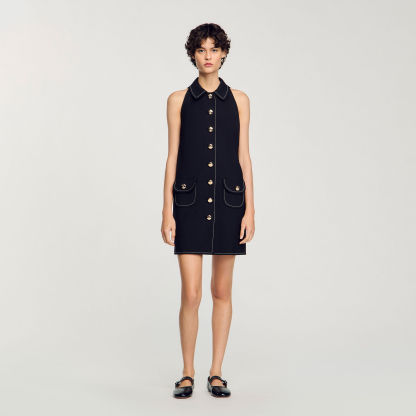 Mini dress with contrast stitching, Peter Pan collar, button placket with decorative buttons and patch pockets.
