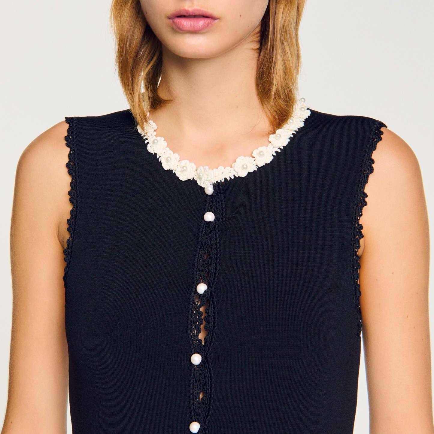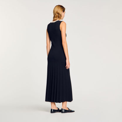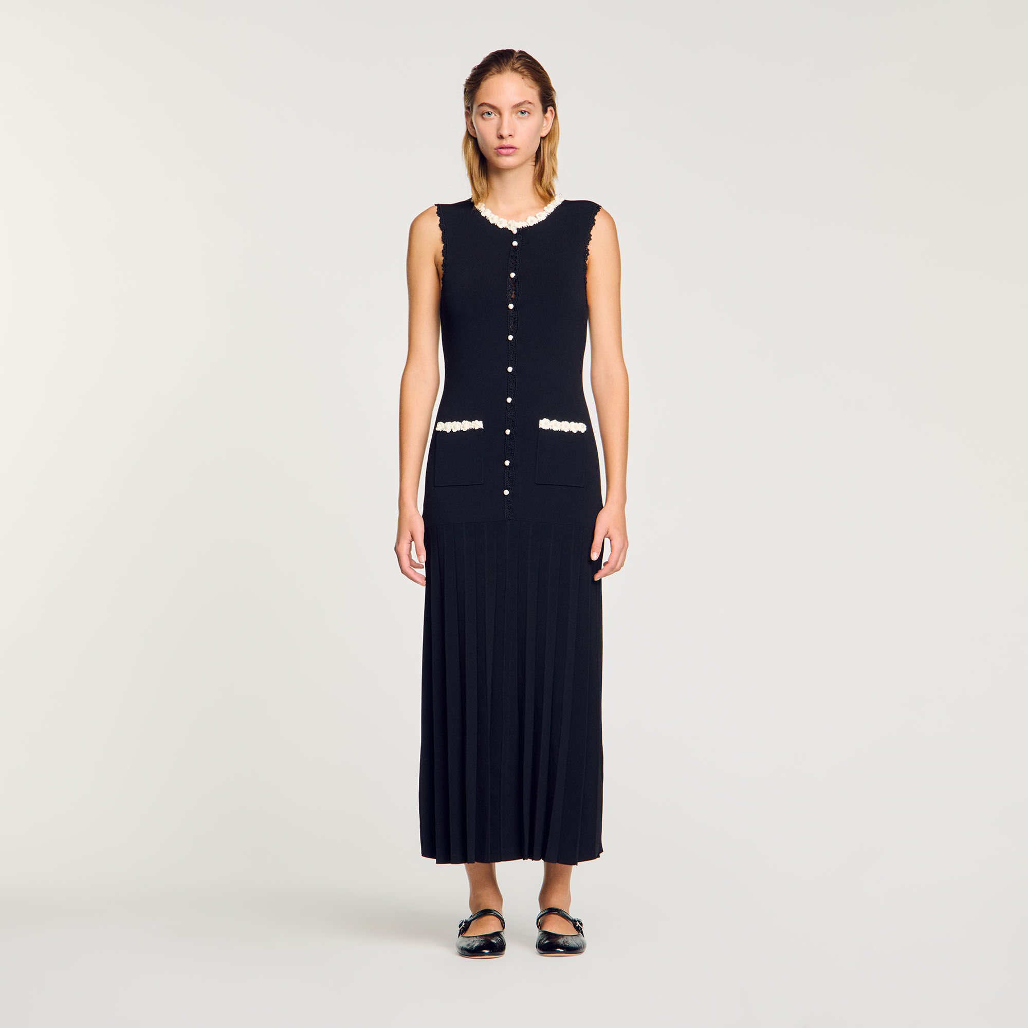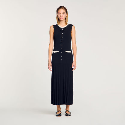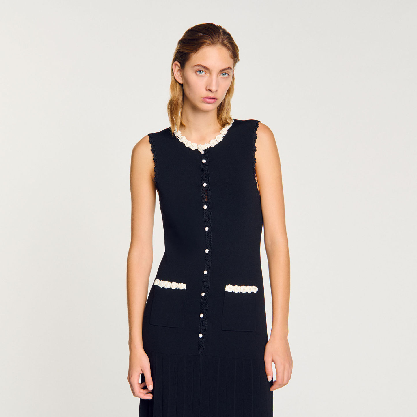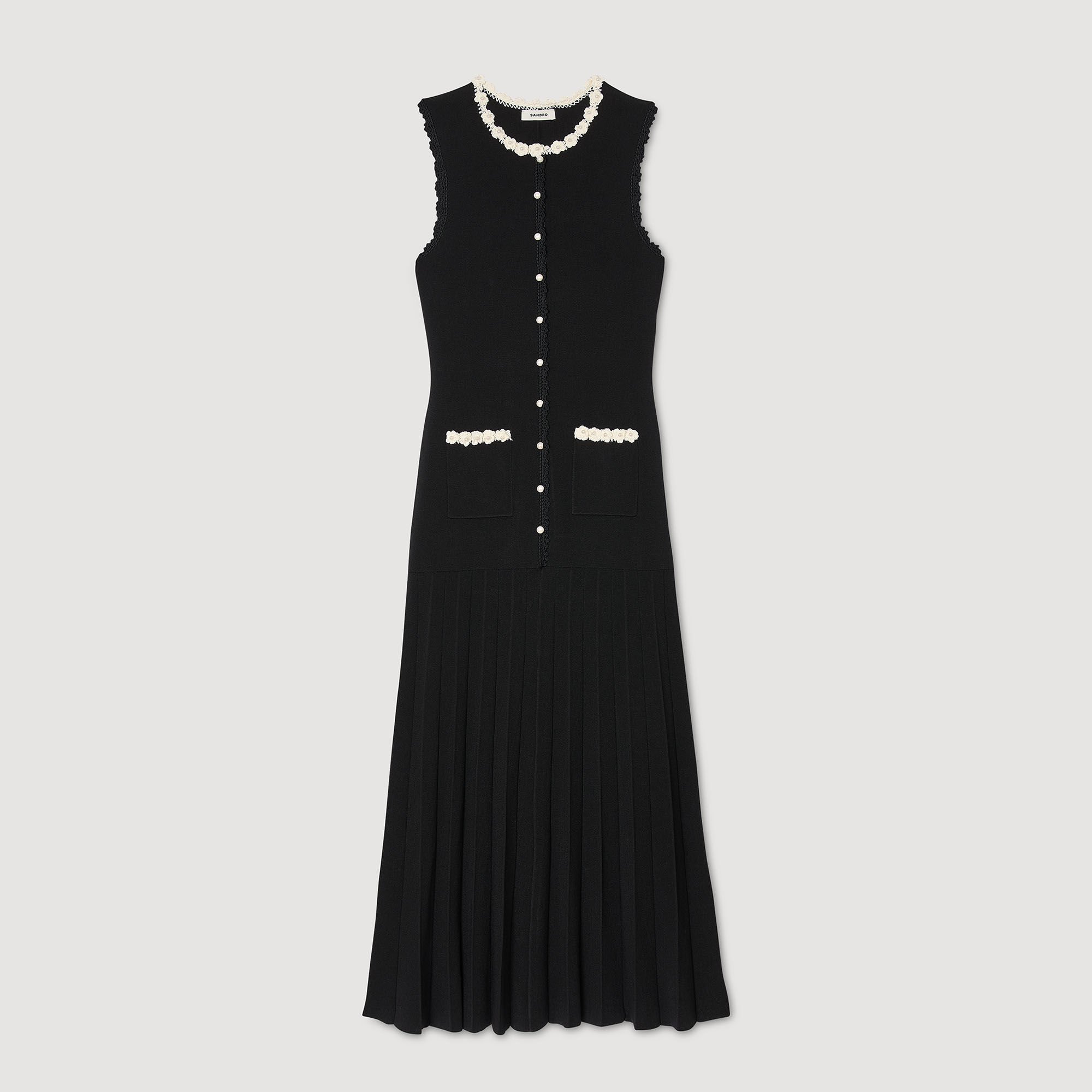 Sleeveless stretch-knit maxi dress with round neck, button placket, pleated skirt, patch pockets and contrasting crochet detailing on edges and pockets