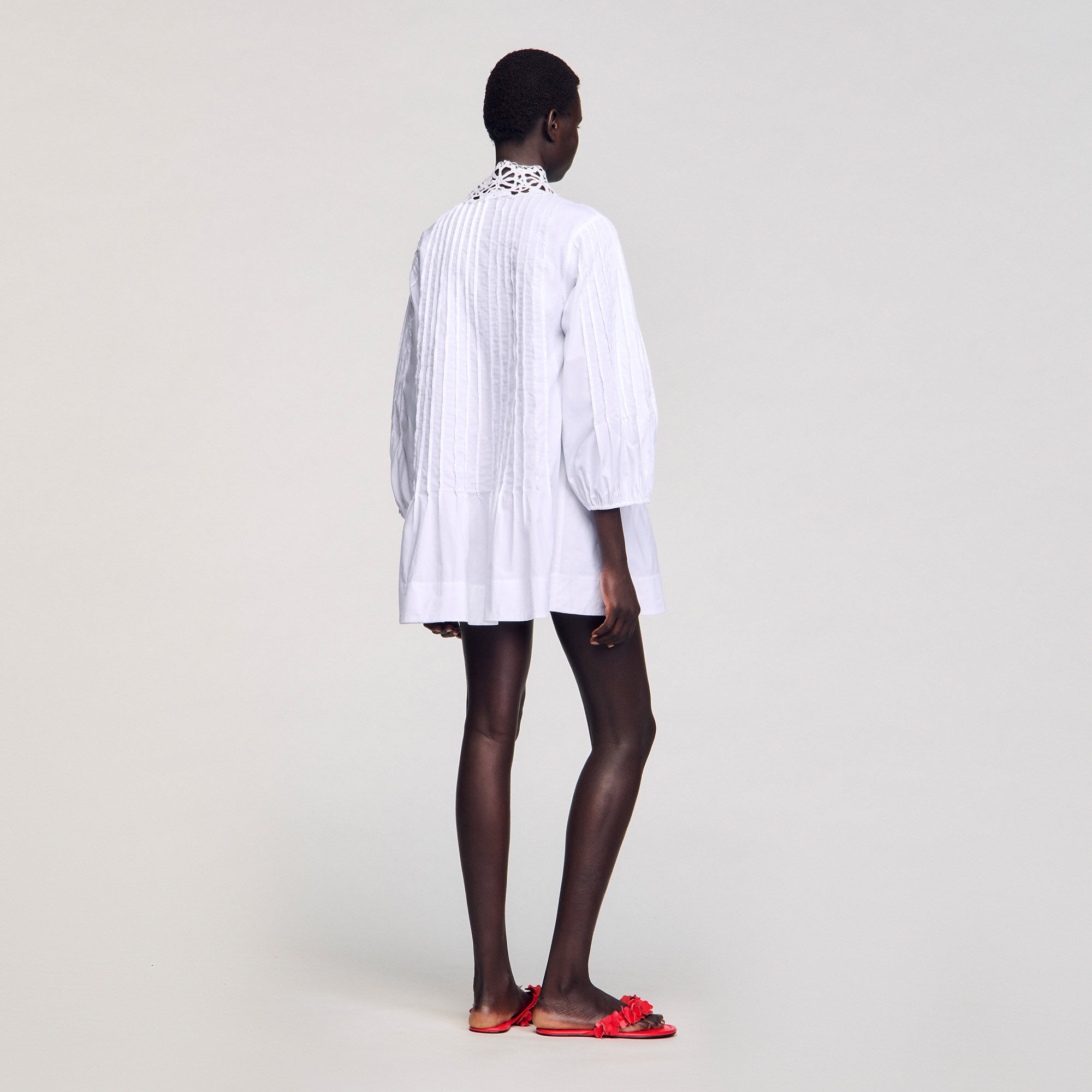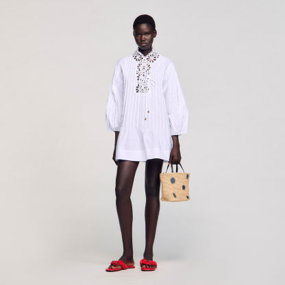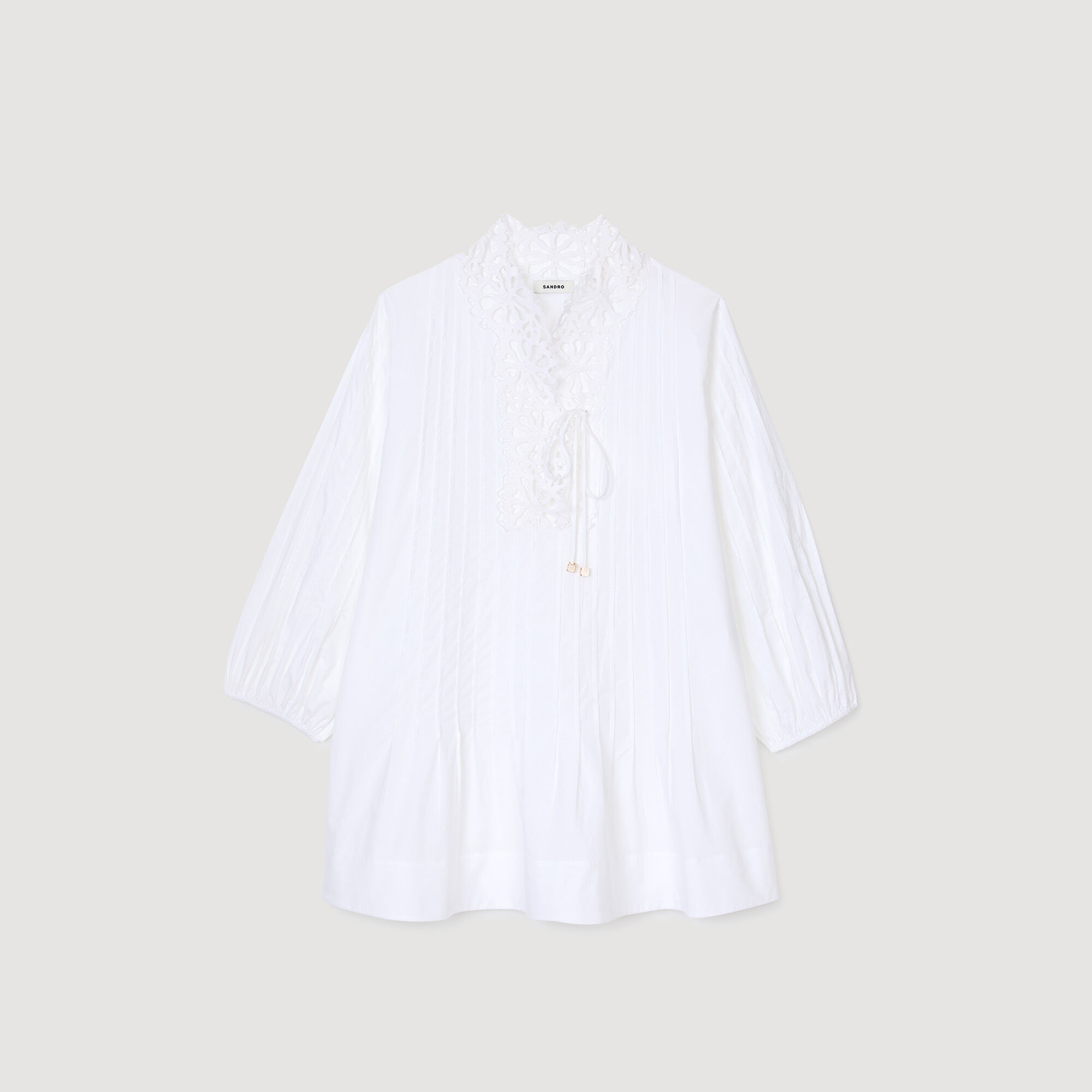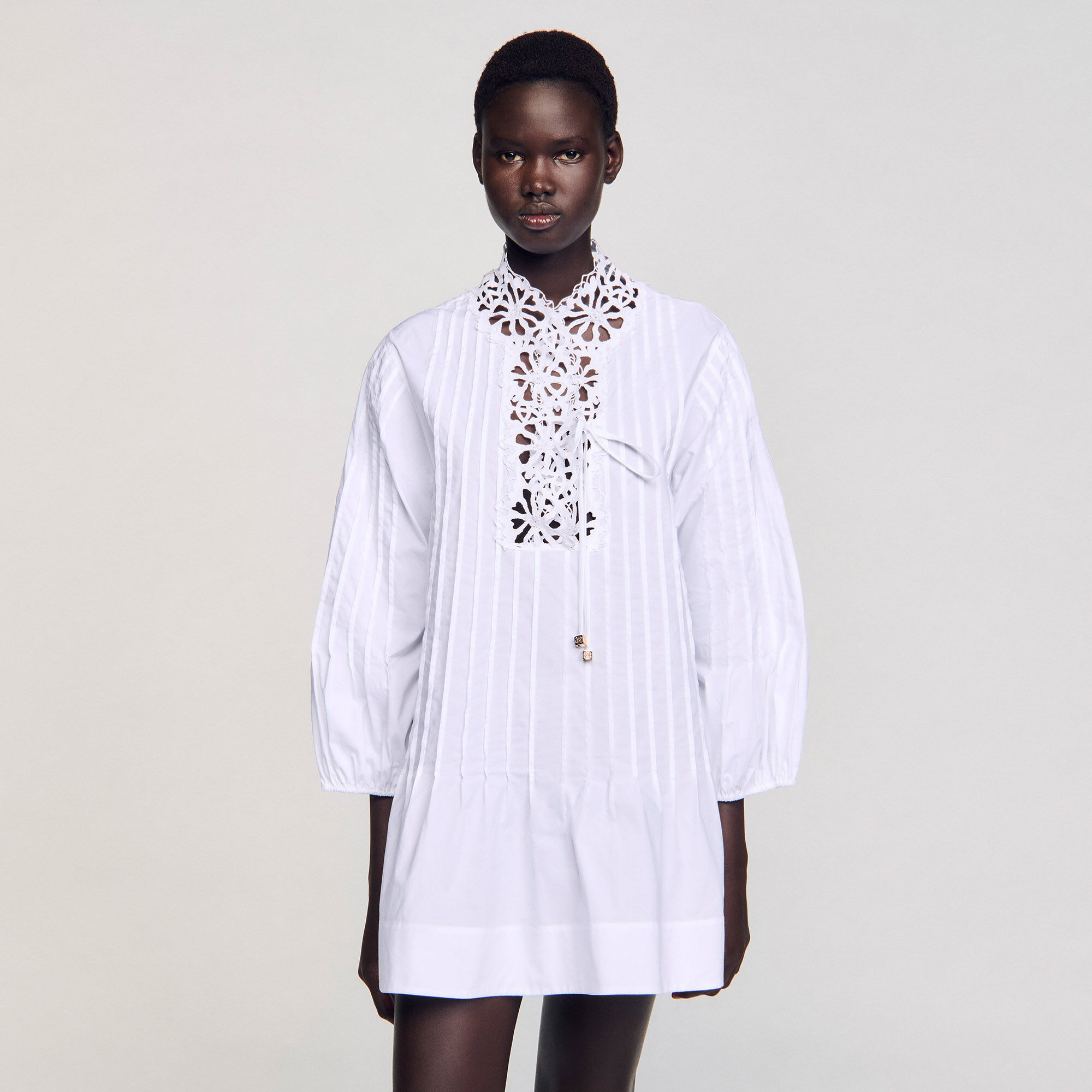 Long-sleeved pleated mini poplin dress with V-neck and lace.