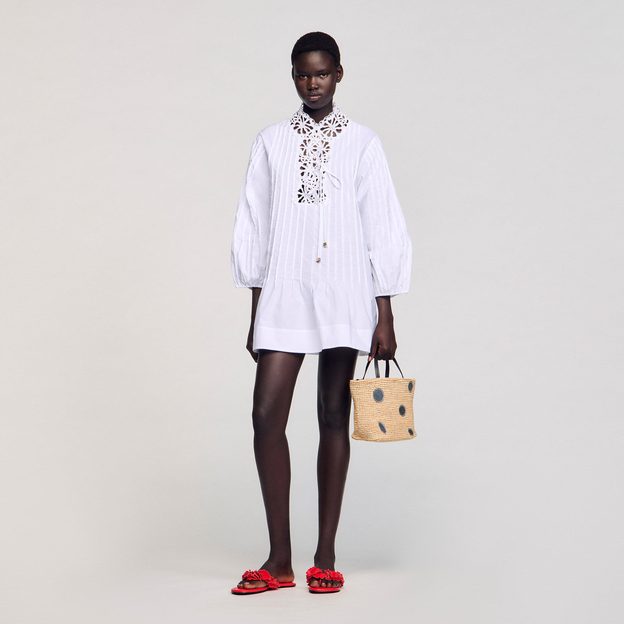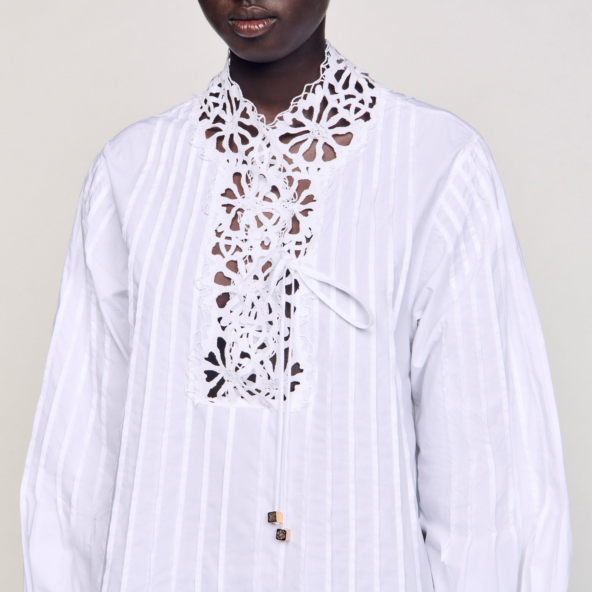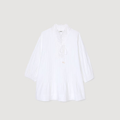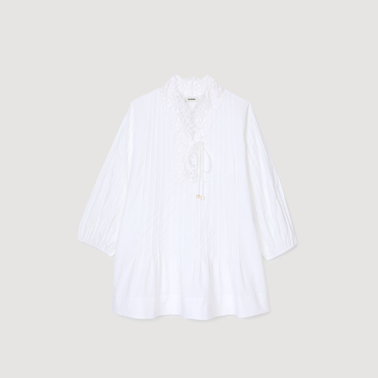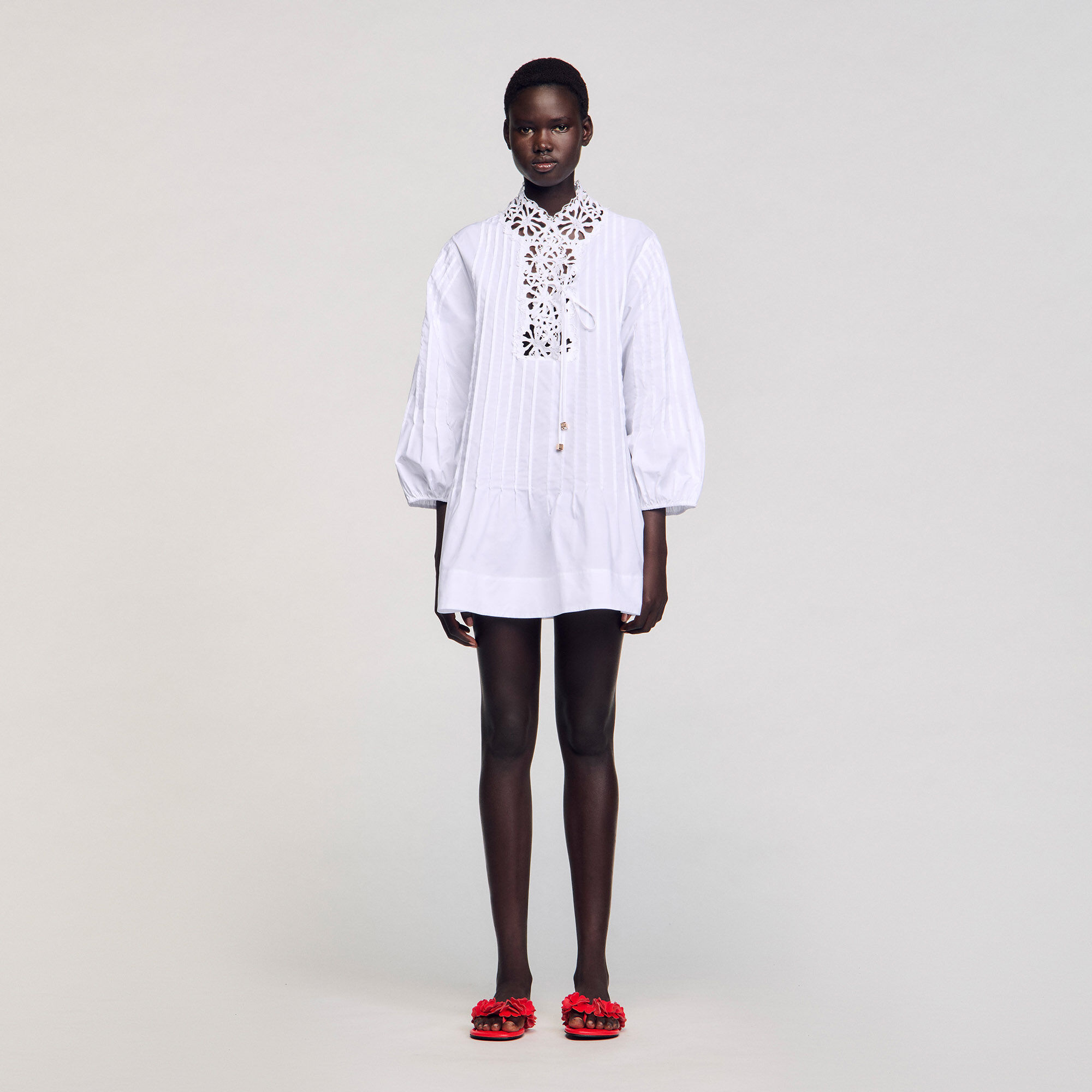 Long-sleeved pleated mini poplin dress with V-neck and lace.