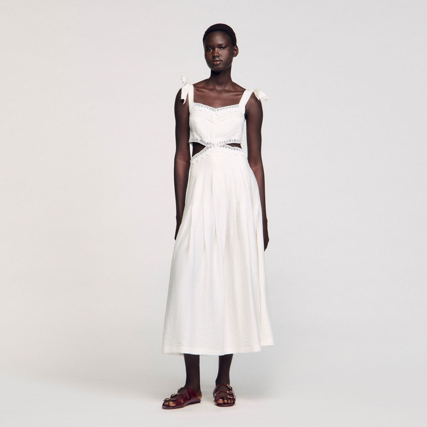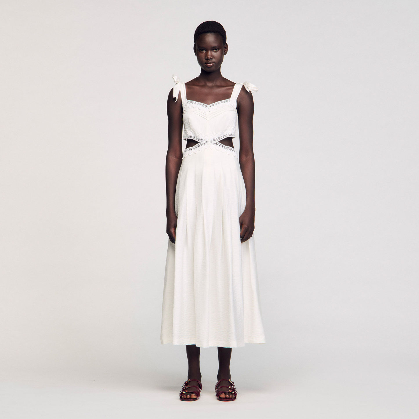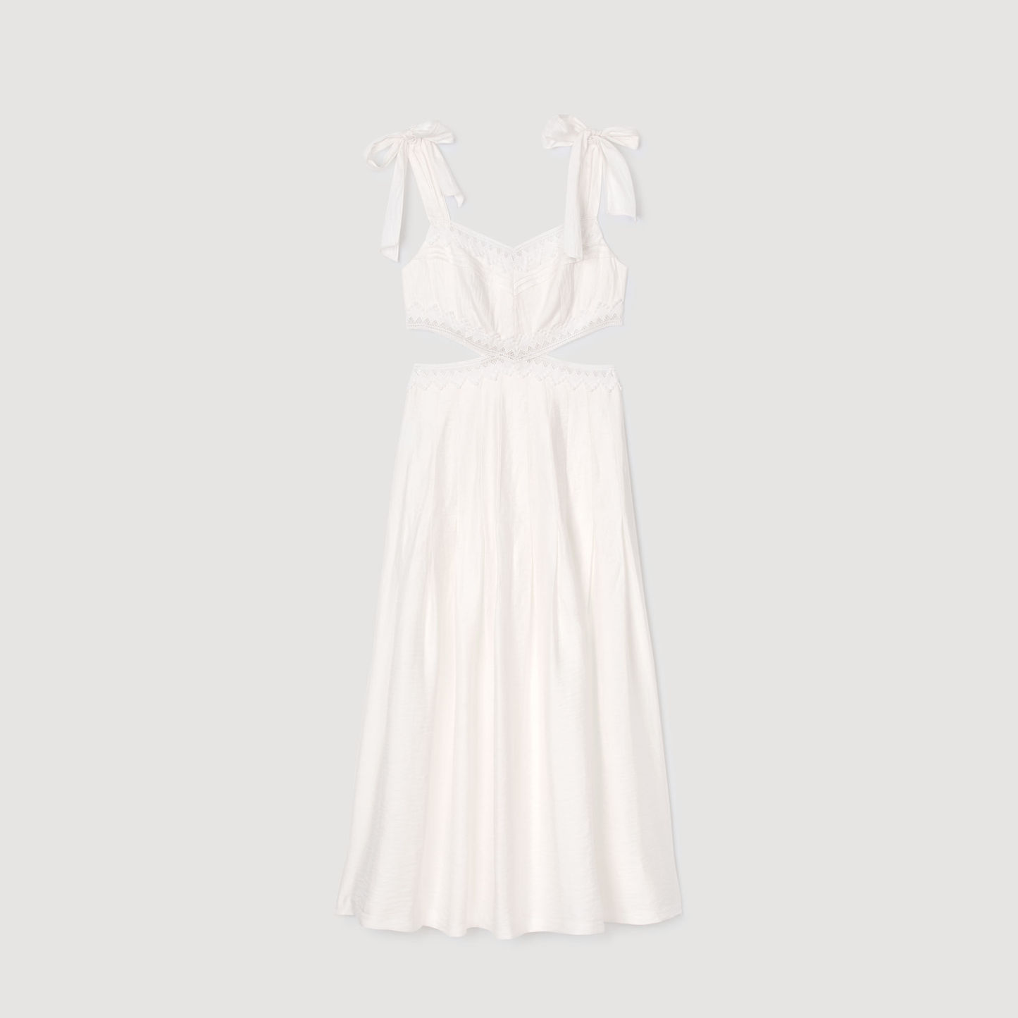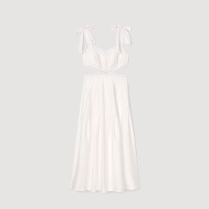 Long dress with tie straps, adorned with lace trims, and featuring side cutouts.