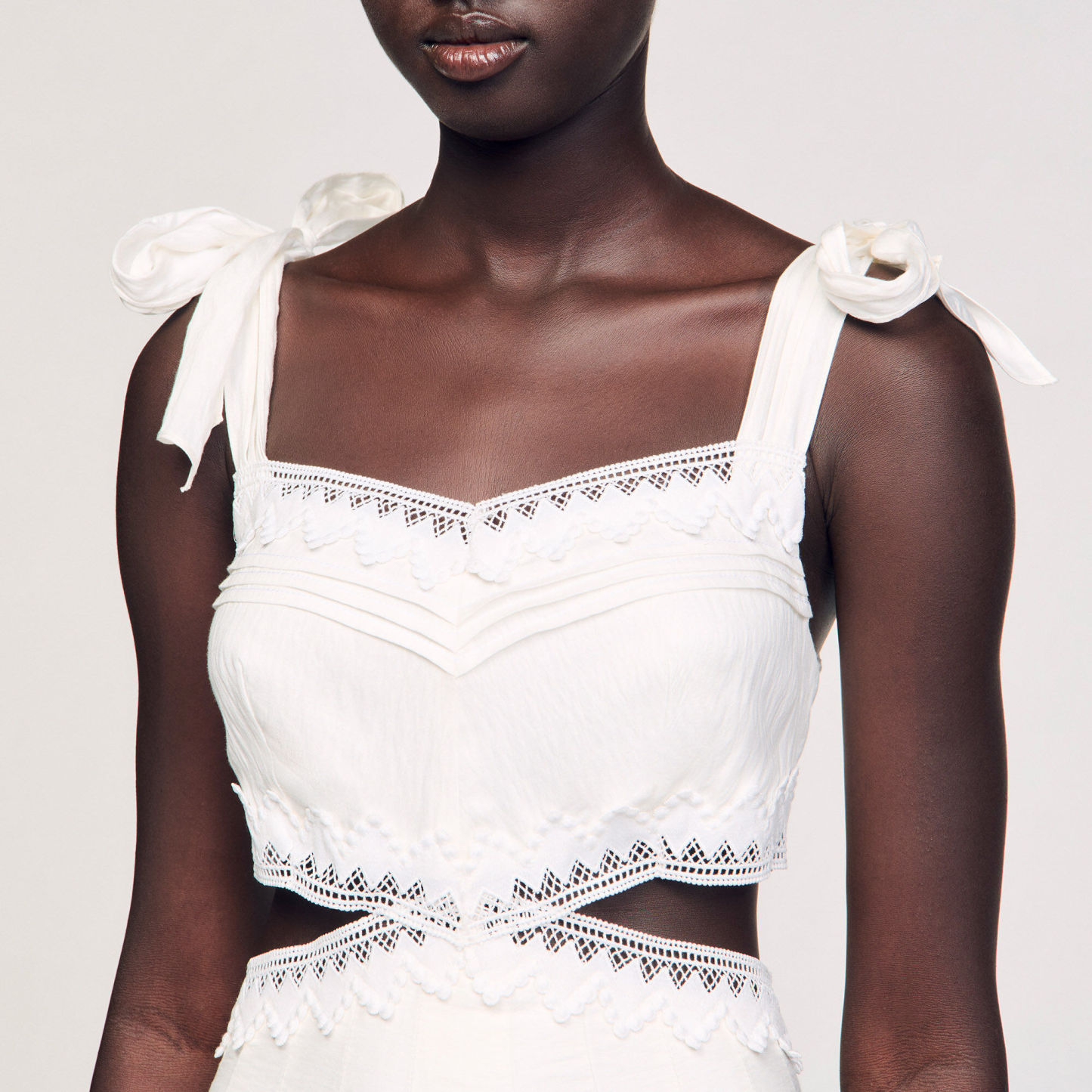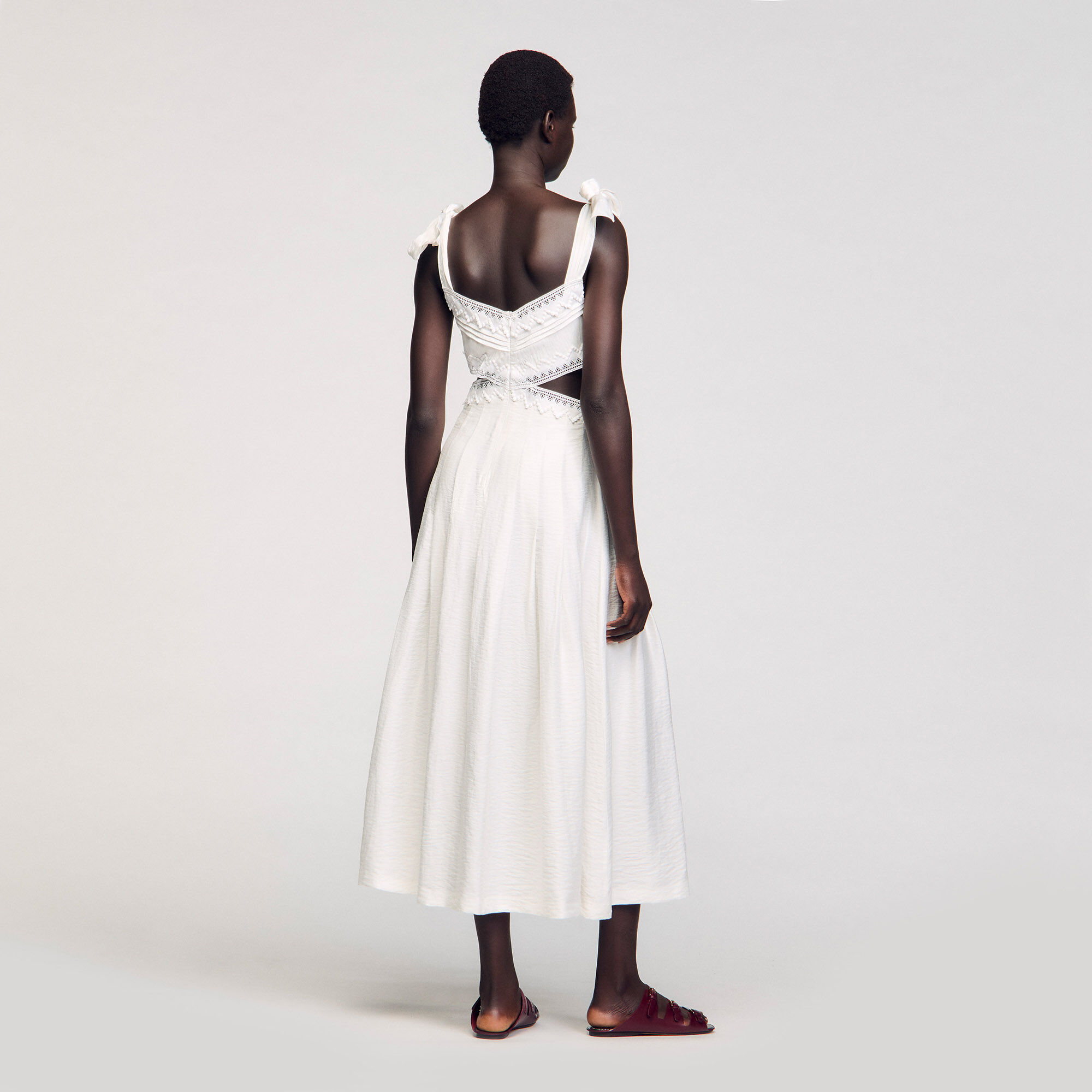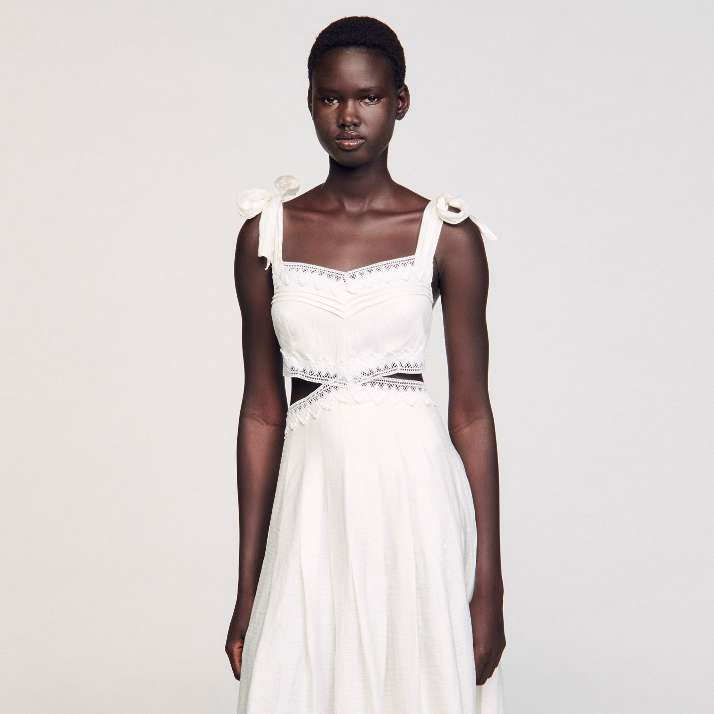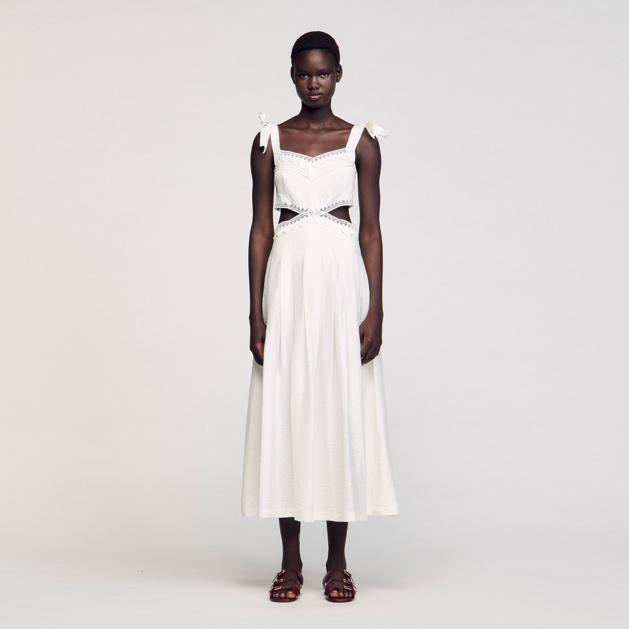 Long dress with tie straps, adorned with lace trims, and featuring side cutouts.