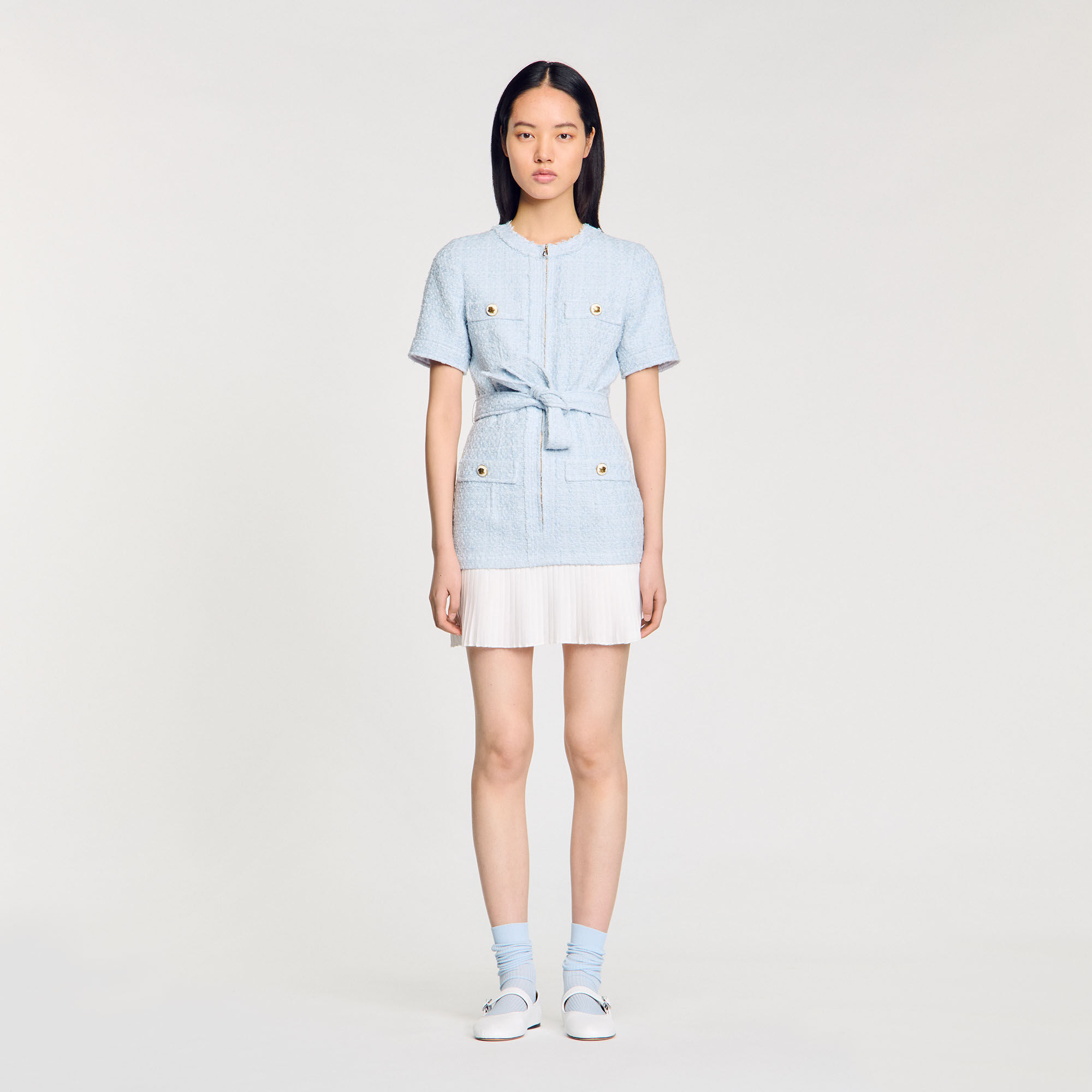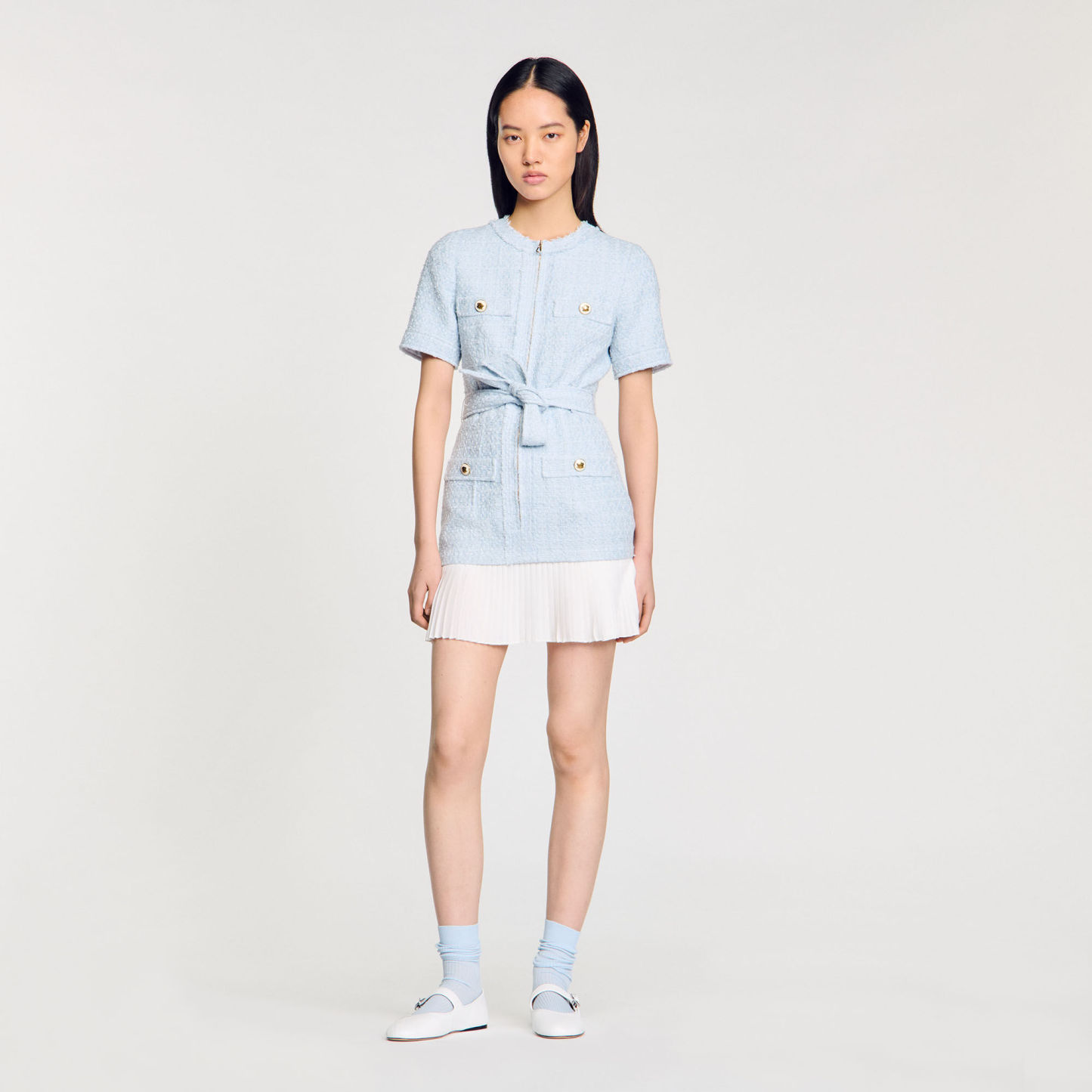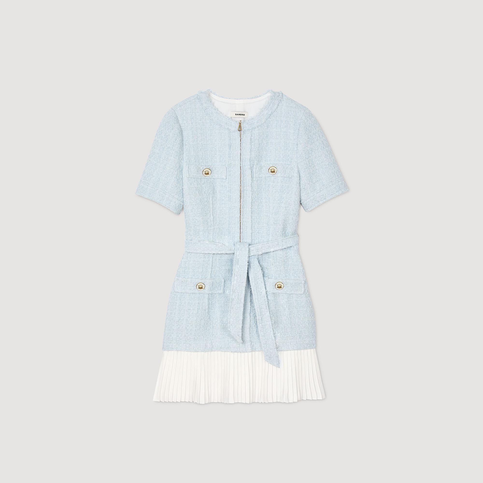 Short-sleeved, round-neck tweed dress with contrasting pleated bottom, buttoned welt pockets and removable waist belt.