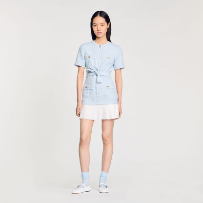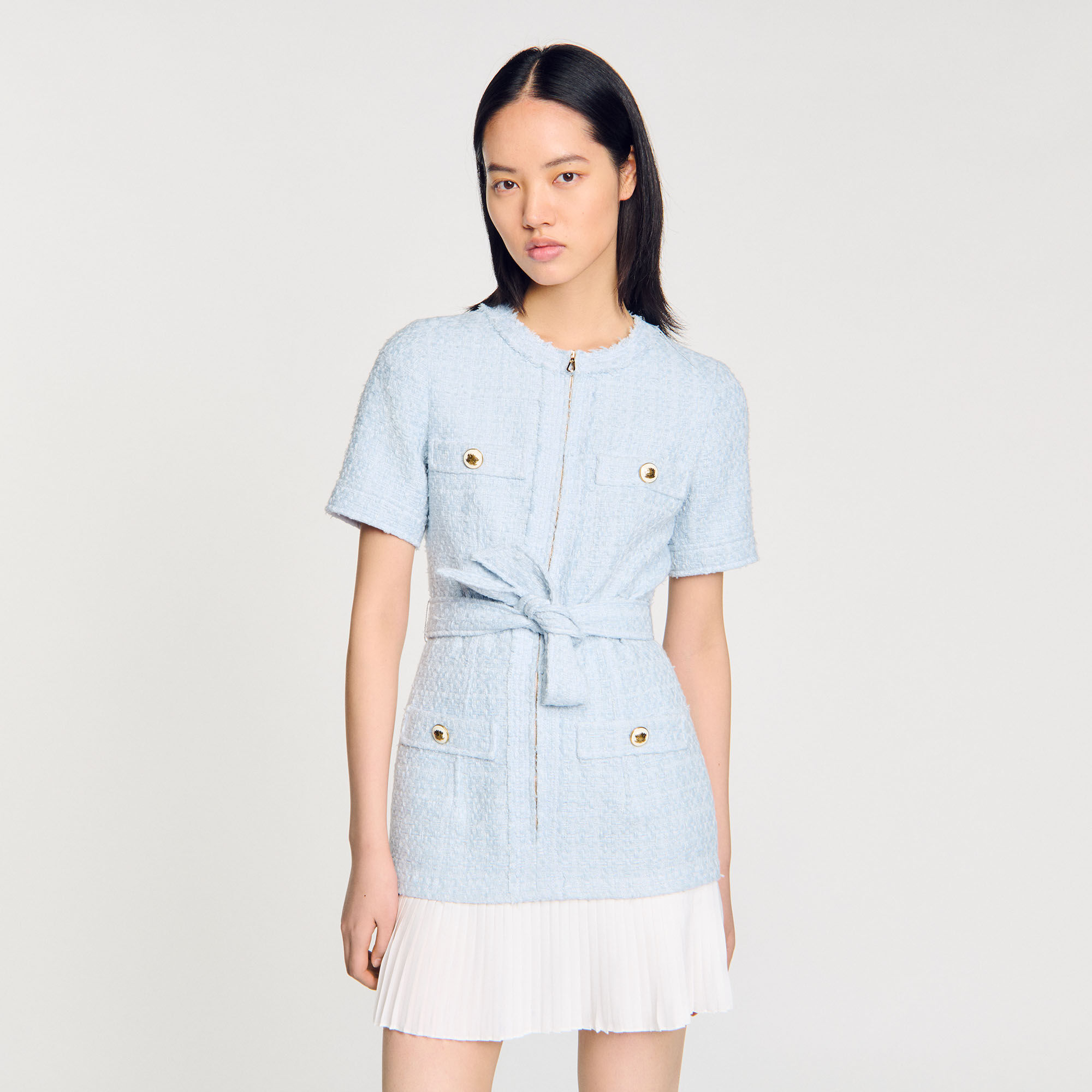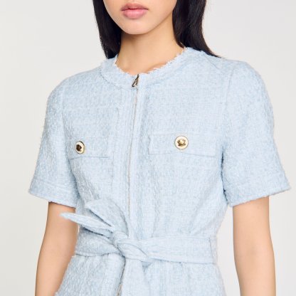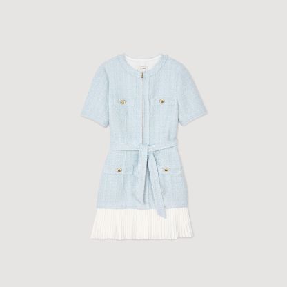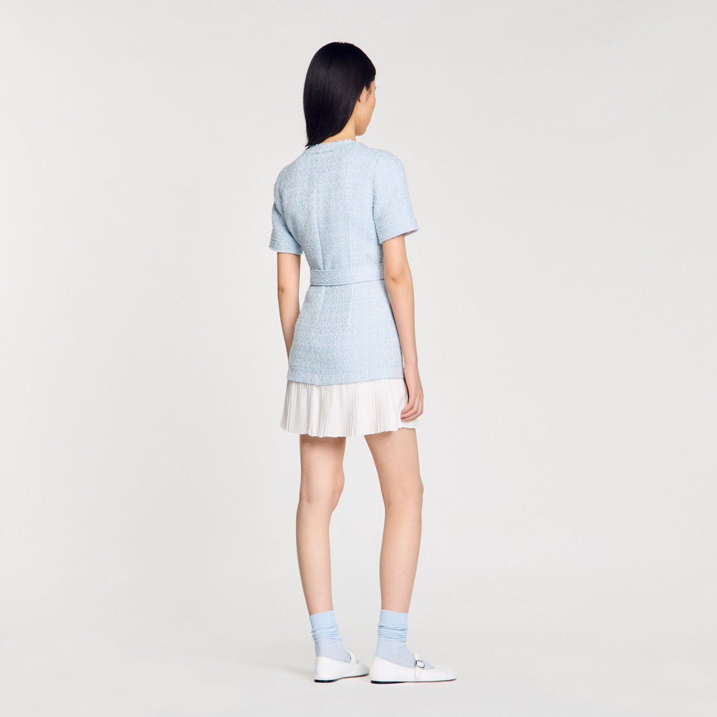 Short-sleeved, round-neck tweed dress with contrasting pleated bottom, buttoned welt pockets and removable waist belt.