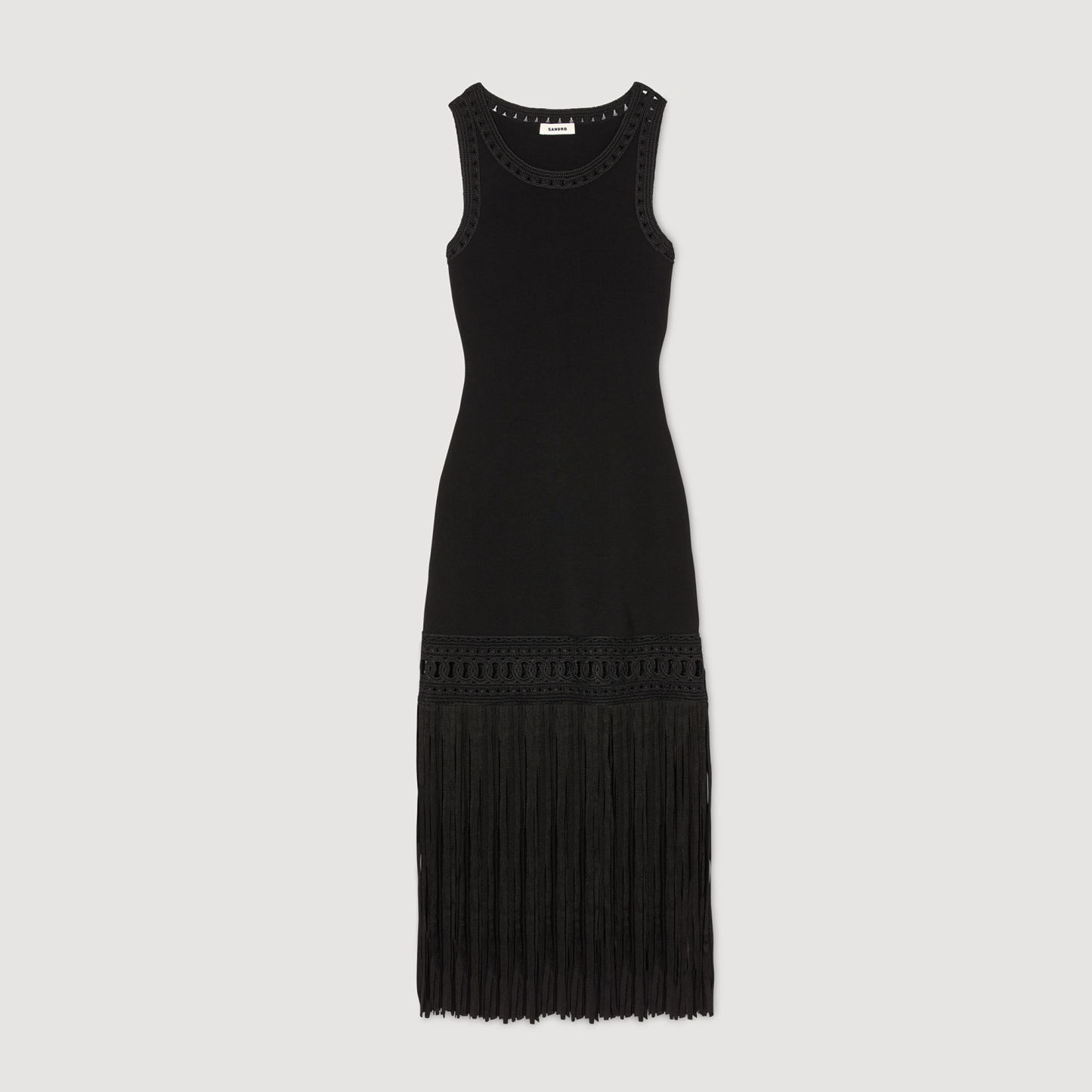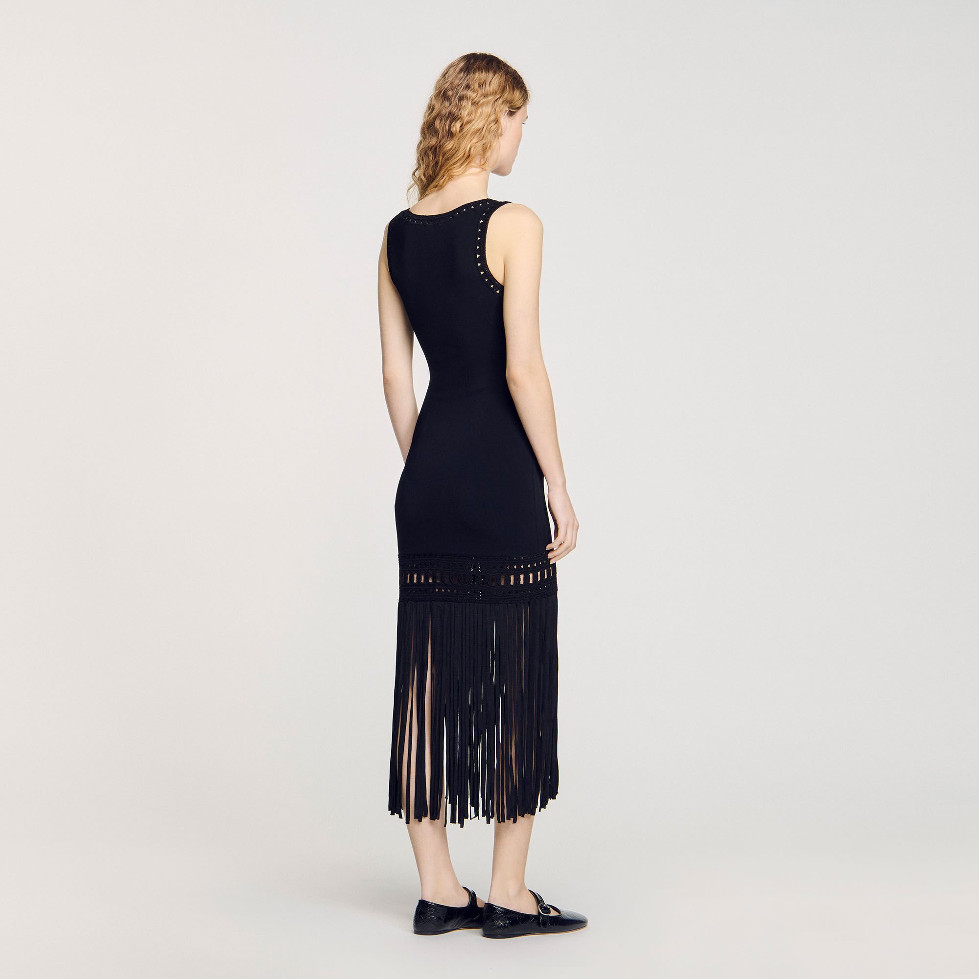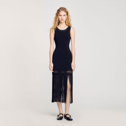 Sleeveless round-neck knit dress with fringed bottom.