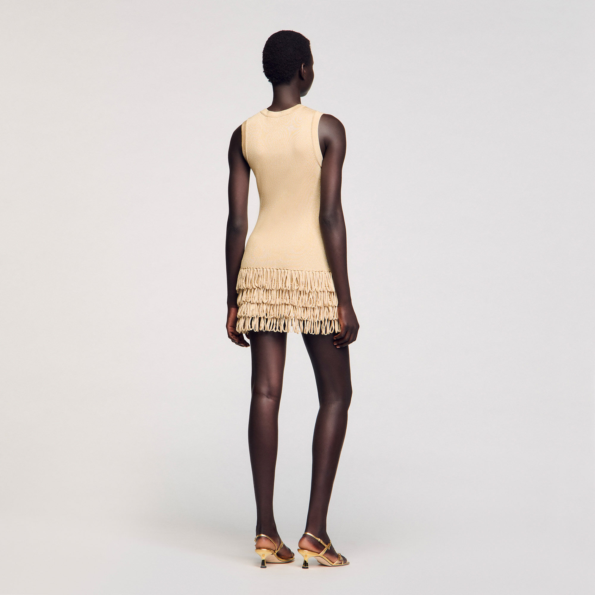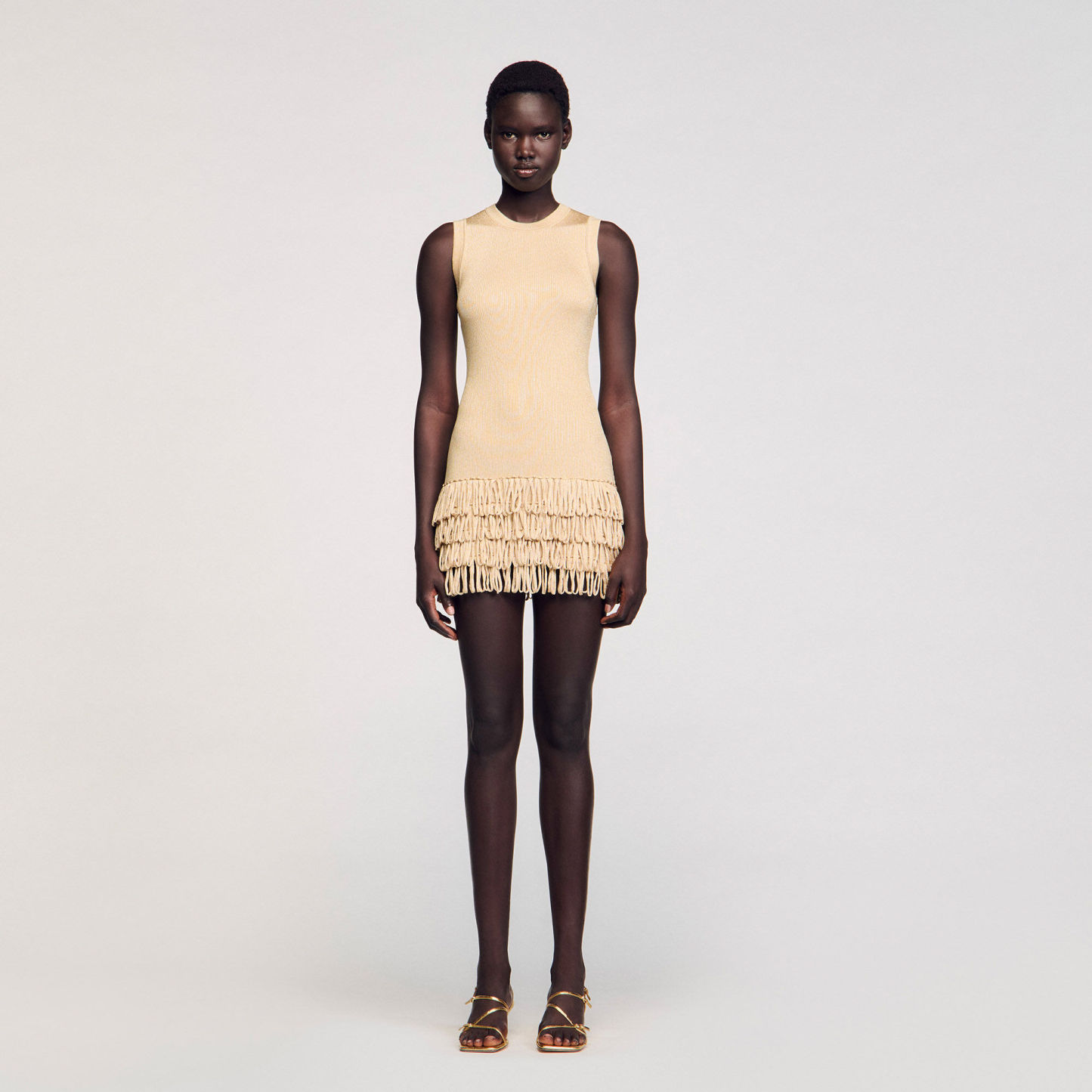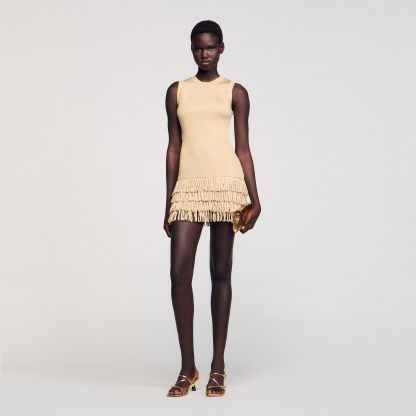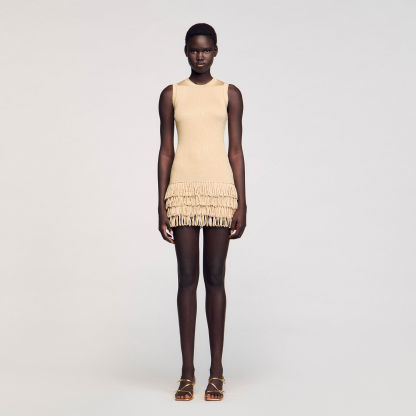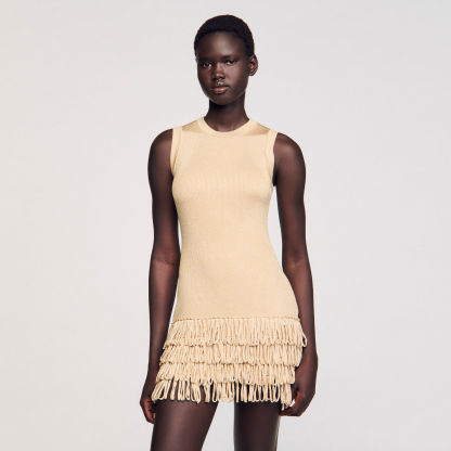 Mini shimmer knit dress with a round neck and layered fringes on the bottom of the skirt.