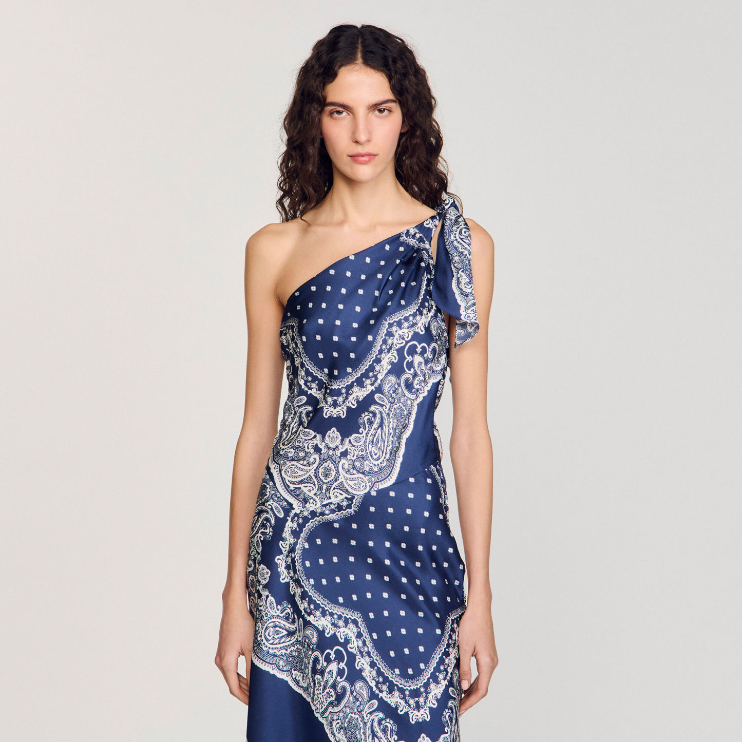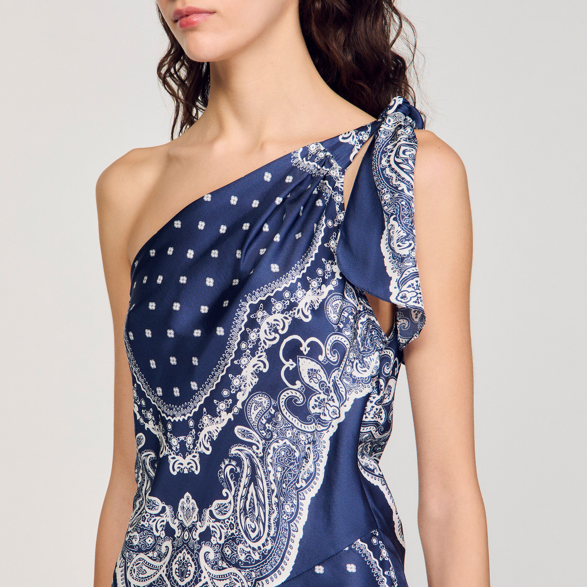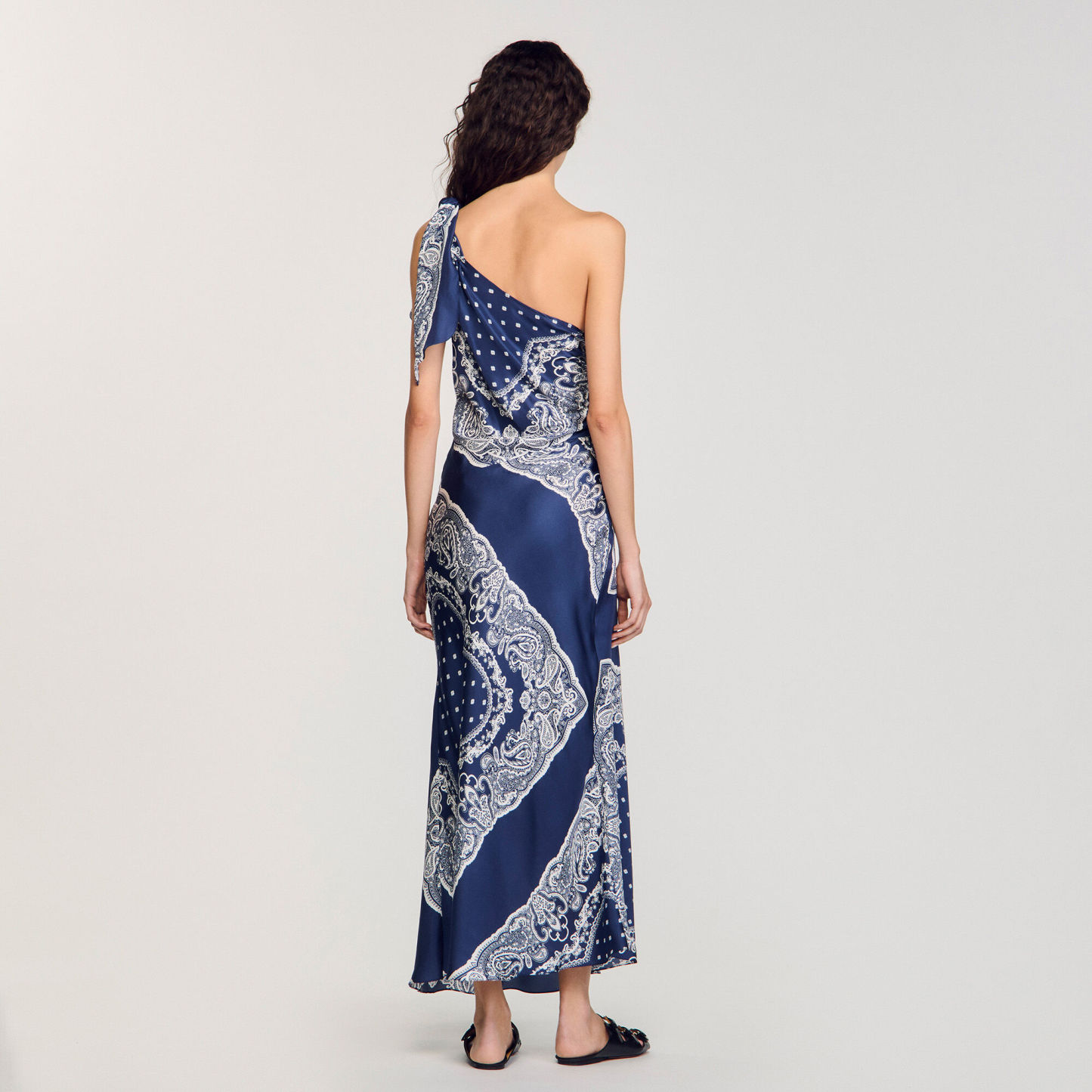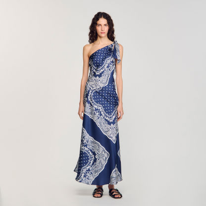 Satin-effect bandana print maxi dress with asymmetrical tied shoulder strap and slightly flared skirt.