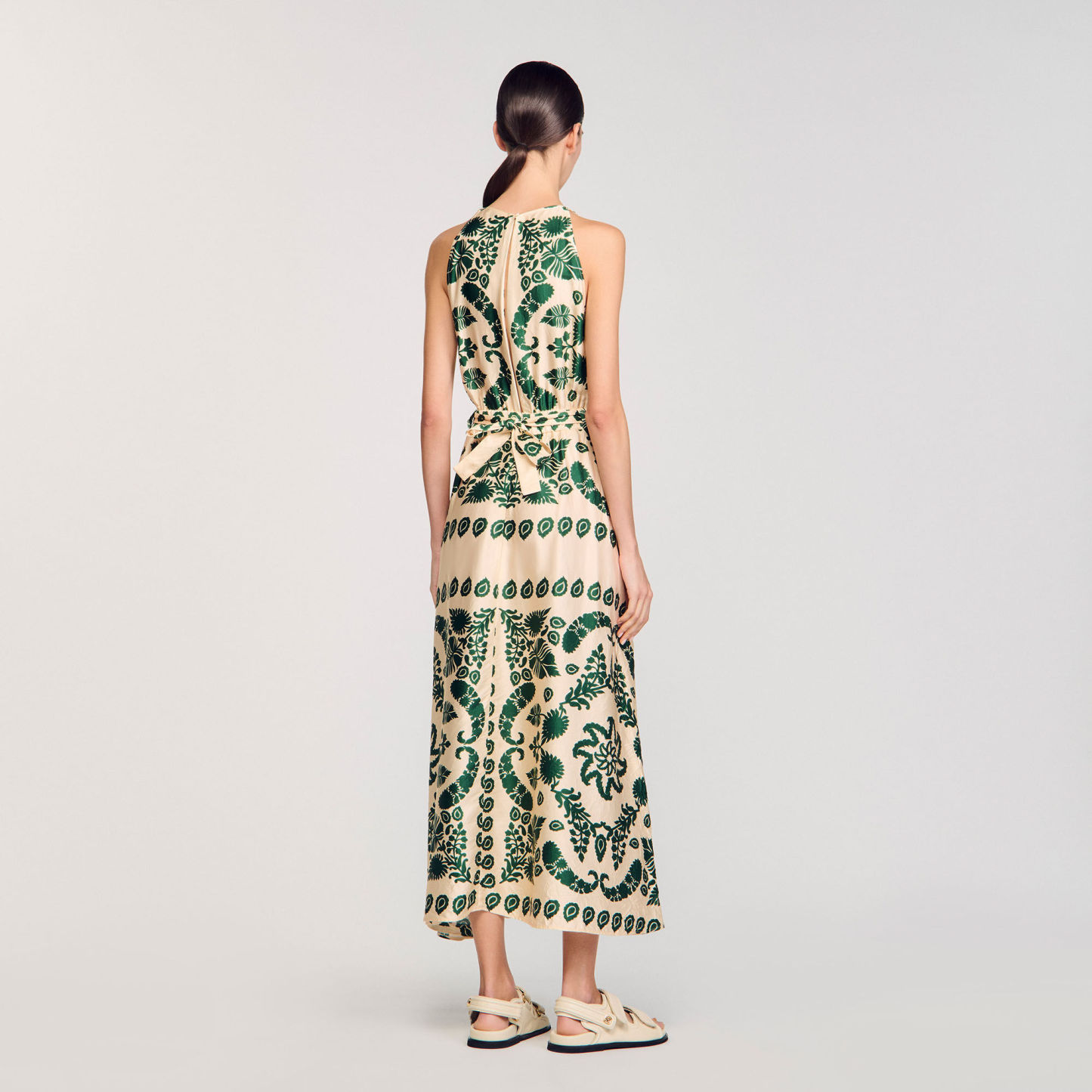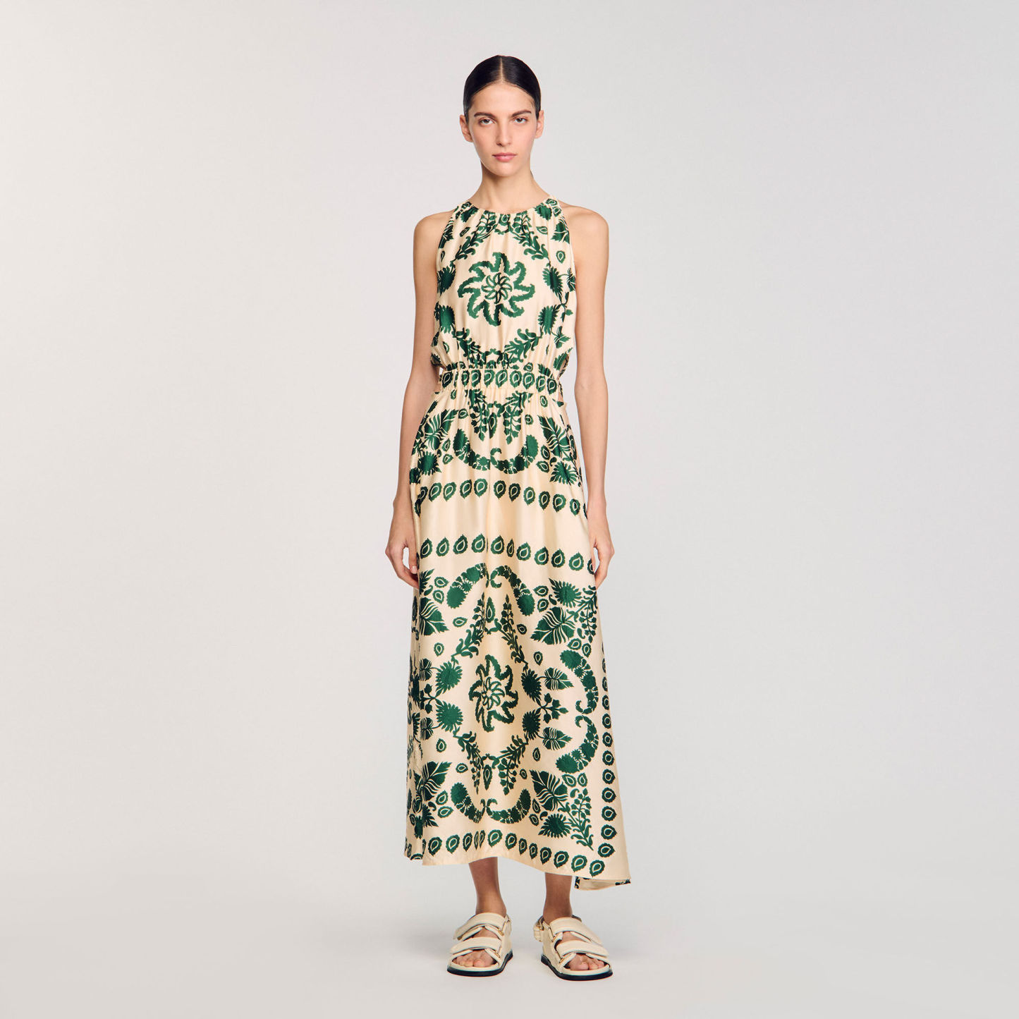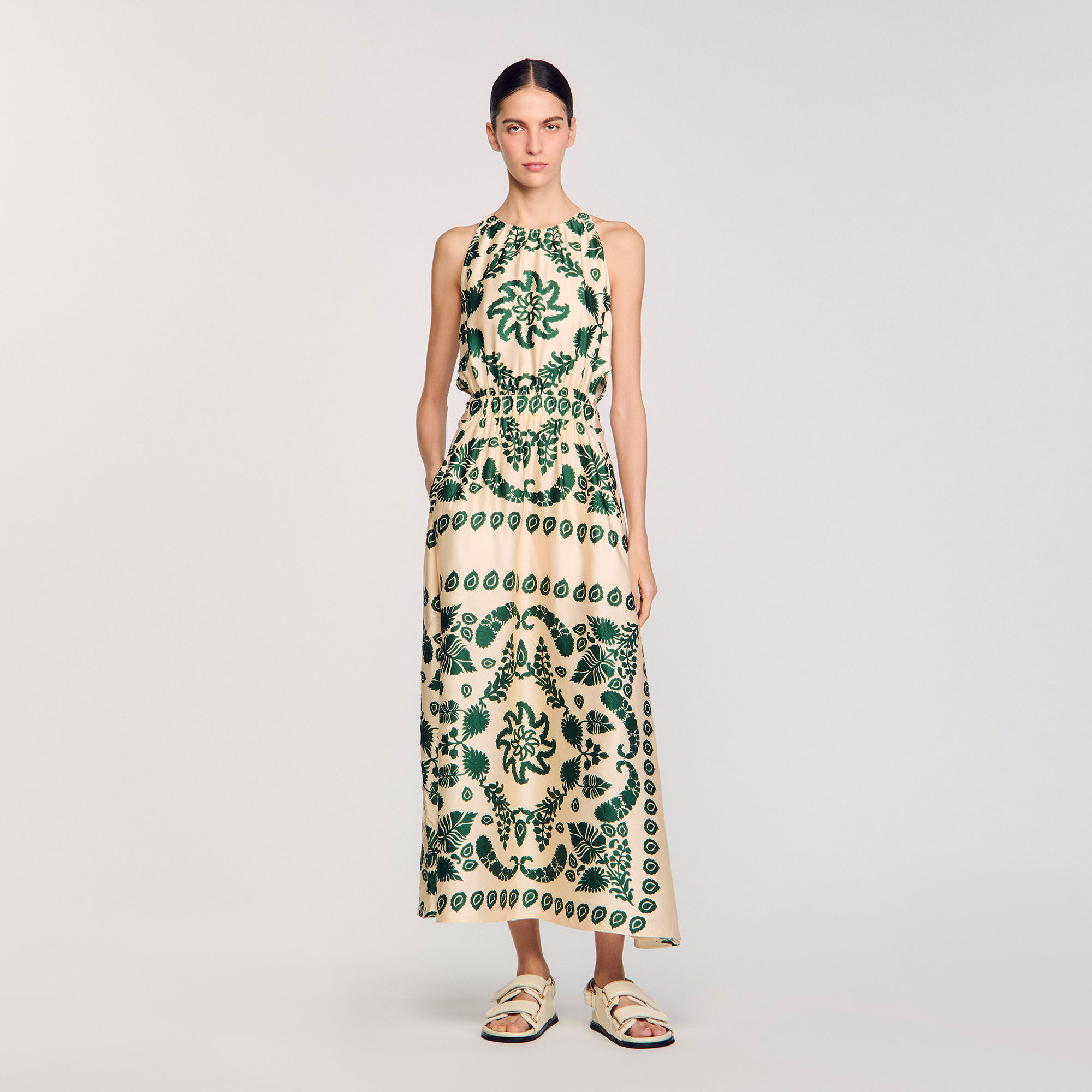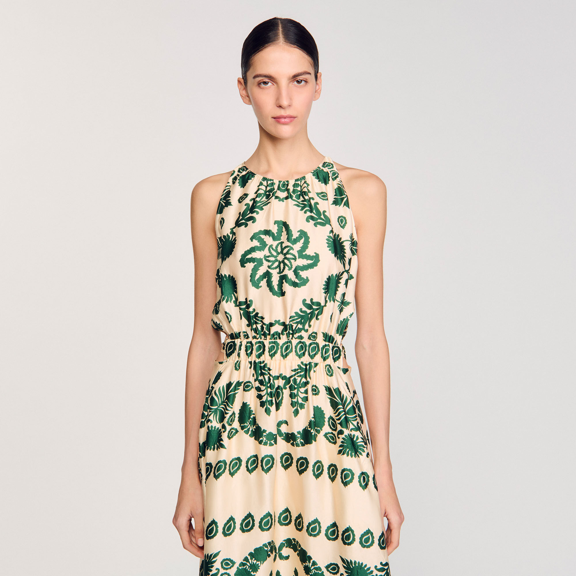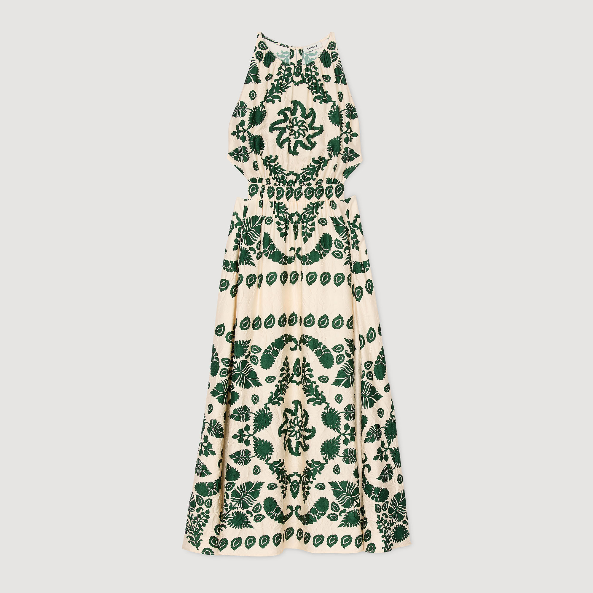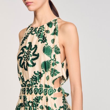 Sleeveless satin-effect maxi dress with leaf motif, round neckline, cutout sides and slightly flared skirt.