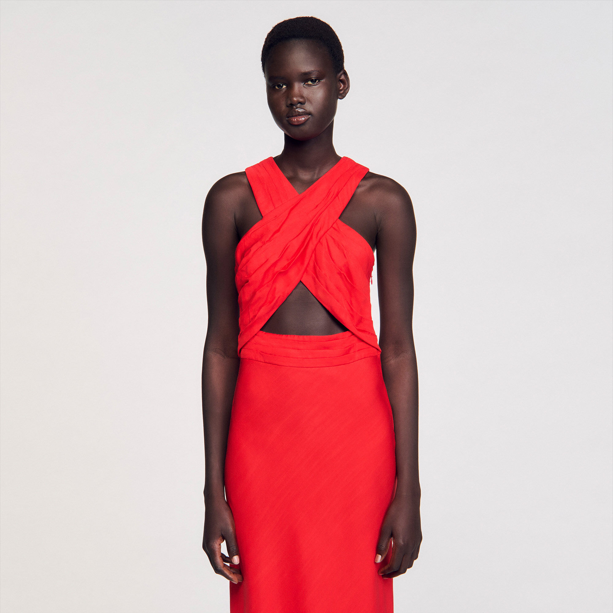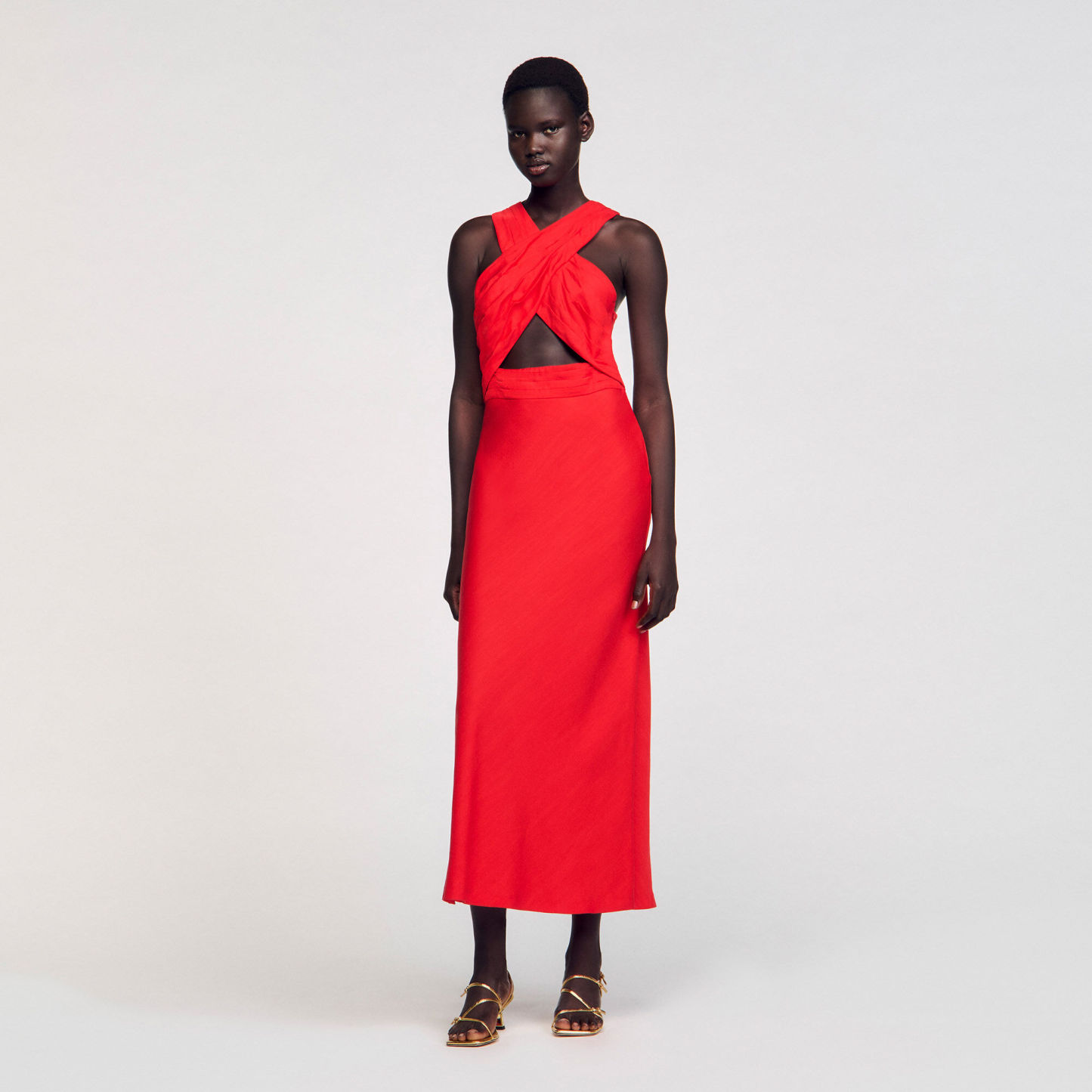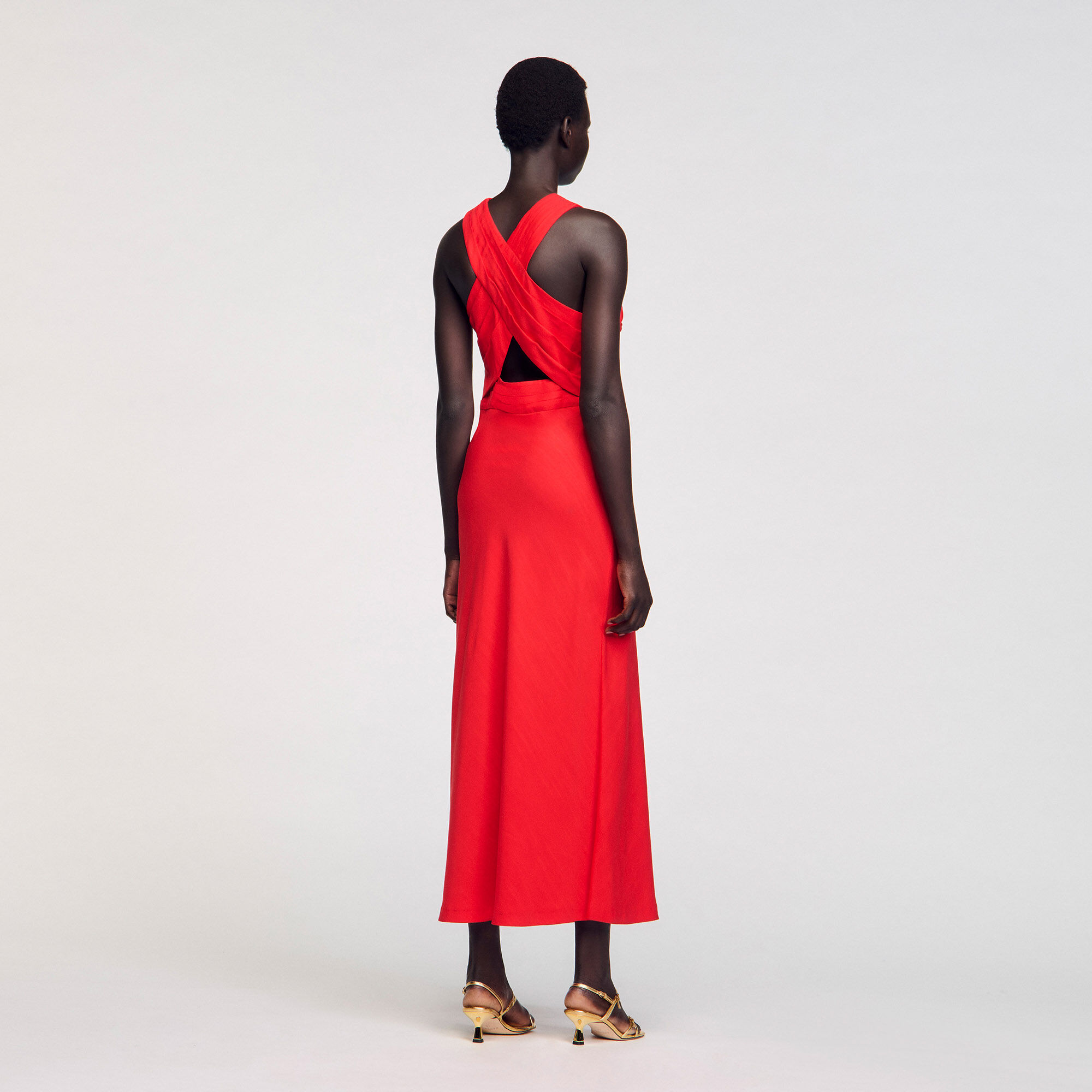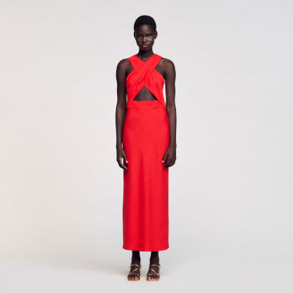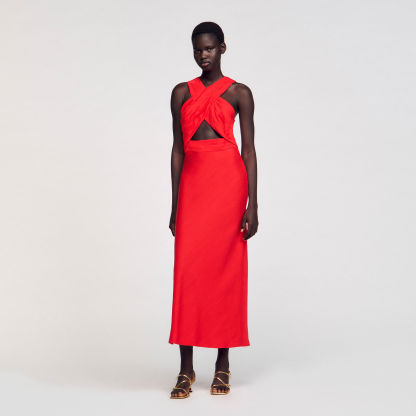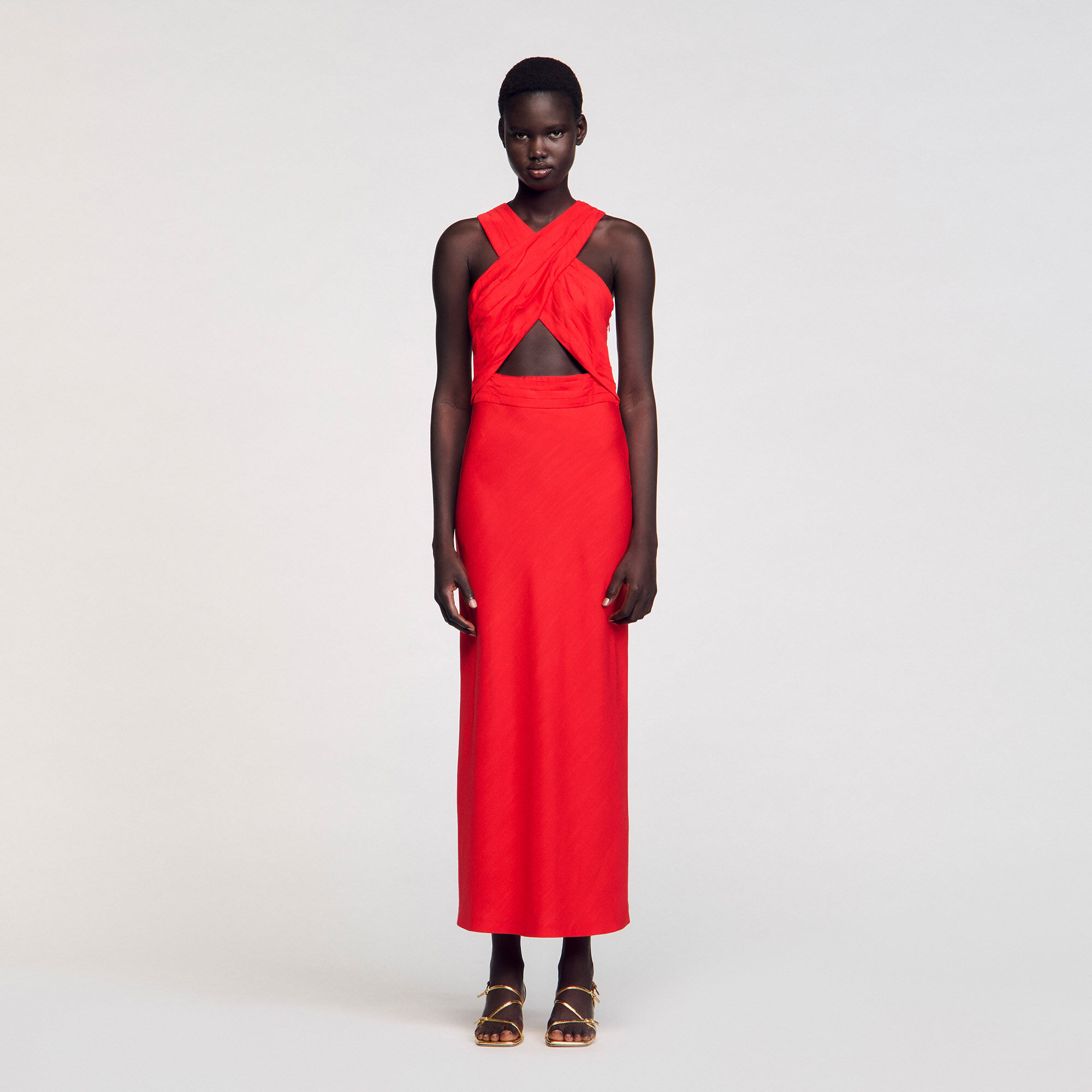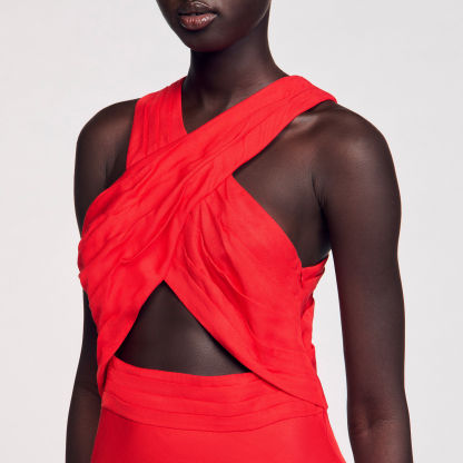 Sleeveless maxi dress with a crossed front and opening, featuring pleats on the top.