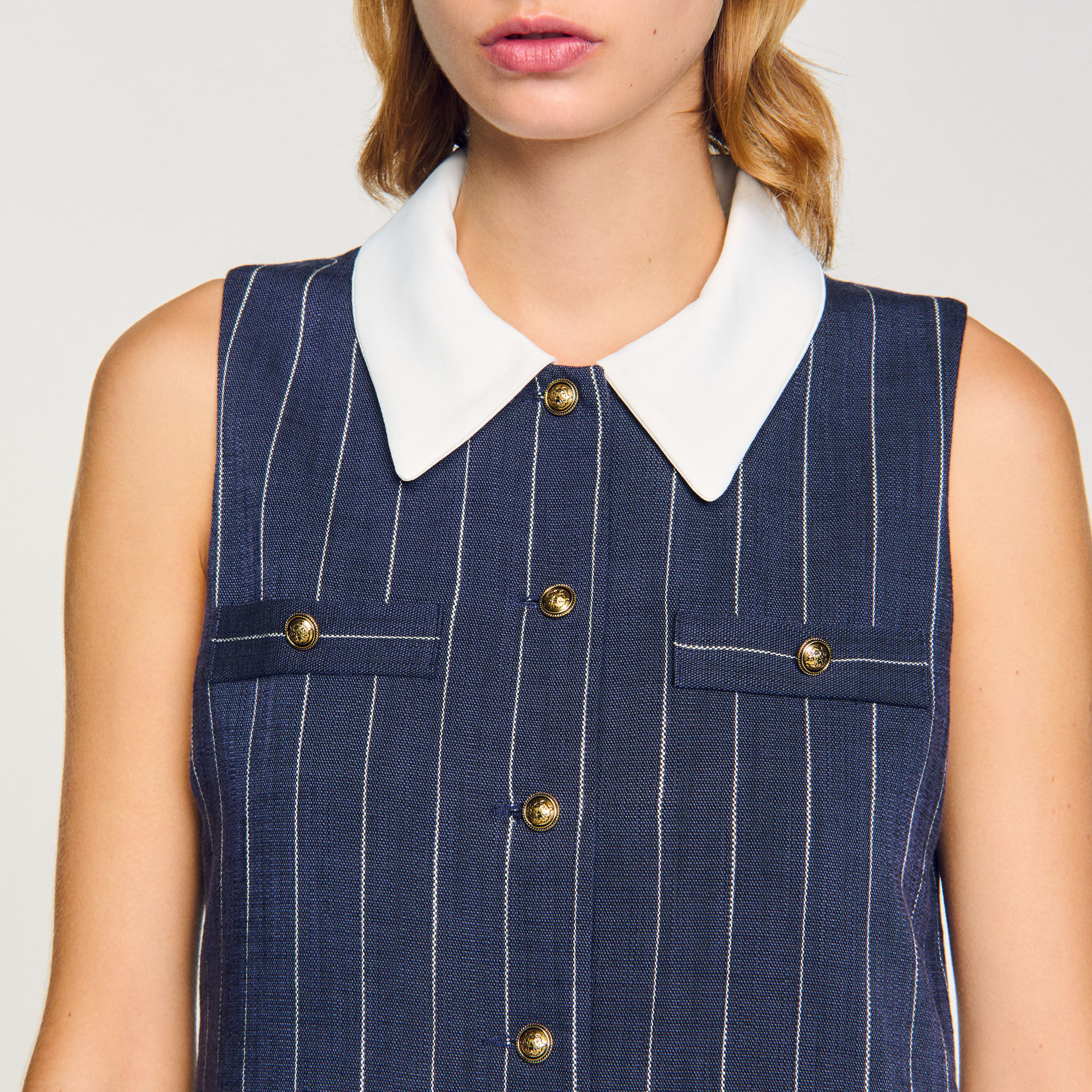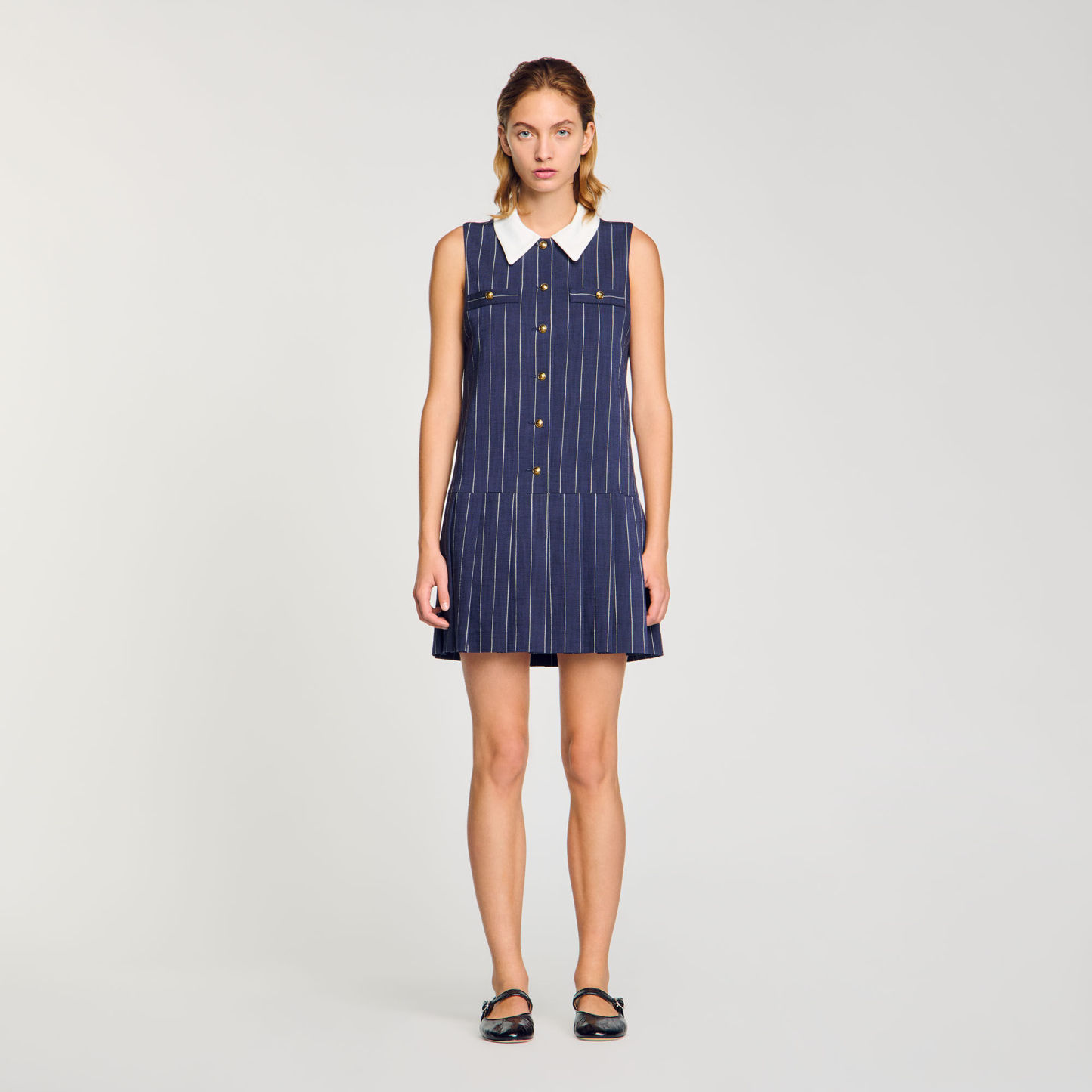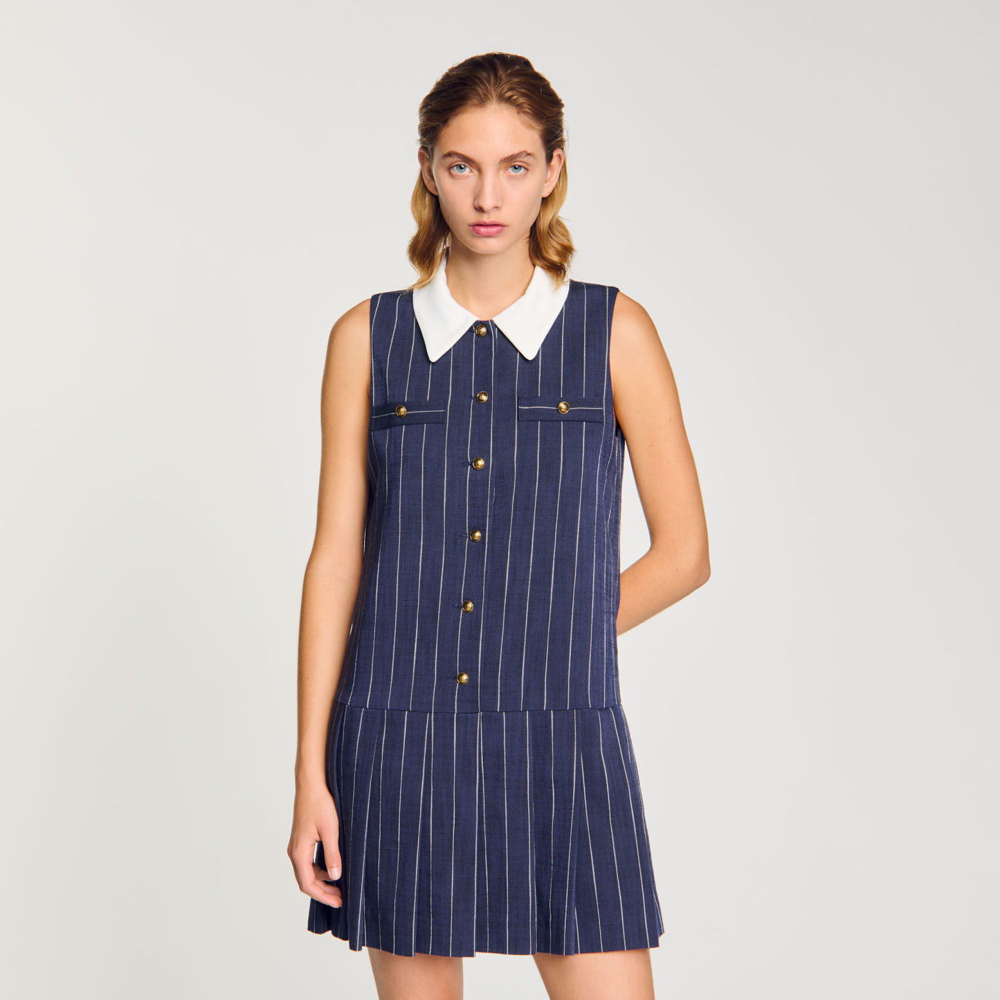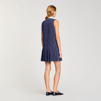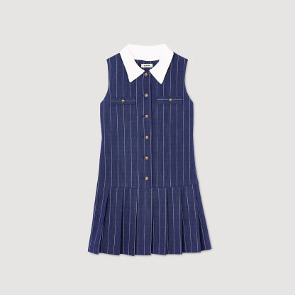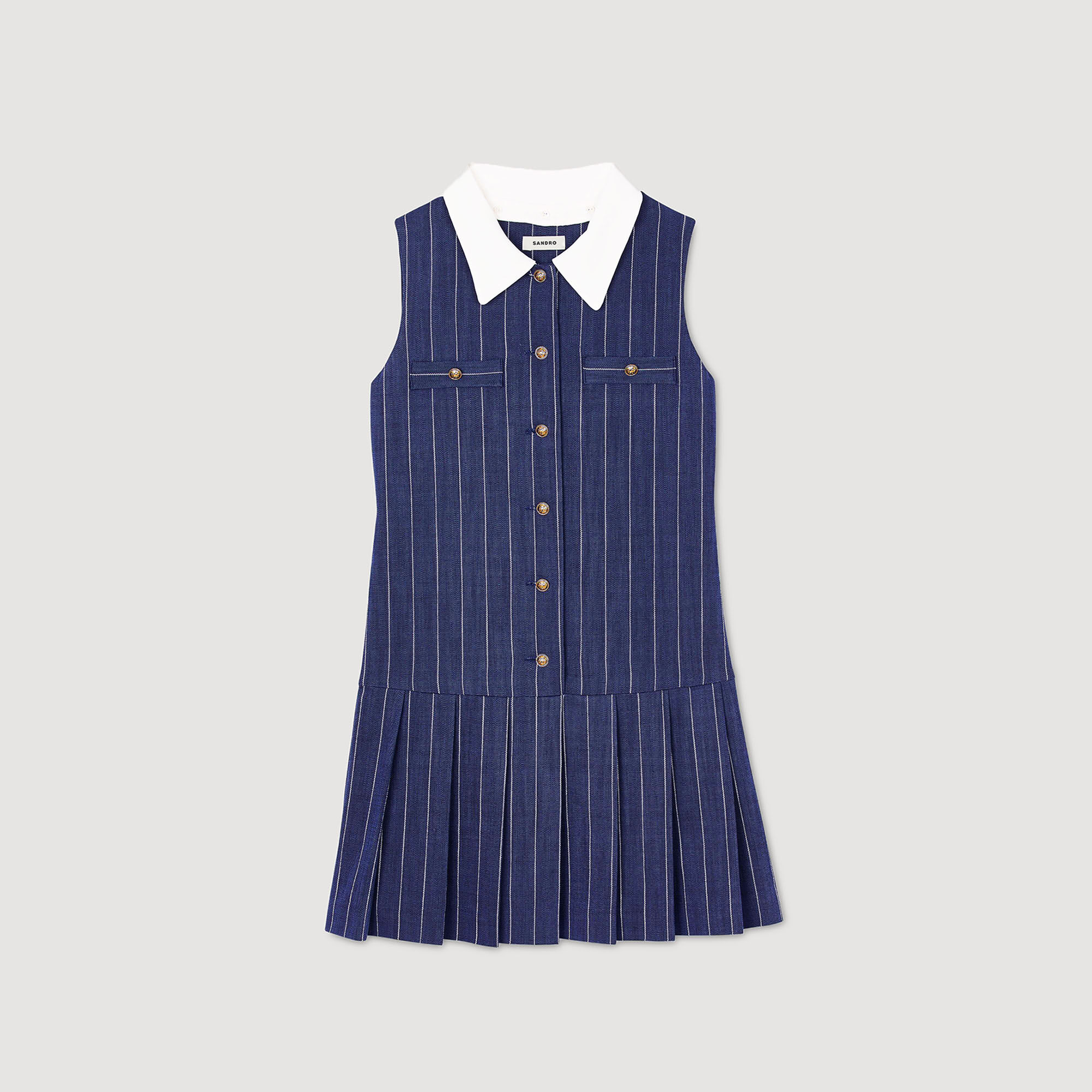 Sleeveless short striped dress with removable contrast collar, decorative buttons, welt pockets at chest and pleated skirt.