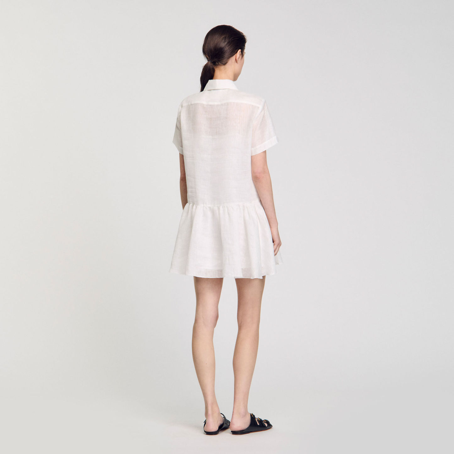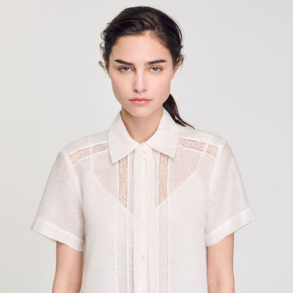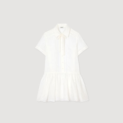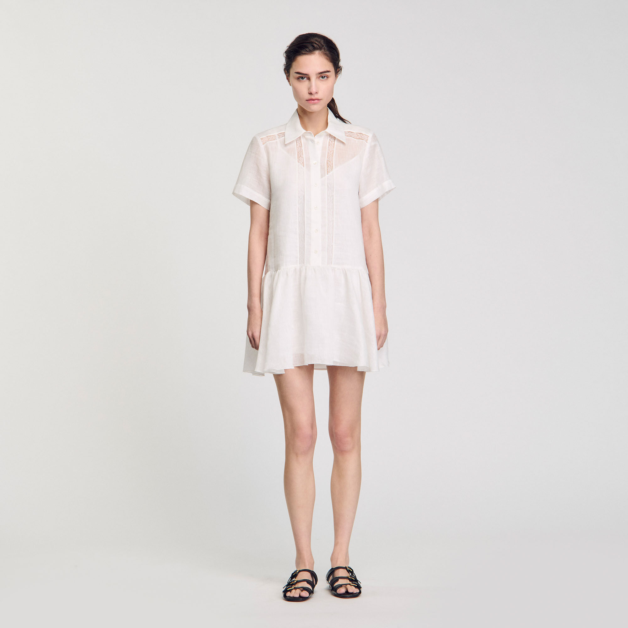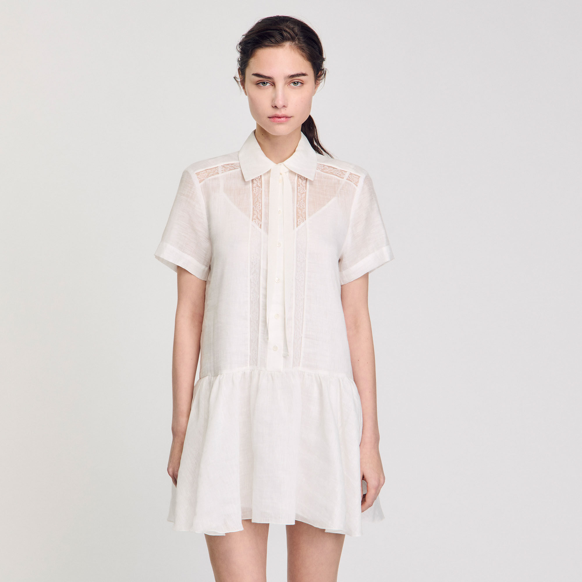 Short dress with a shirt collar, short sleeves, a button fastening and with lace trim.