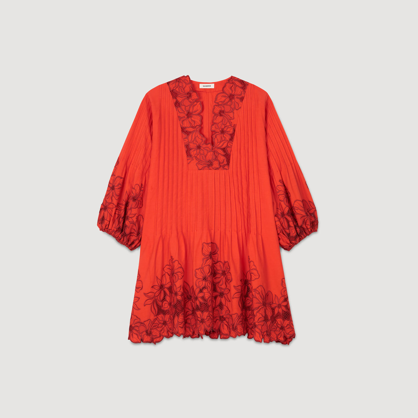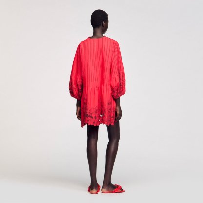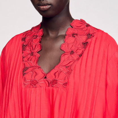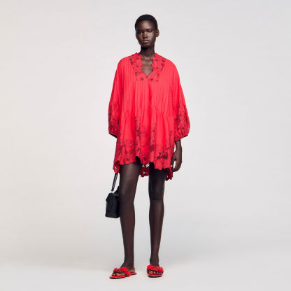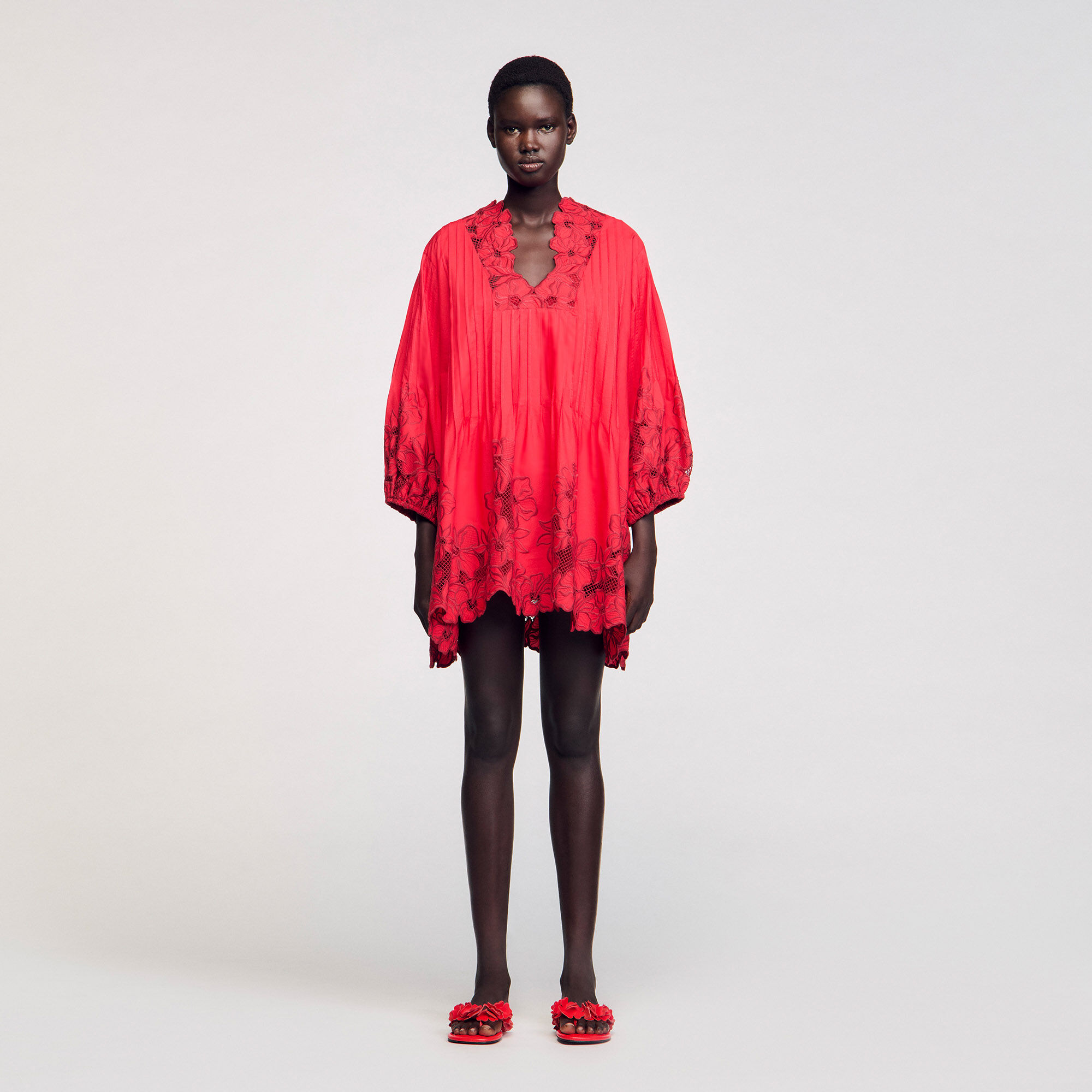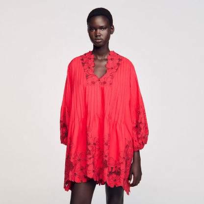 Short, oversized poplin dress with tone-on-tone guipure lace floral details, wrap V-neck and full sleeves with elasticated cuffs.