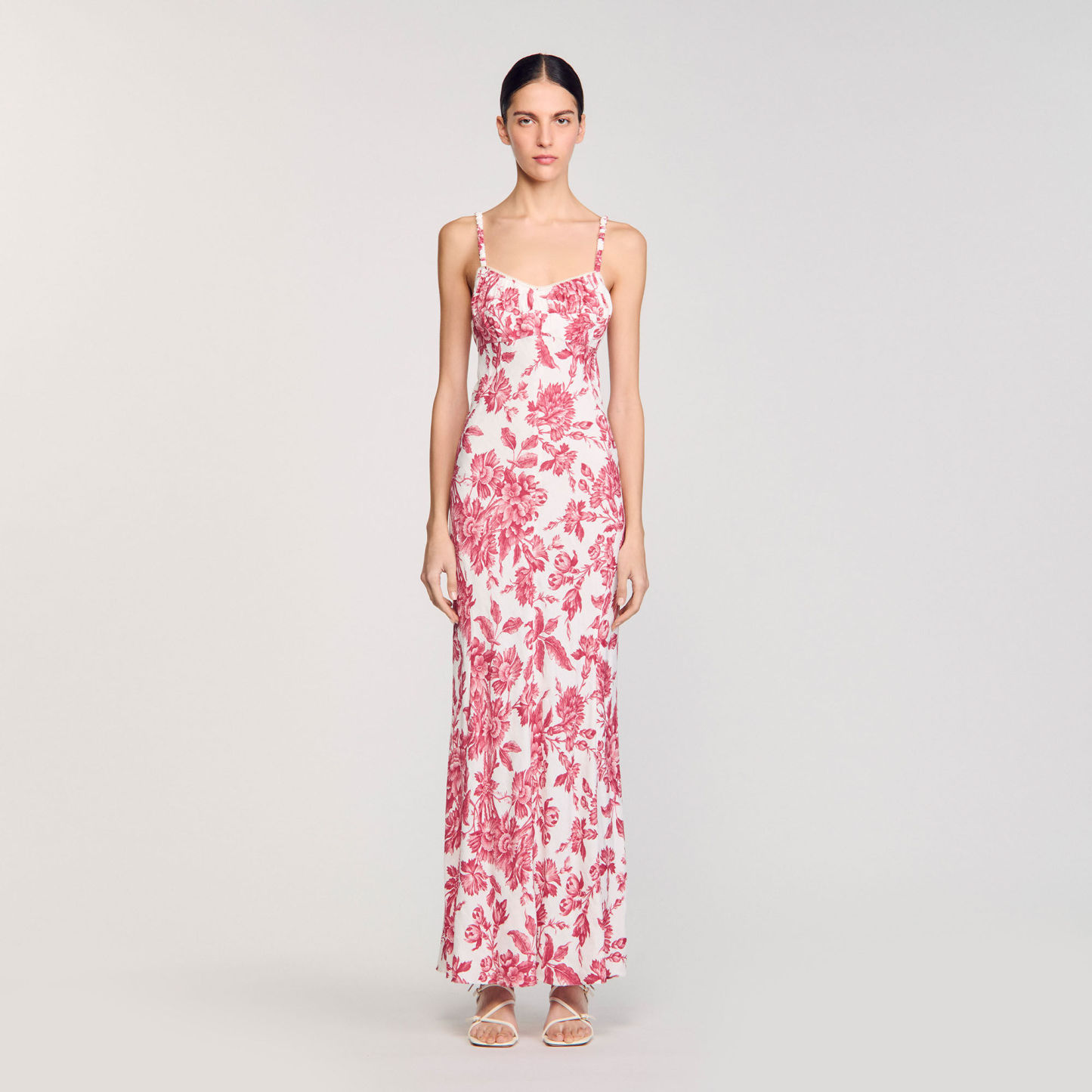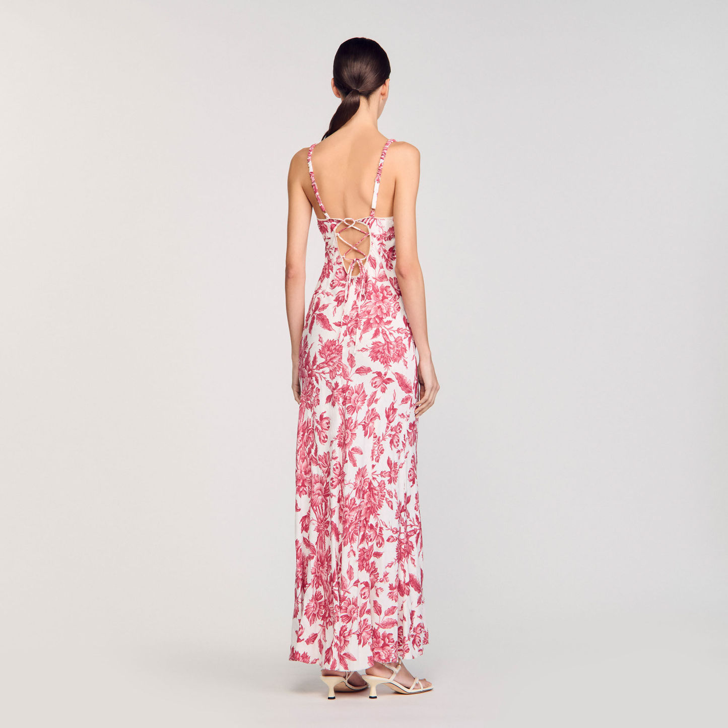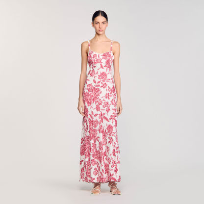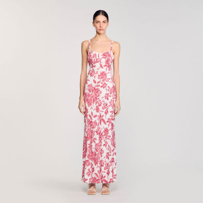 Maxi dress with spaghetti straps, corset-style neckline and lace-up back, with floral motif.