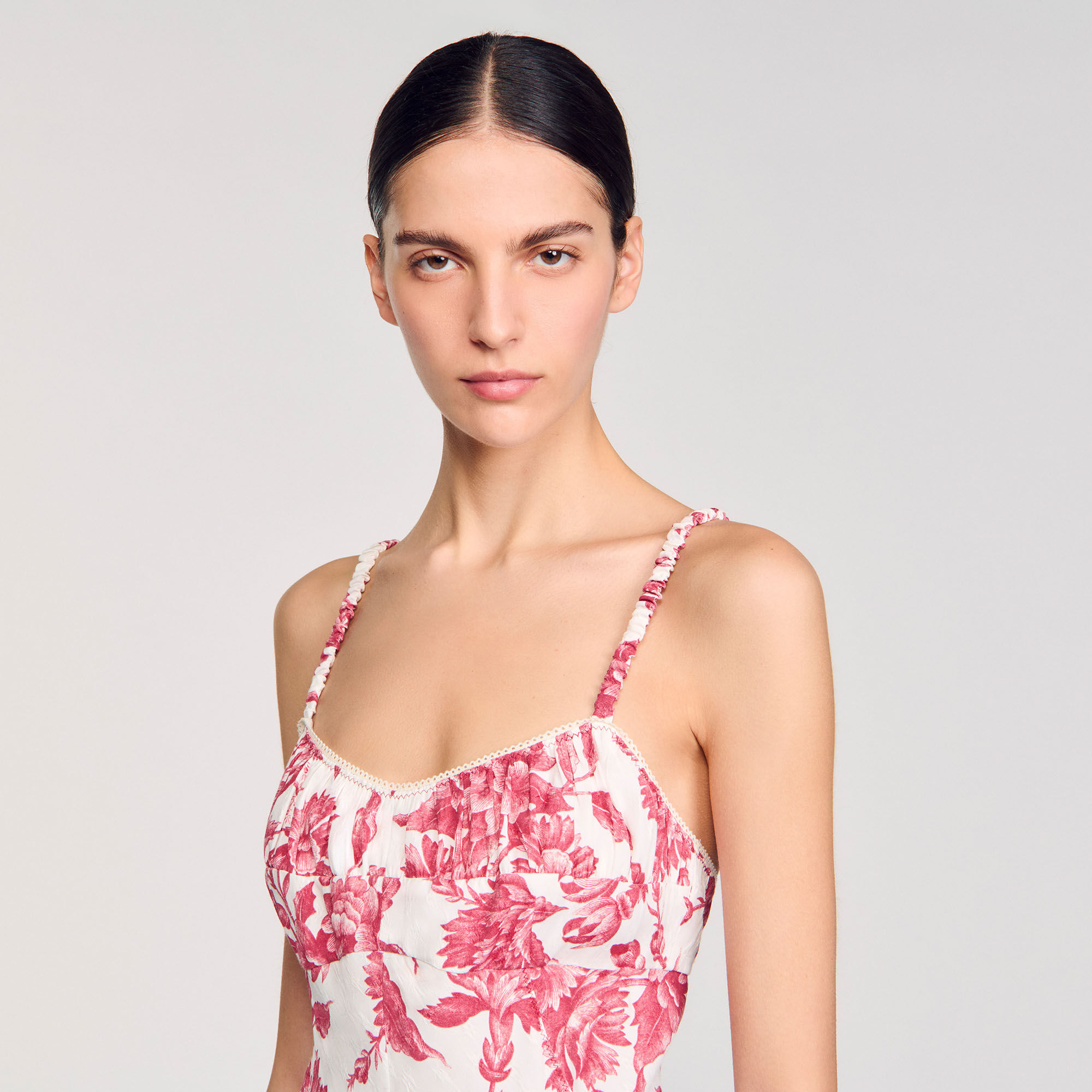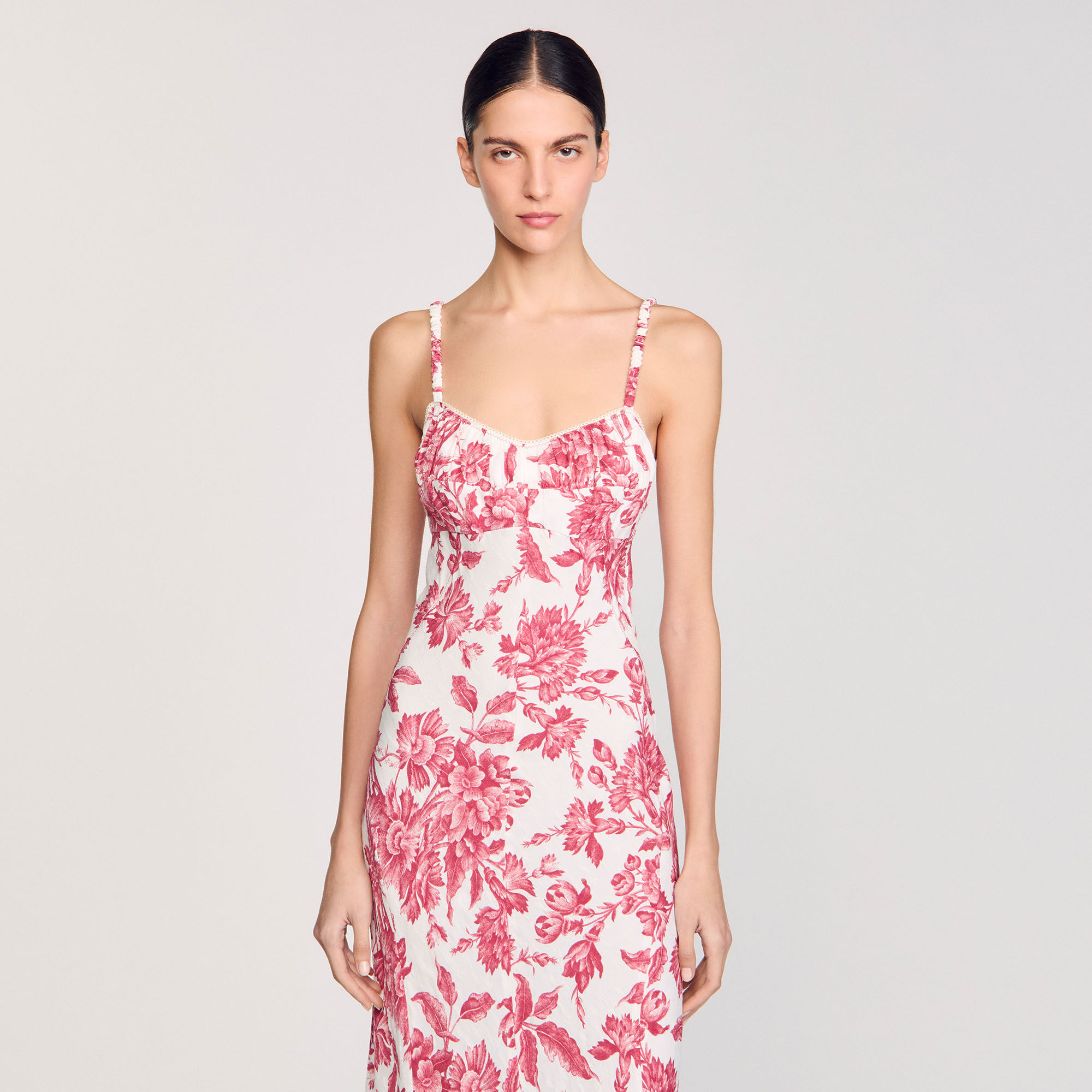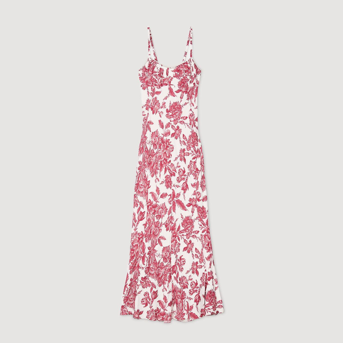 Maxi dress with spaghetti straps, corset-style neckline and lace-up back, with floral motif.