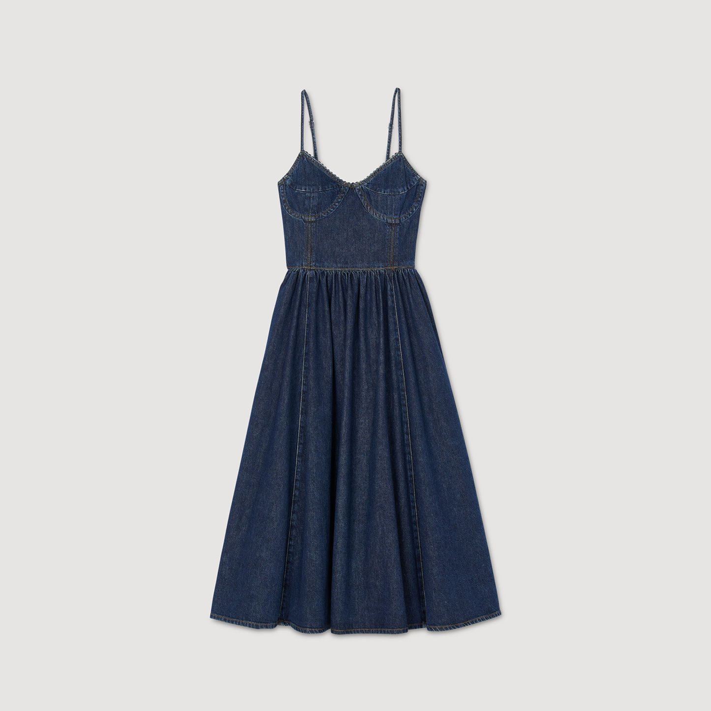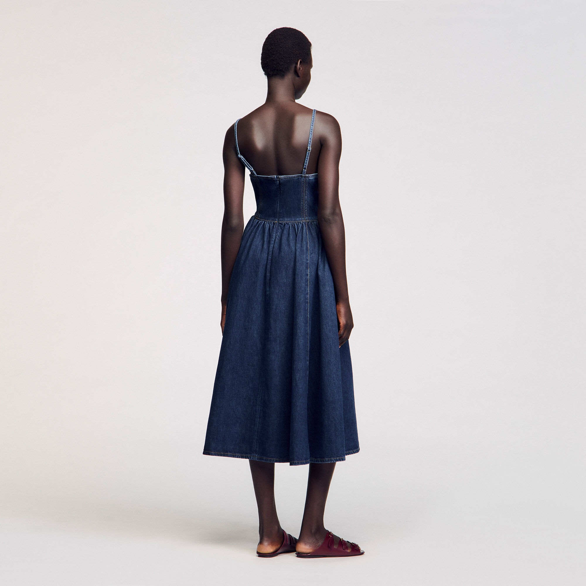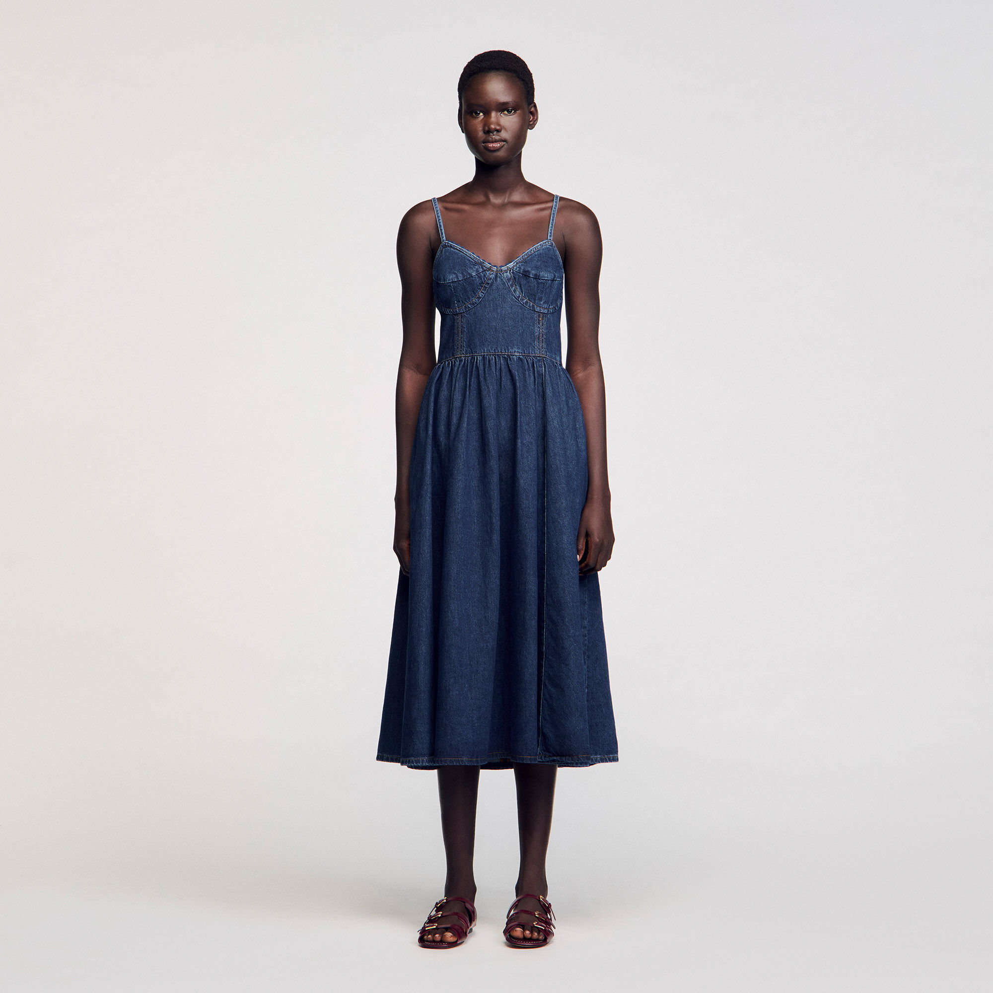 Midi dress in raw denim with thin adjustable straps, featuring a corset-effect top and decorative finishes.