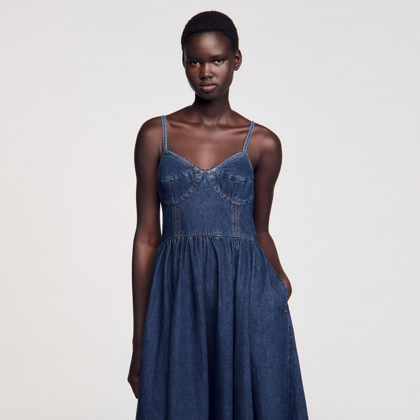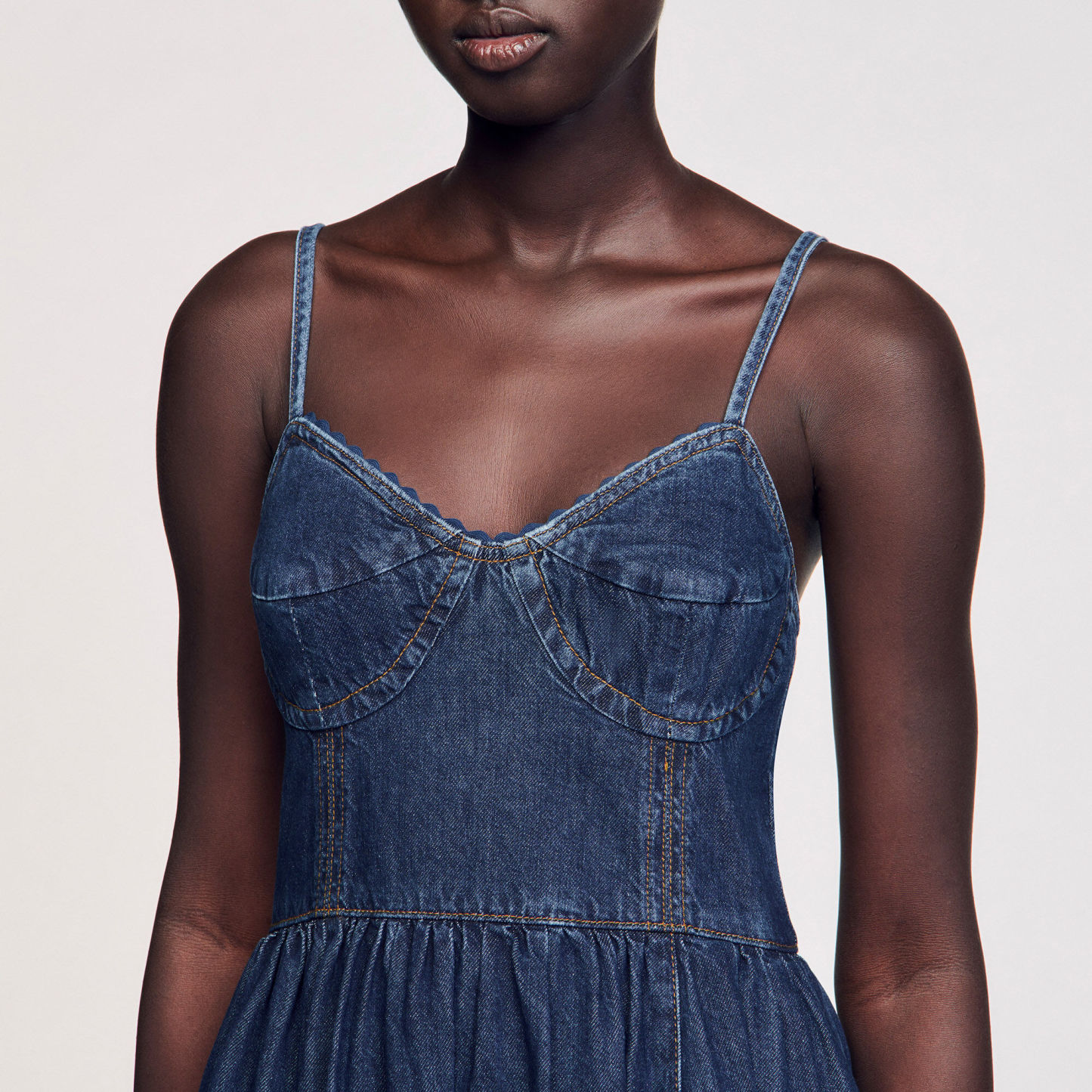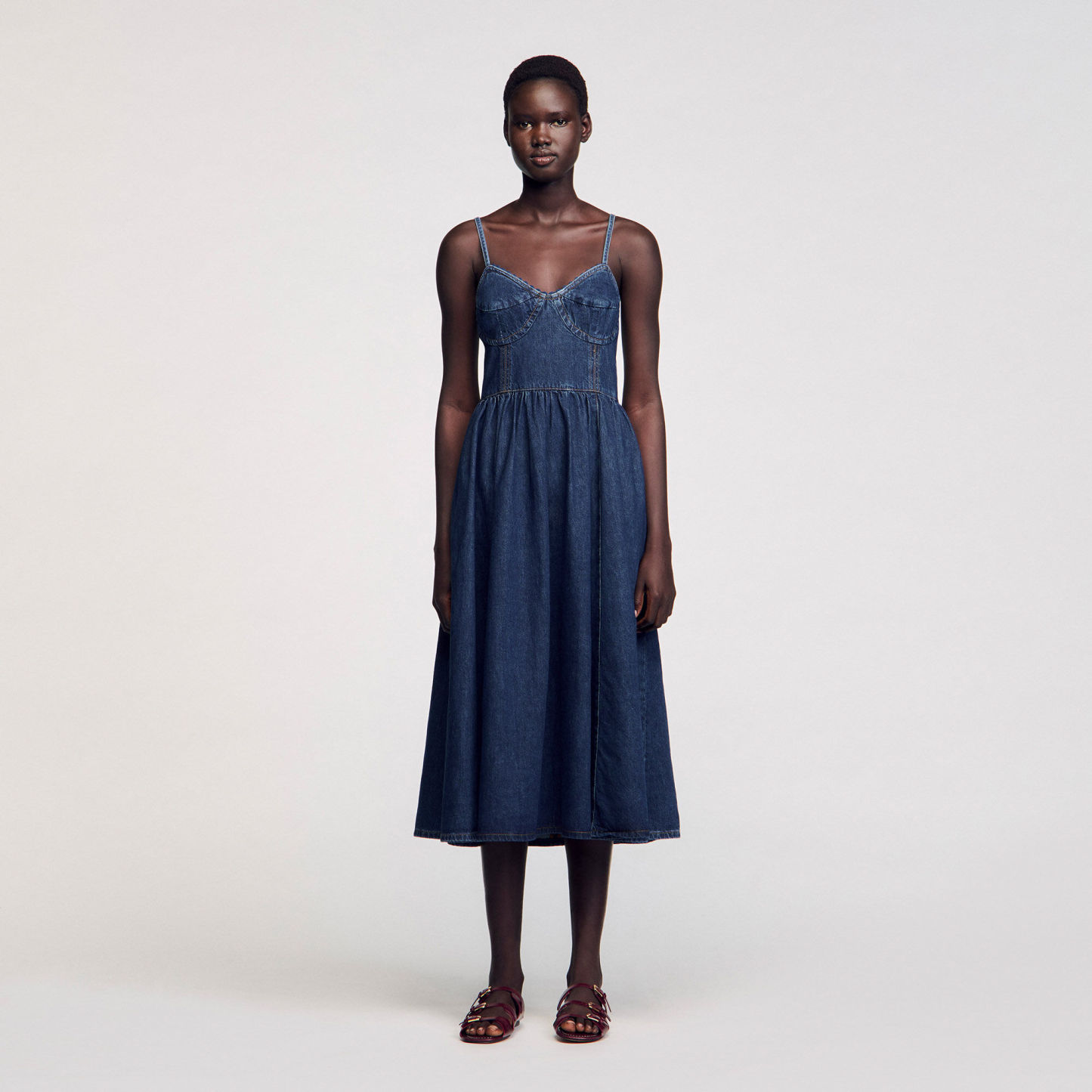Midi dress in raw denim with thin adjustable straps, featuring a corset-effect top and decorative finishes.