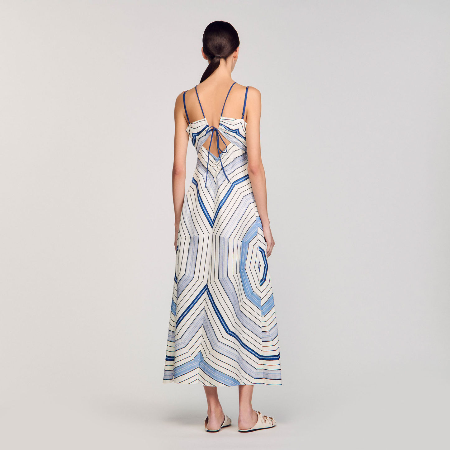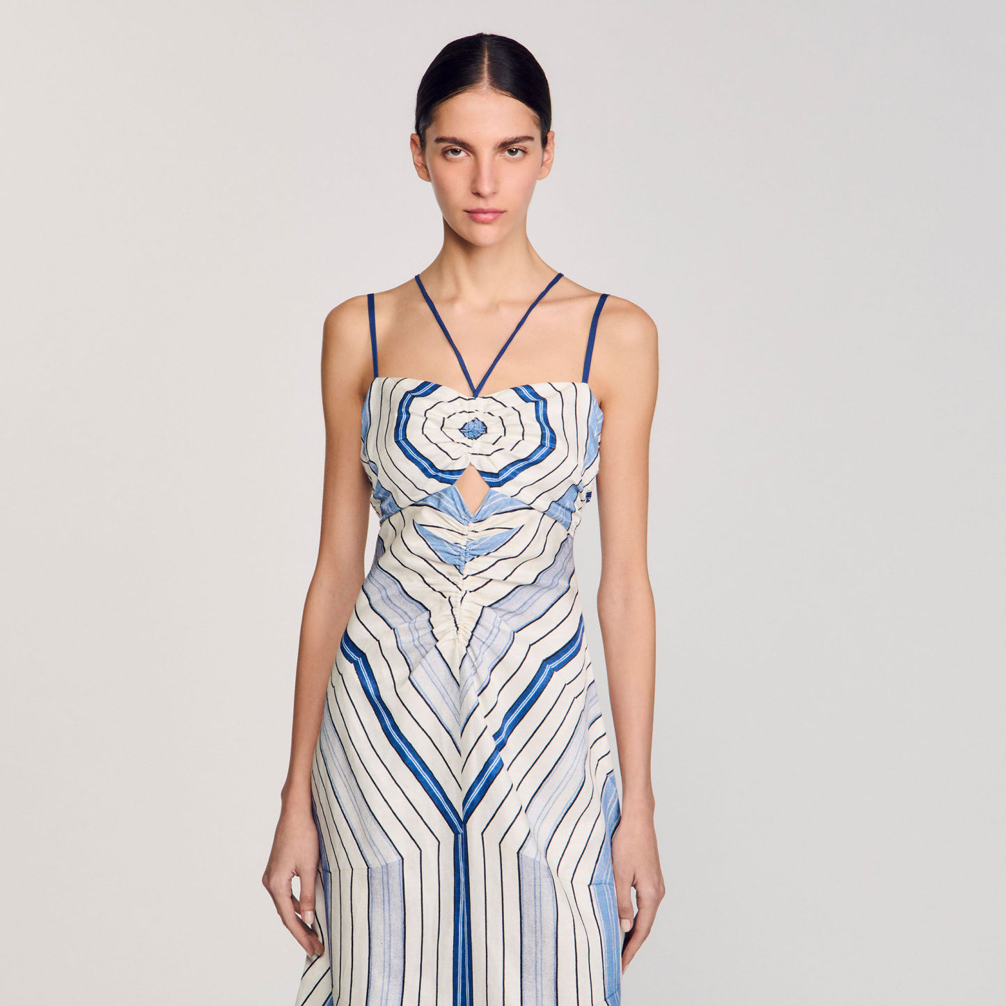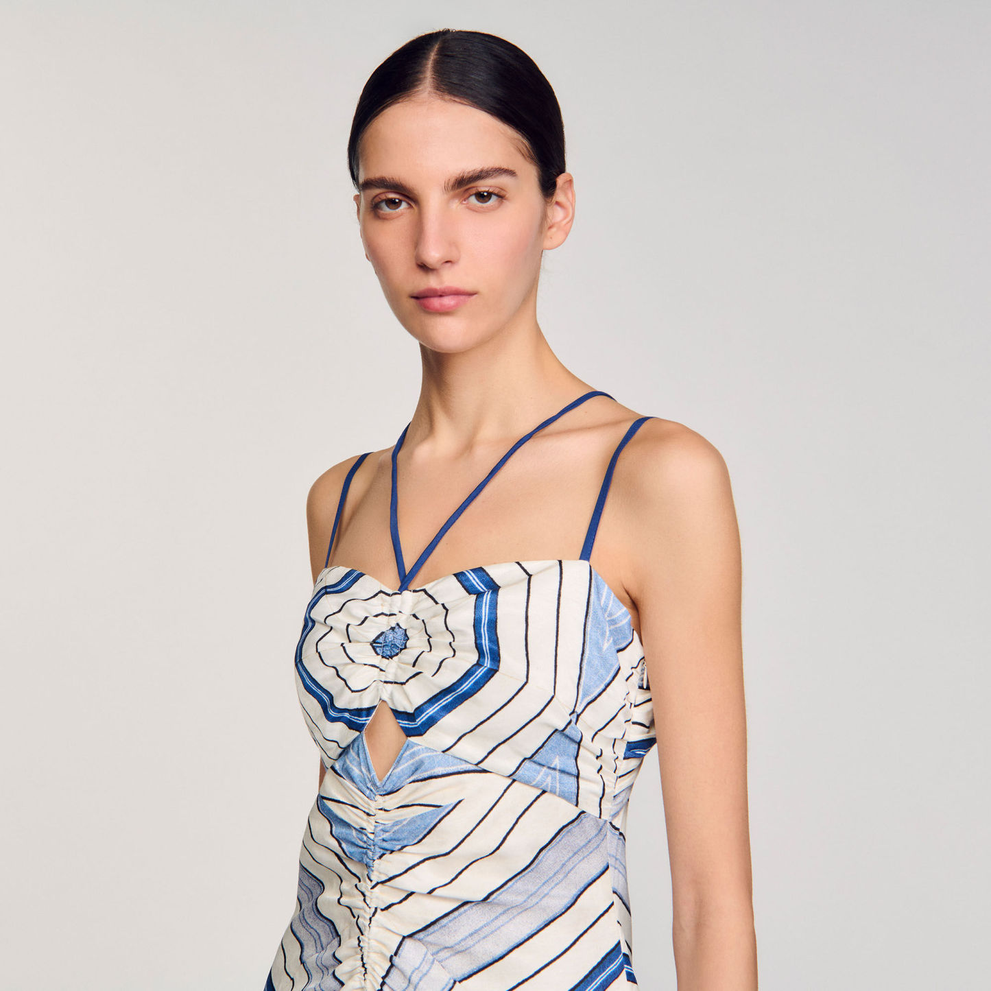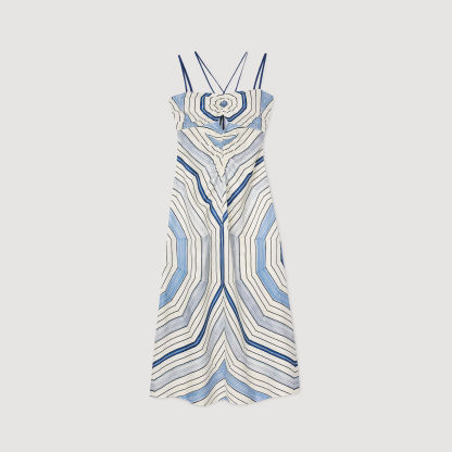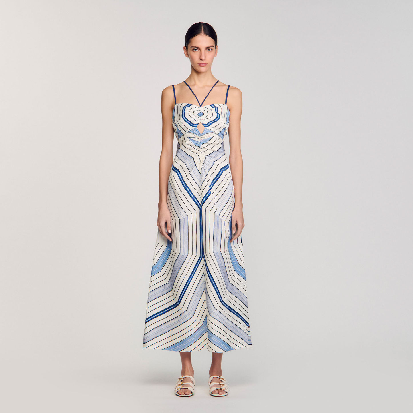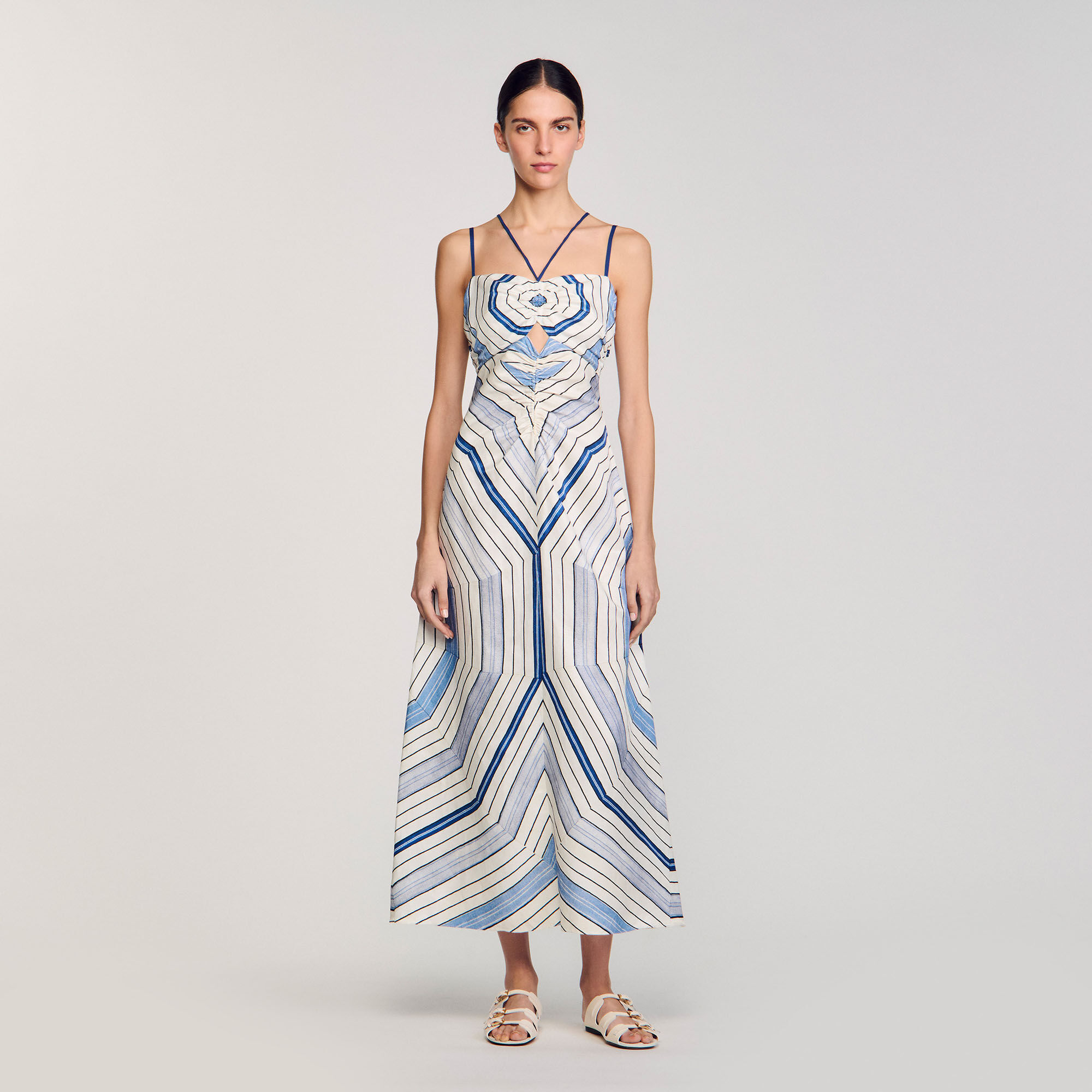 Spiral-motif midi dress with spaghetti straps and ties, ruching and openwork details on the front.