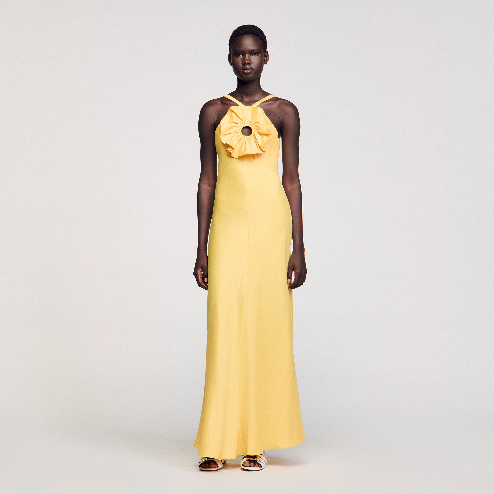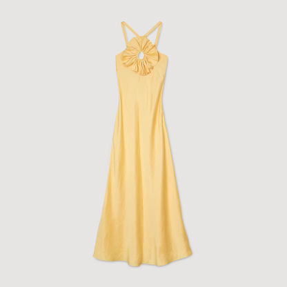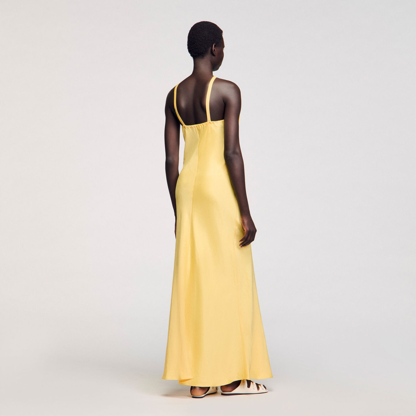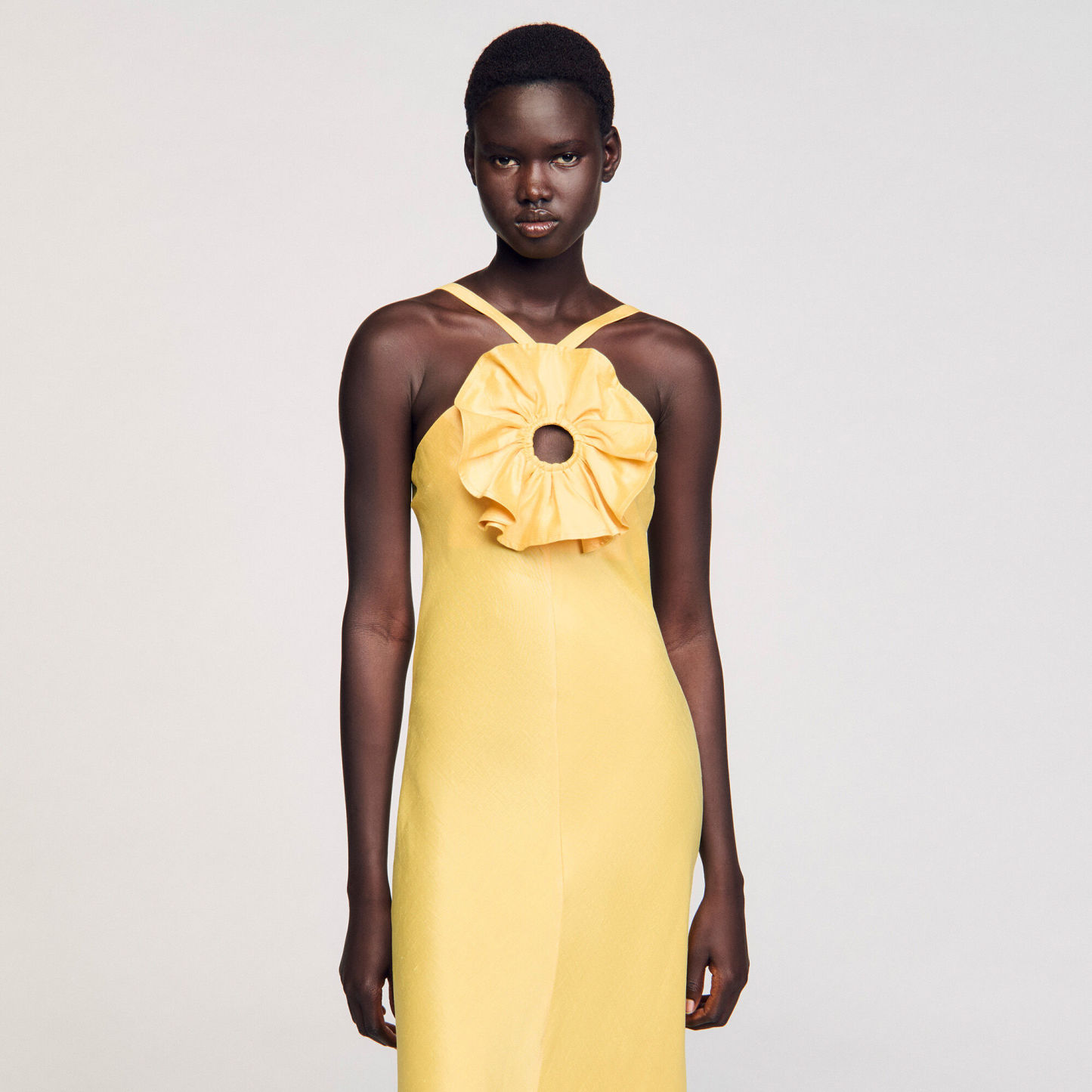 Linen maxi dress with ruffled neckline, flared skirt and adjustable straps.