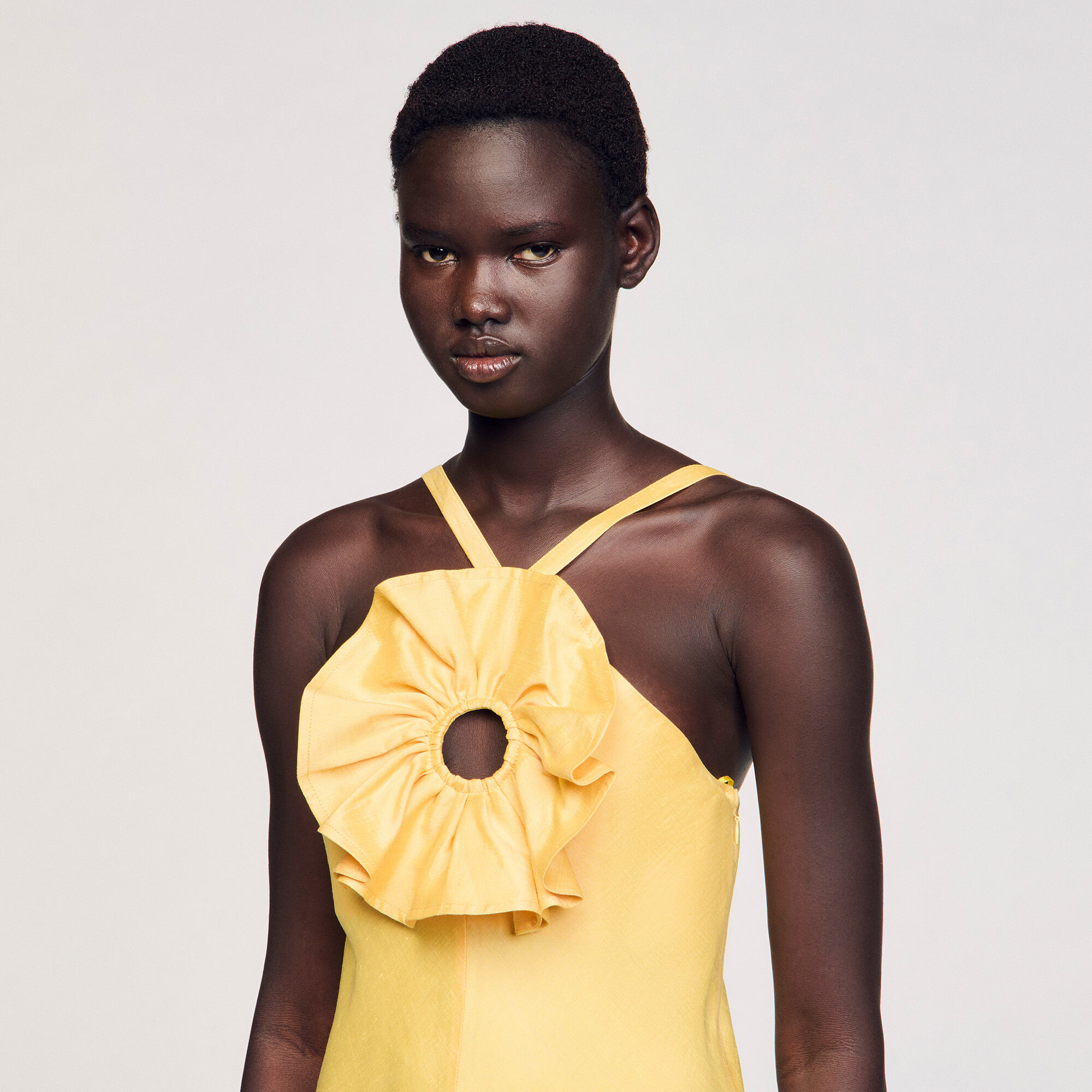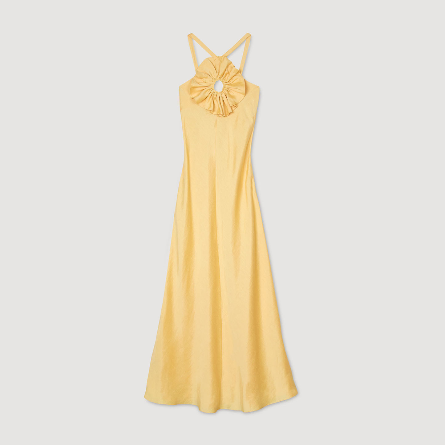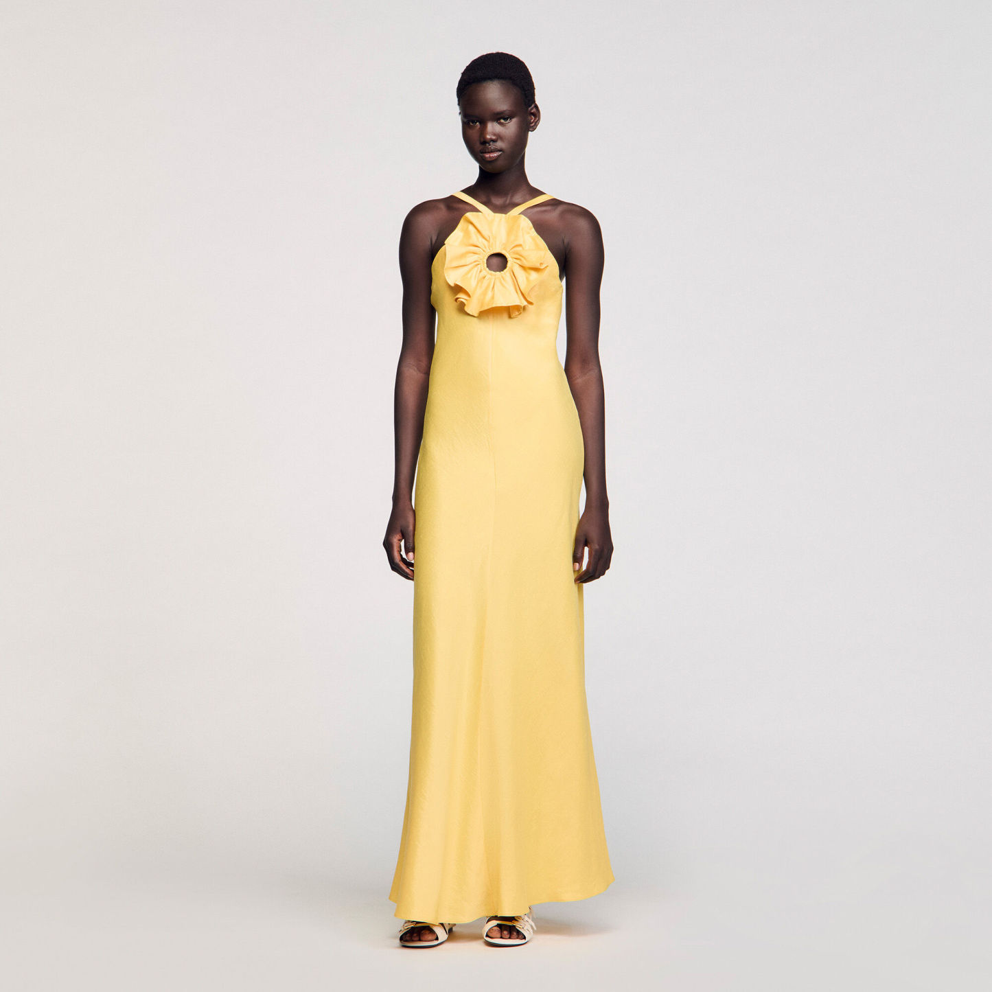 Linen maxi dress with ruffled neckline, flared skirt and adjustable straps.