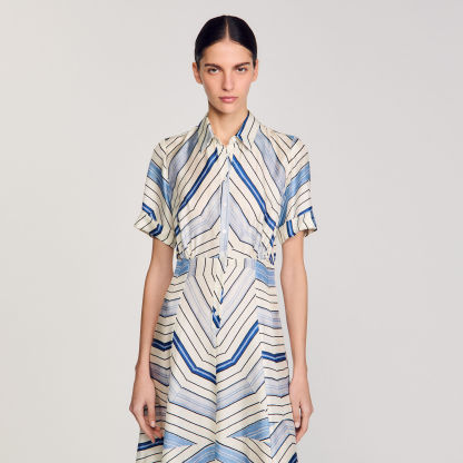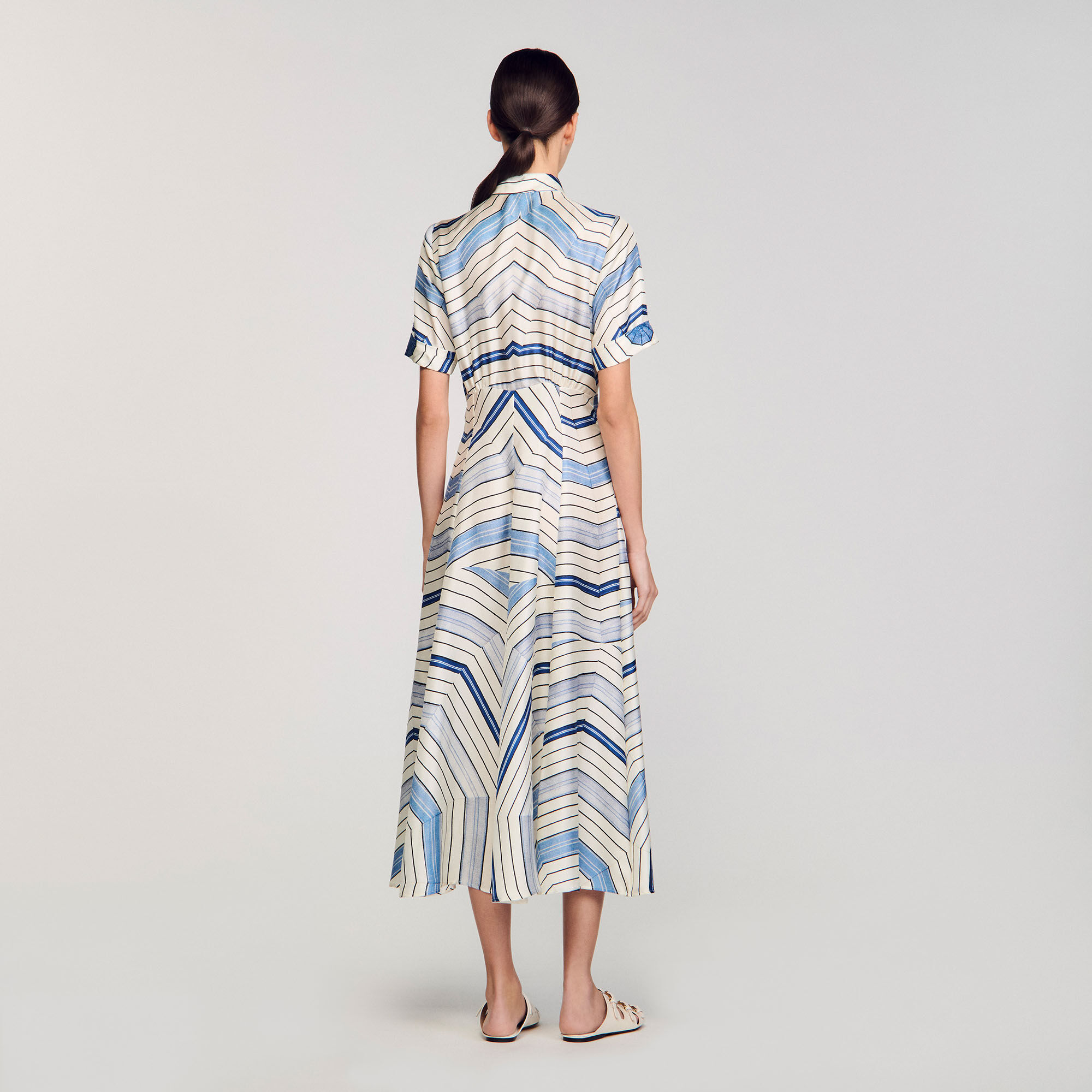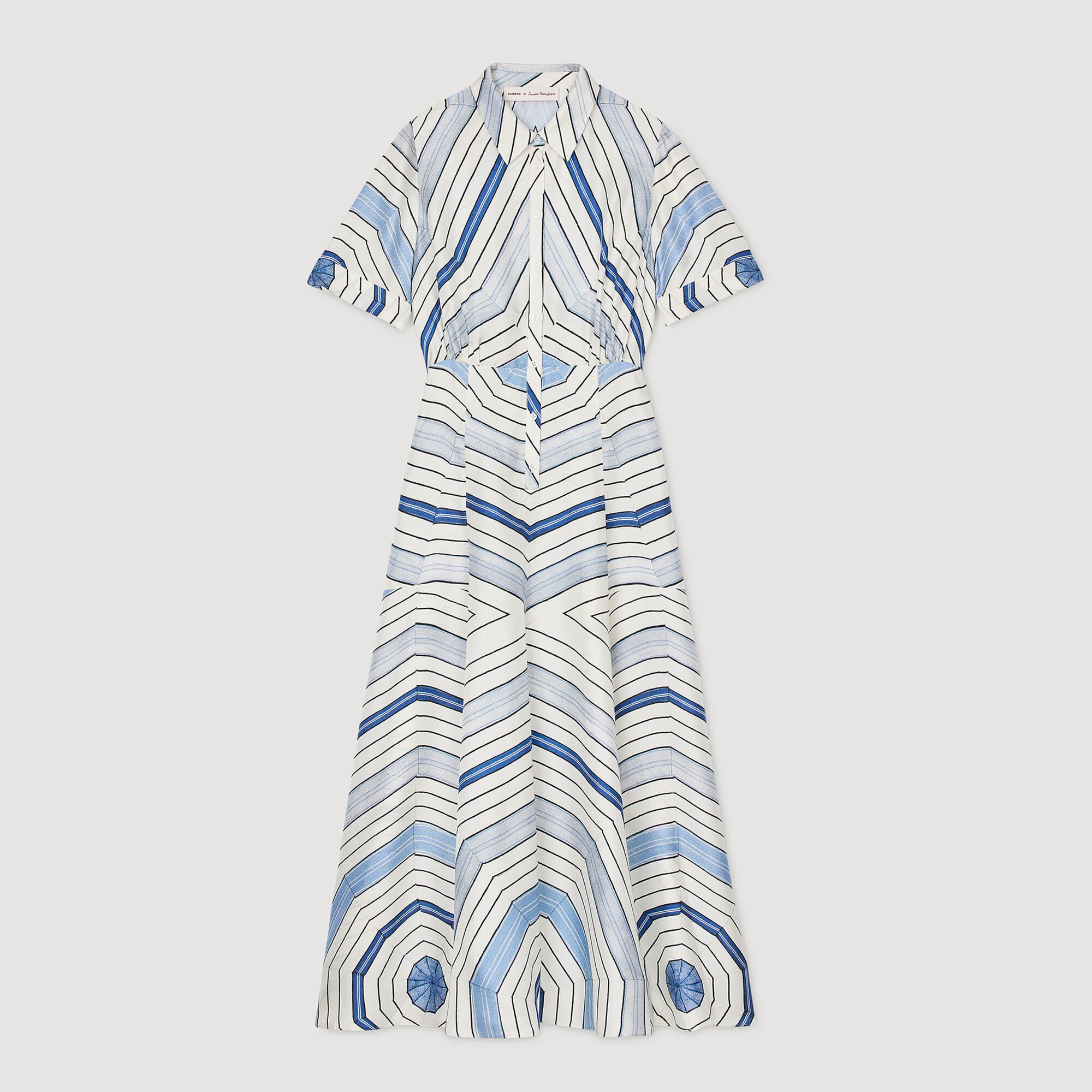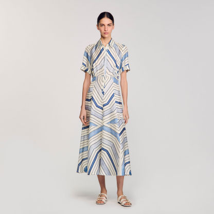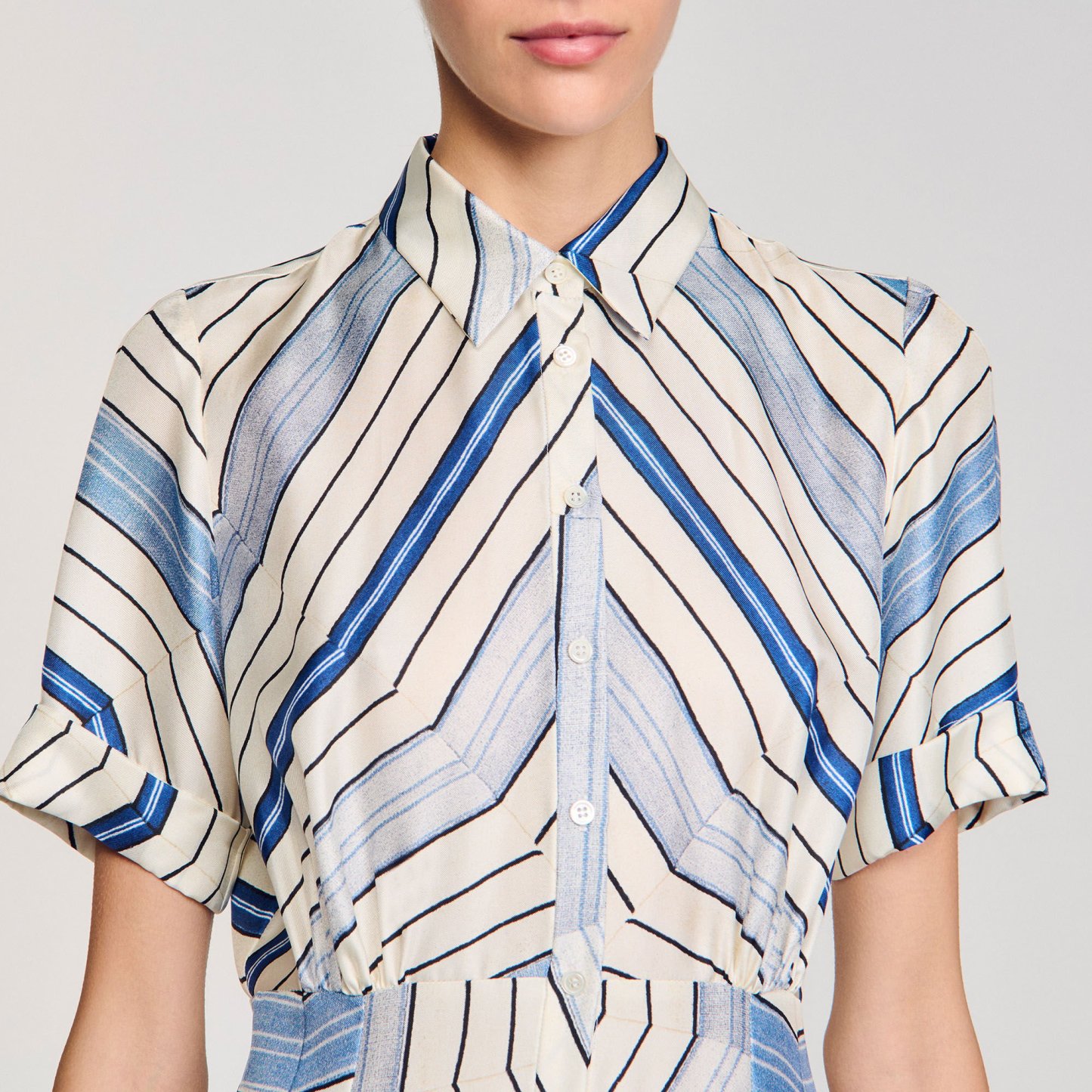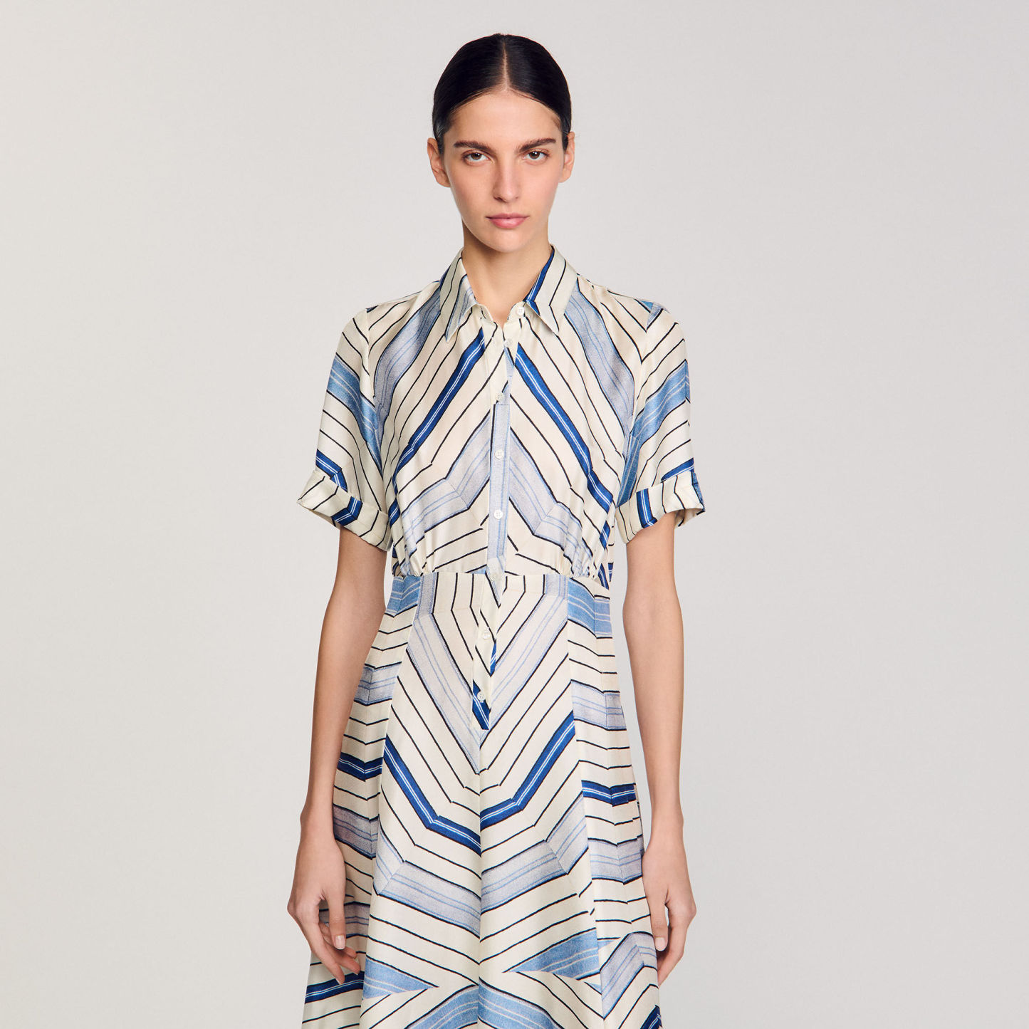 Silk midi shirtdress featuring a spiral print, a button-down collar, short sleeves and a fitted waist.