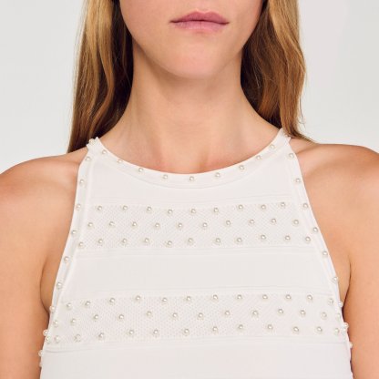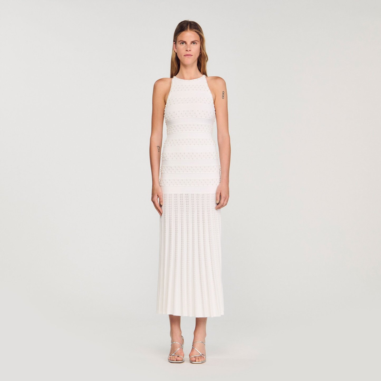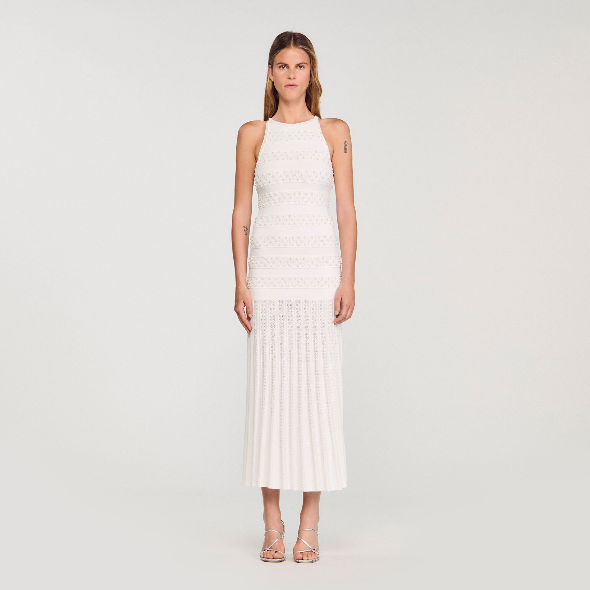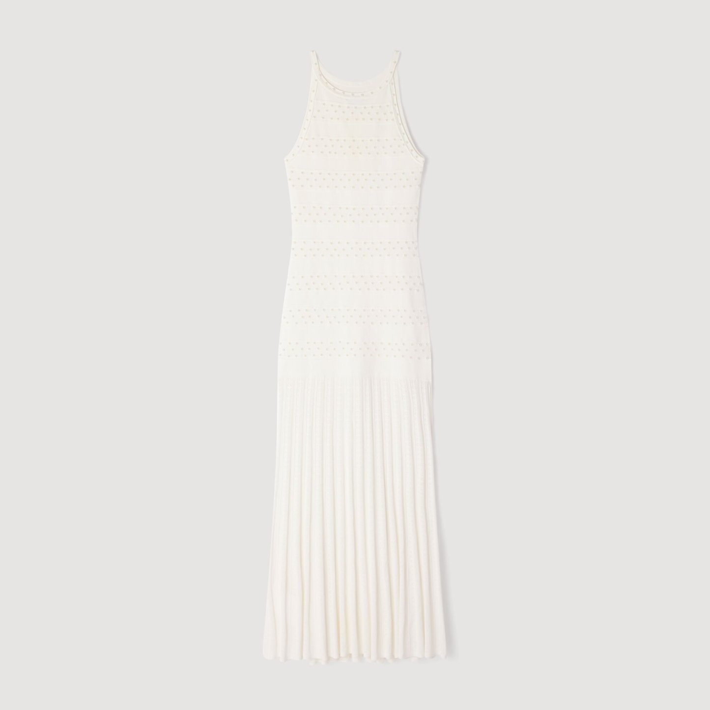 Sleeveless maxi striped and beaded knit dress with a round neck and pearl button fastening.