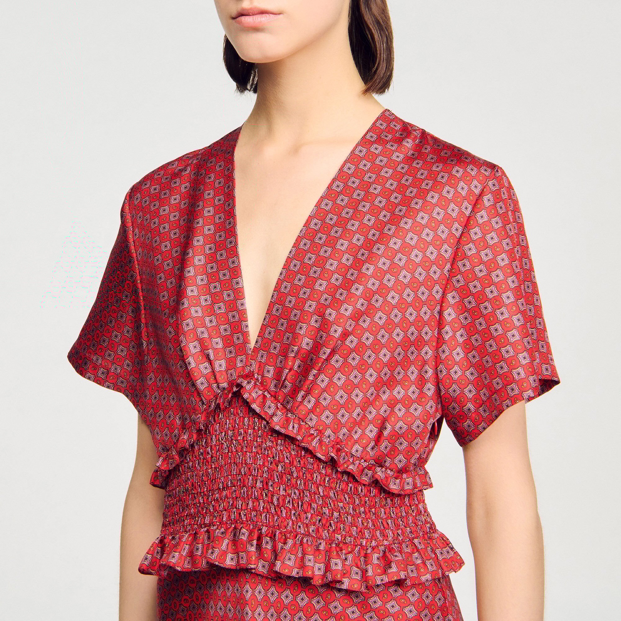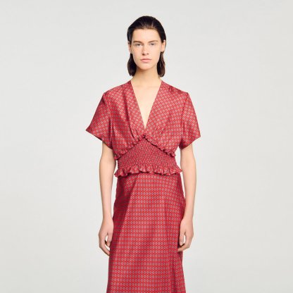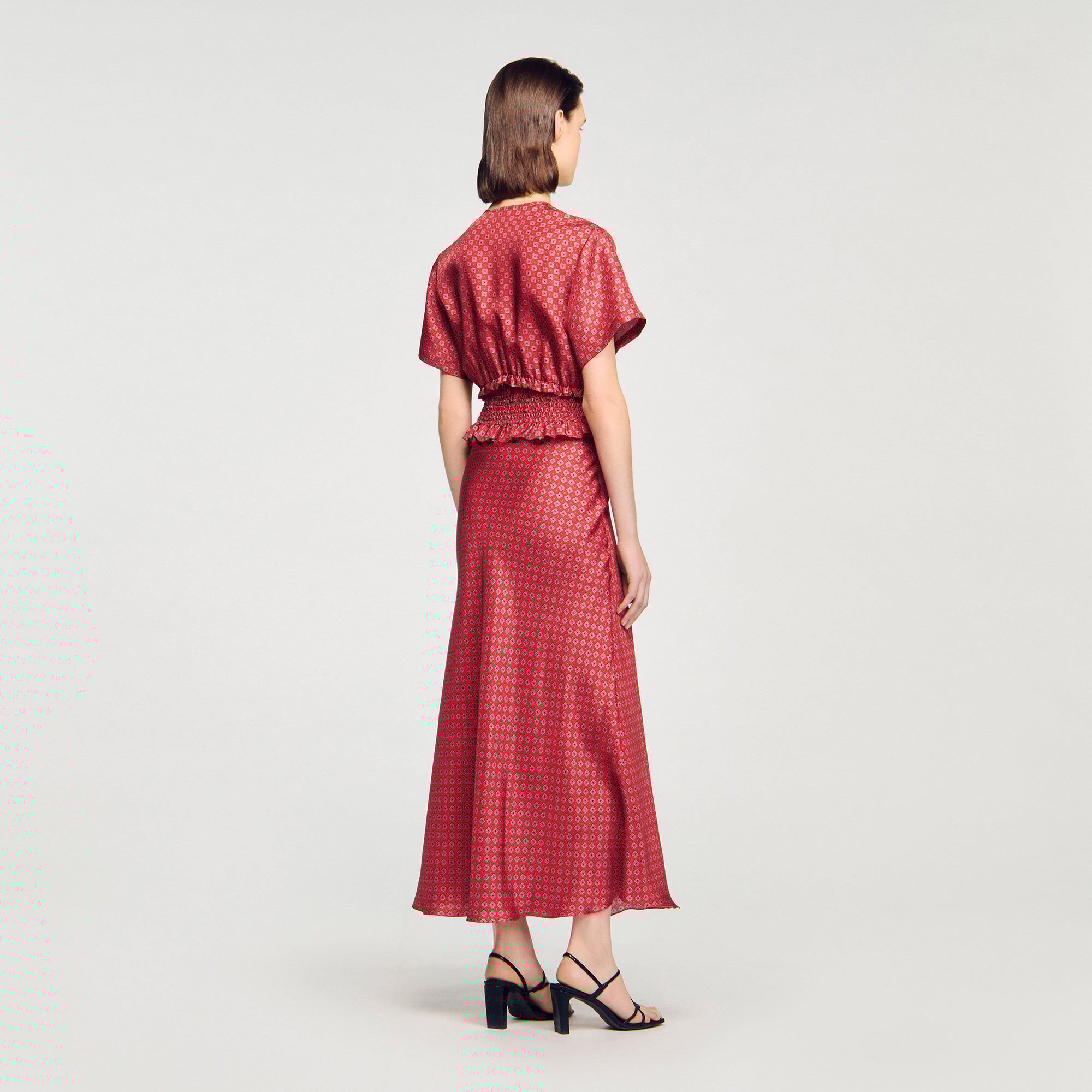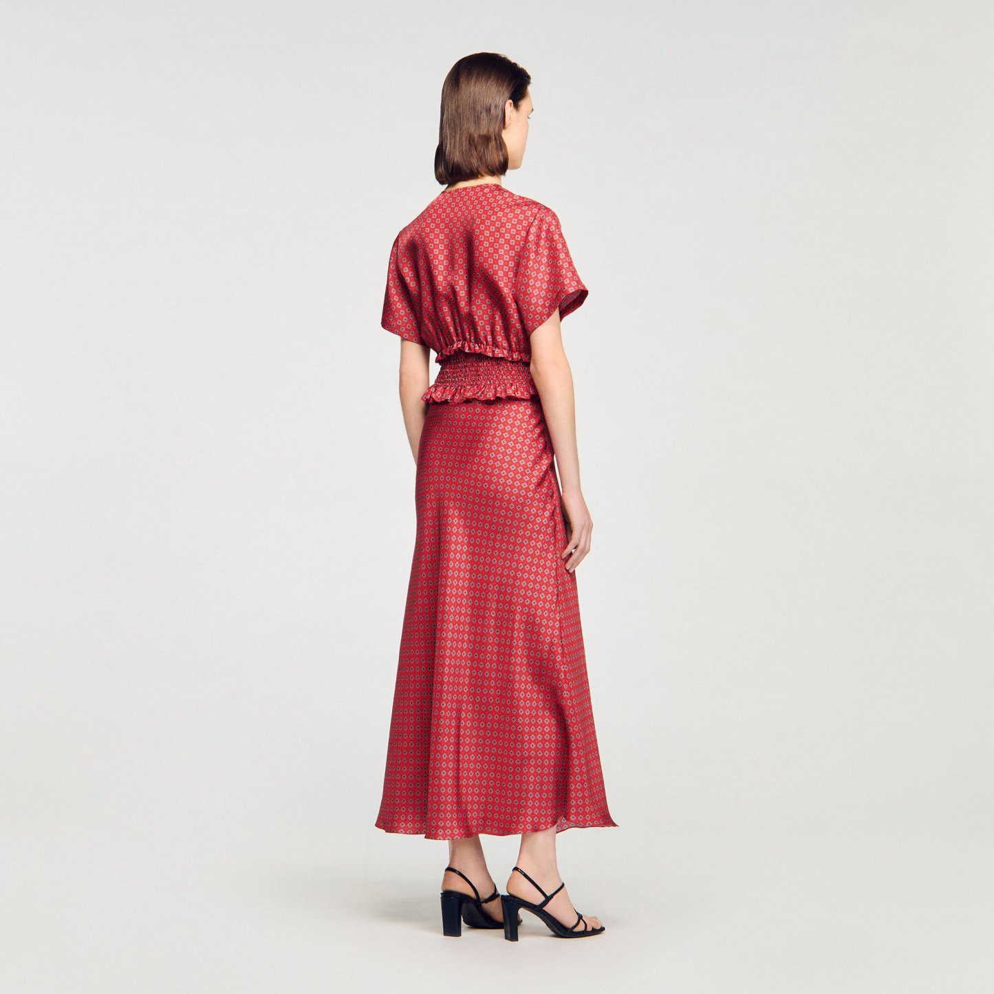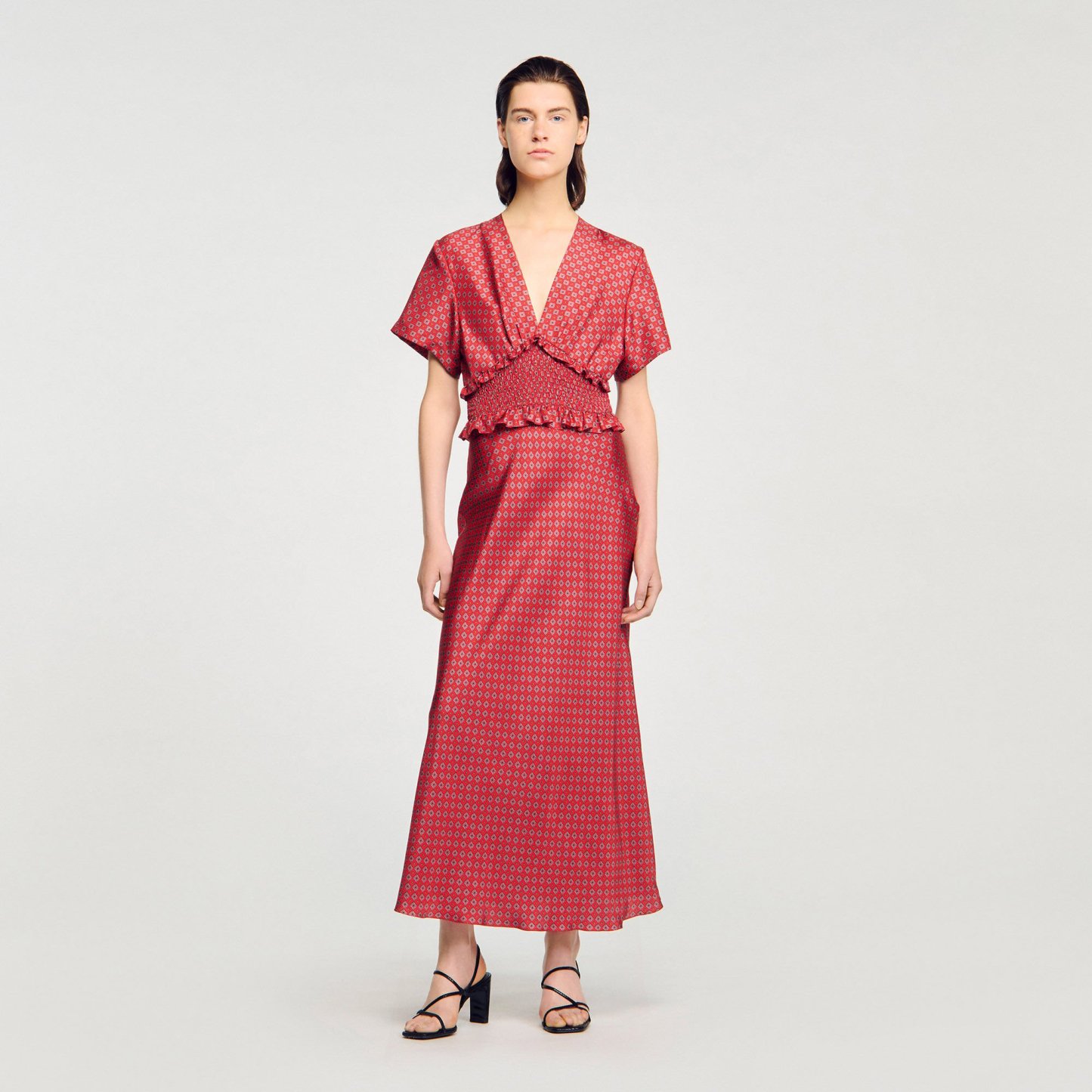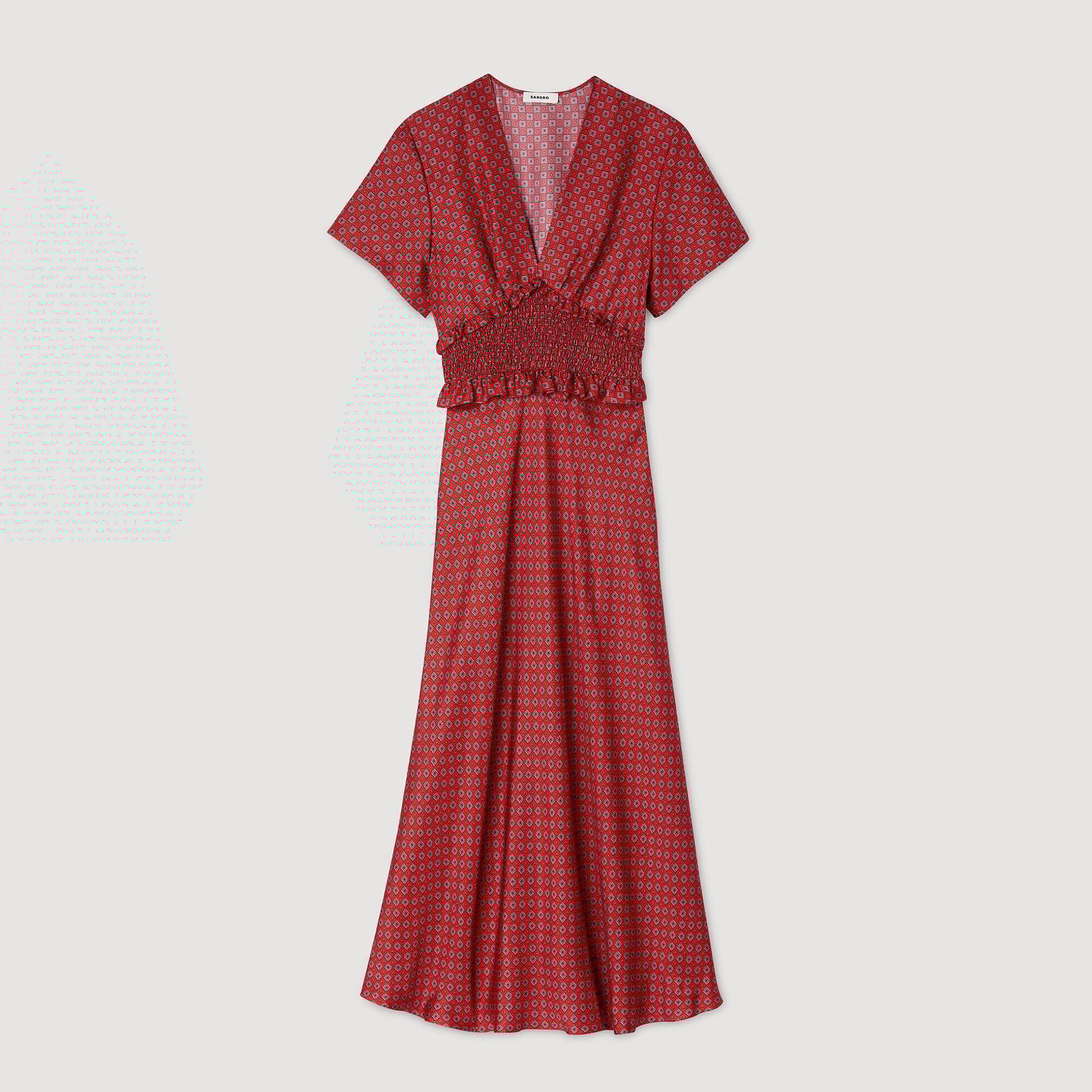 Satin-effect maxi dress adorned with a scarf print, featuring a V-neck, short sleeves, smocked cutouts at the waist and ruffled details under the bust.
